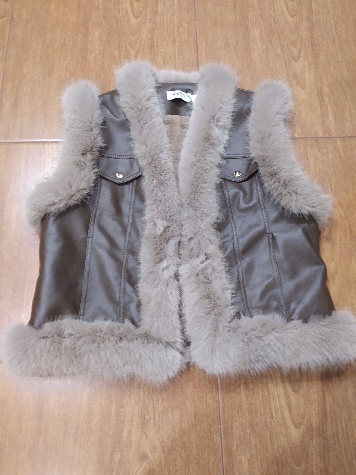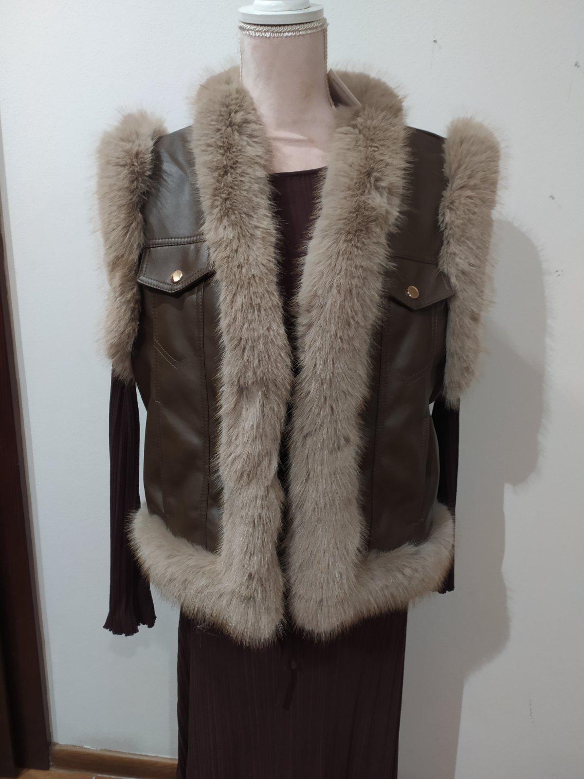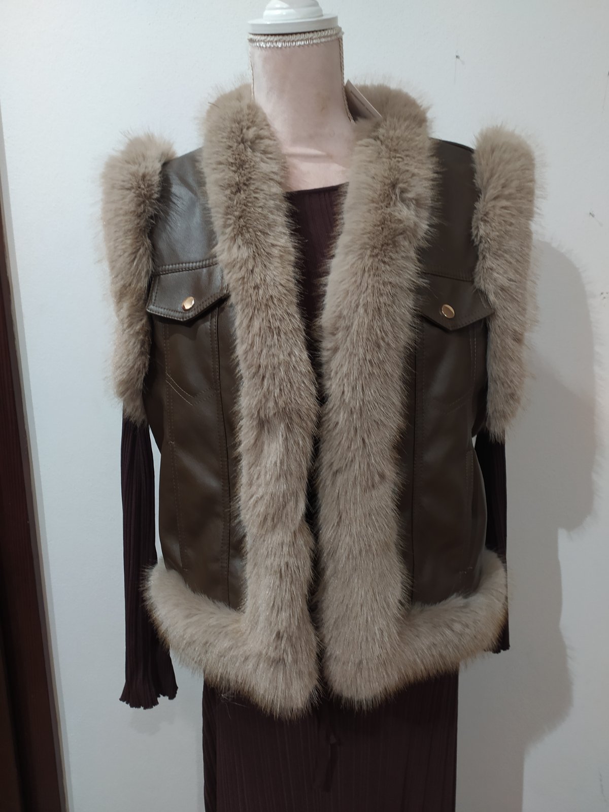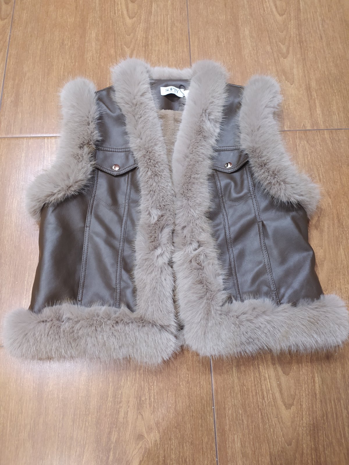 Koženková vesta ,lemovana kožušinou,z vnútra taktiež zateplená kožušinou.Zapinanie na háčiky,vel.M/L,nenosena