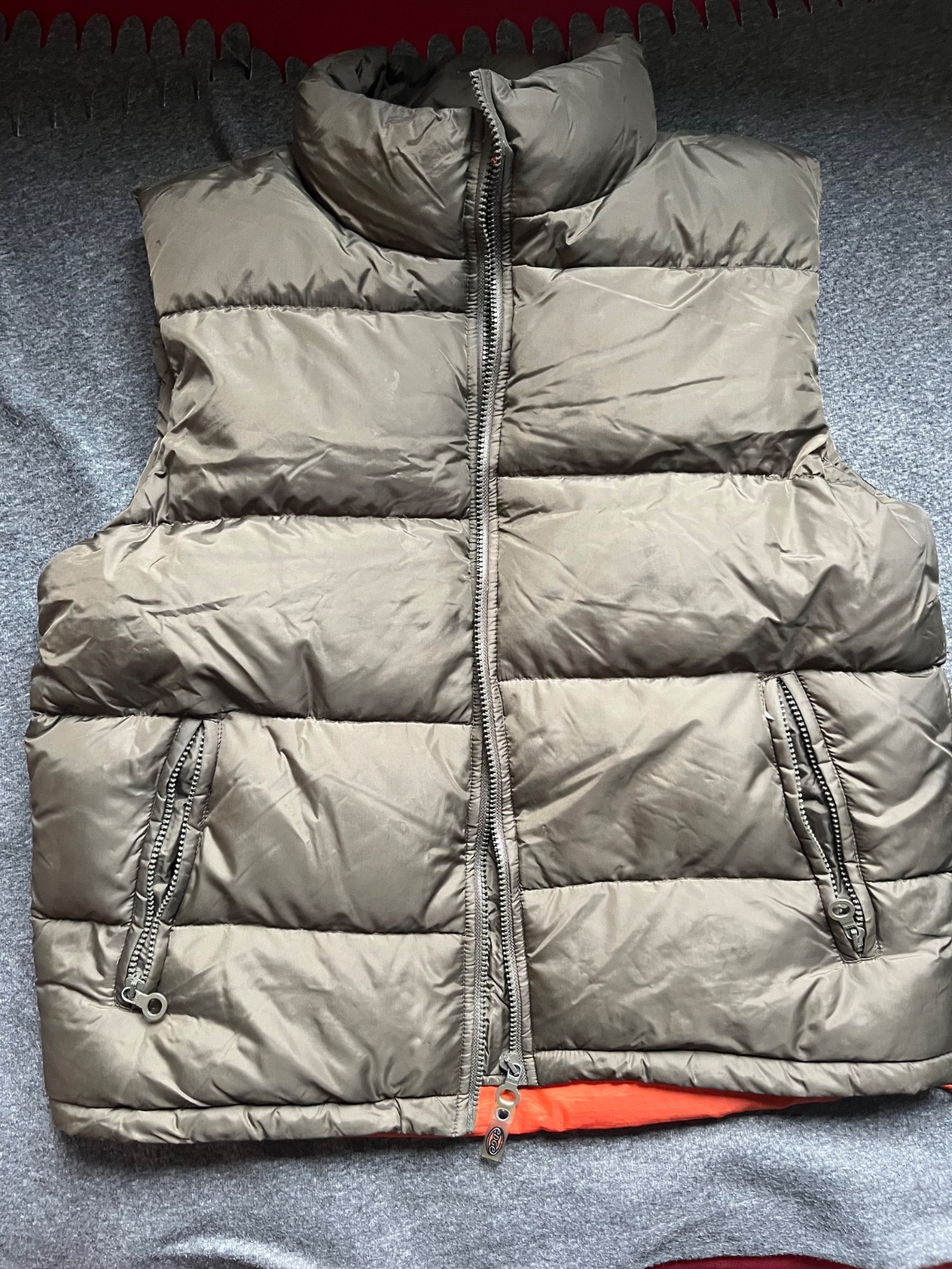 Extra tepla paperova vesta v kaki zelenej s oranzovou podsivkou.Dlzka vesty 67cm, obvod okolo hrude 100cm, na boku dve vrecla na zips a vo vnutri dve male vrecka.