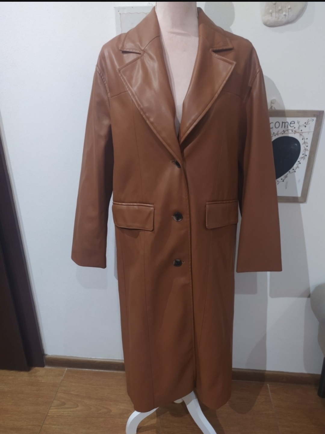Dlhý koženkovy trenčkot ,v top stave,zdobený kozusinovym golierom-neda sacodoponut.Doplneny opaskom Dl 114,šírka 52*2,rukáv od krku 72 cm,v