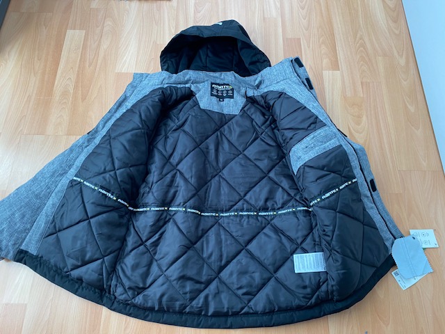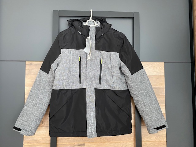 Zimná bundička - zapínanie na zips + suchý zips, z prednej strany má 4 vrecká + 1 vnútorné vrecko, rukávy sa dajú stiahnuť (upraviť), kapucka je našitá na pevno, reflexné prvky. Bunda je nová, s visačkou, PC 59,99 Eur.