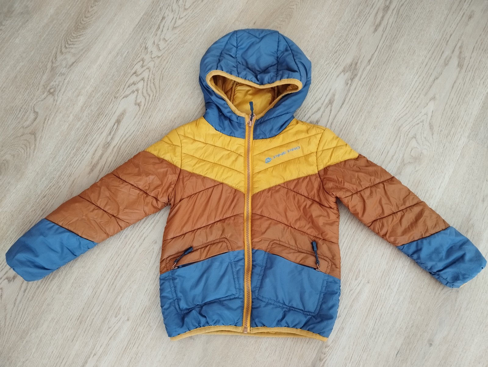 Veľkosť 104. Podšitá dekovinou. Kapucňa na pevno. Zips na bundičke funguje.