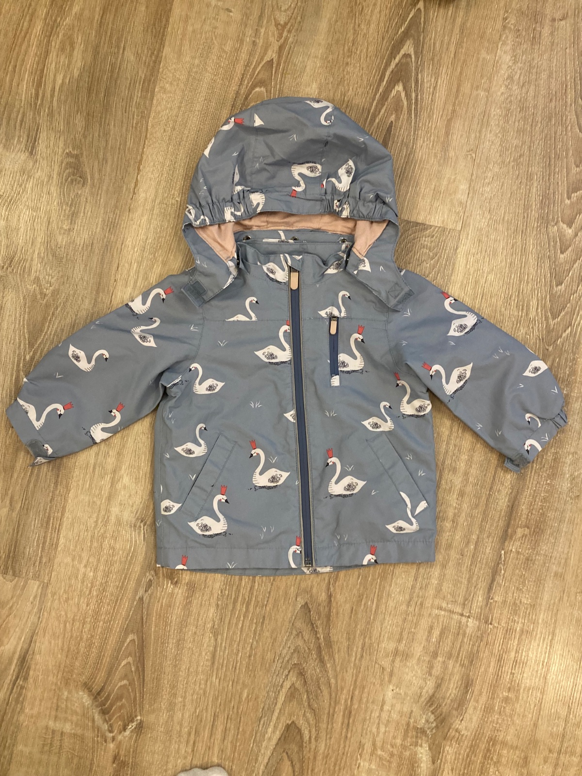Prechodnä bundičks vo veľmi dobrom stave, veľkosť 74/80 reflexné pasy na chrbte, odnímateľná kapucňa, farba bledomodrá, ale s odtieňom do bledosivej.