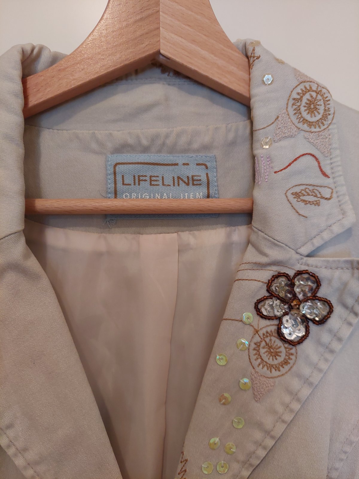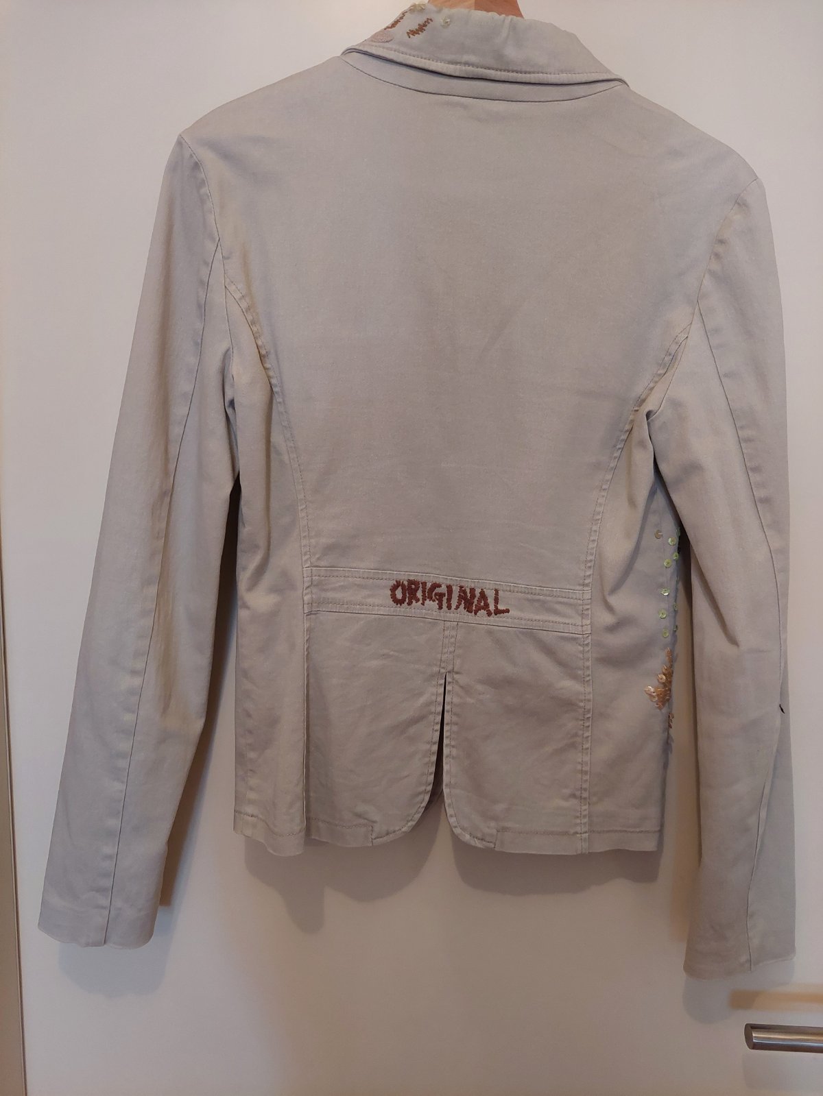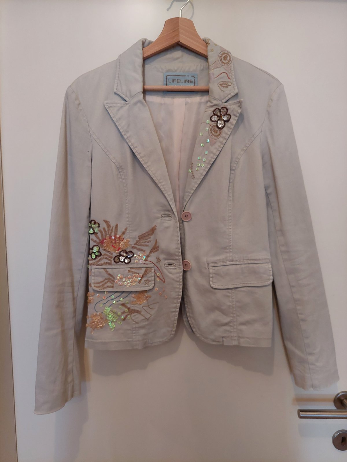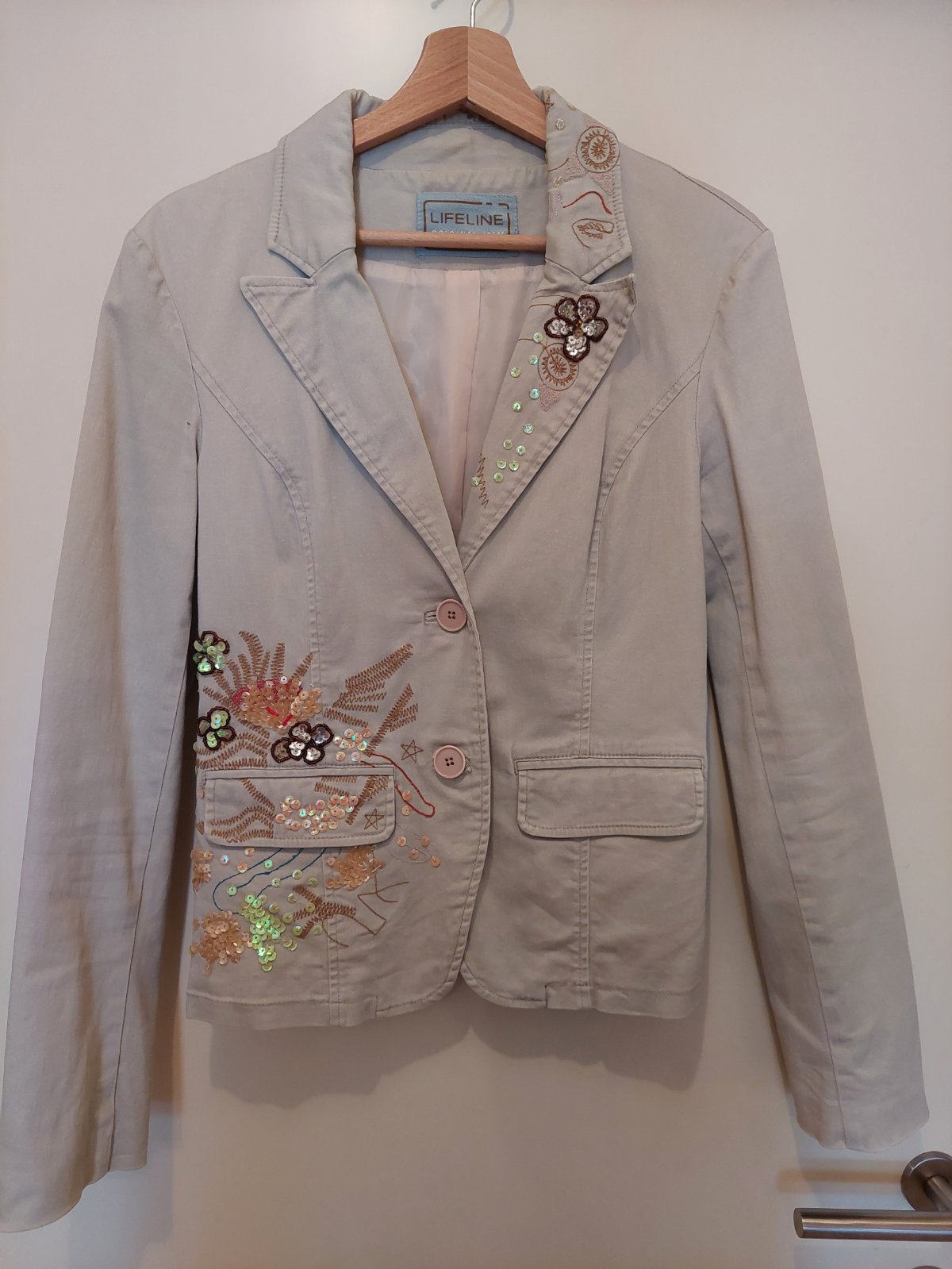 Bezove sako znacky Lifeline. Velkost S. Velmi zaujimave s flitrami. Da sa normalne prat v pracke. Velmi zachovale.