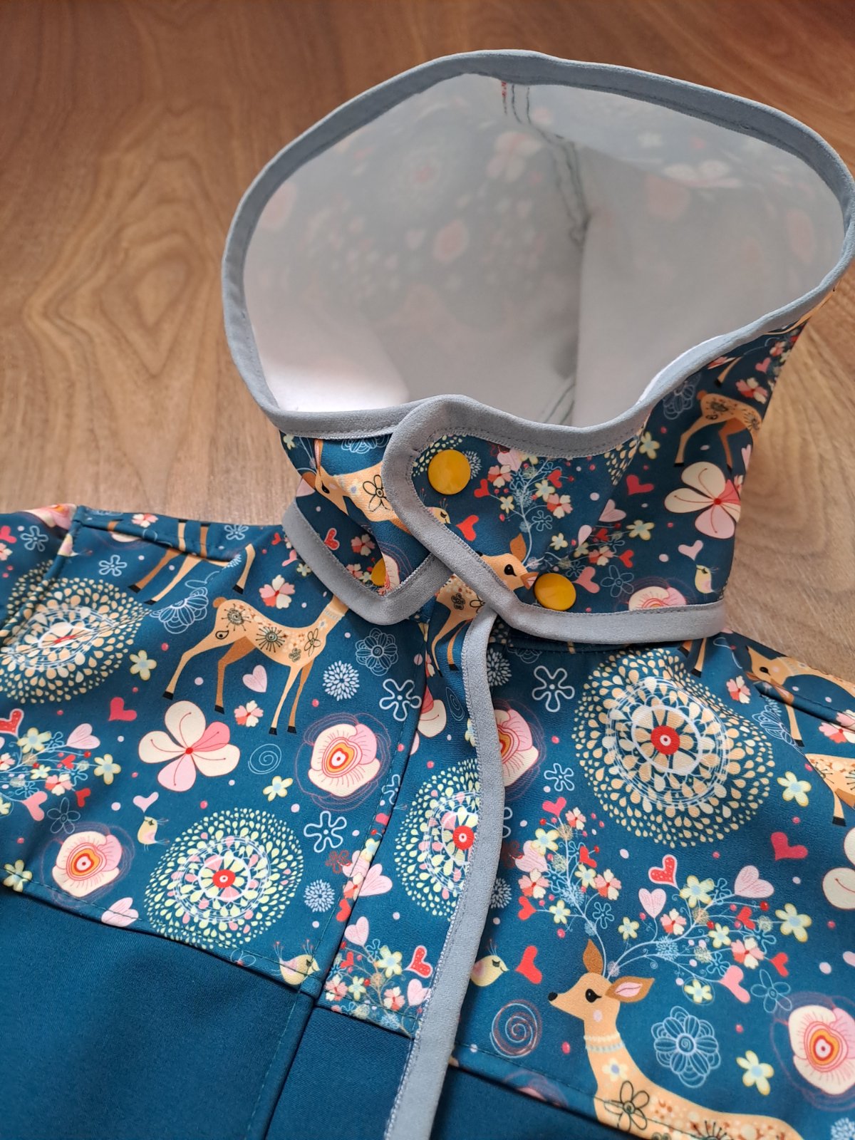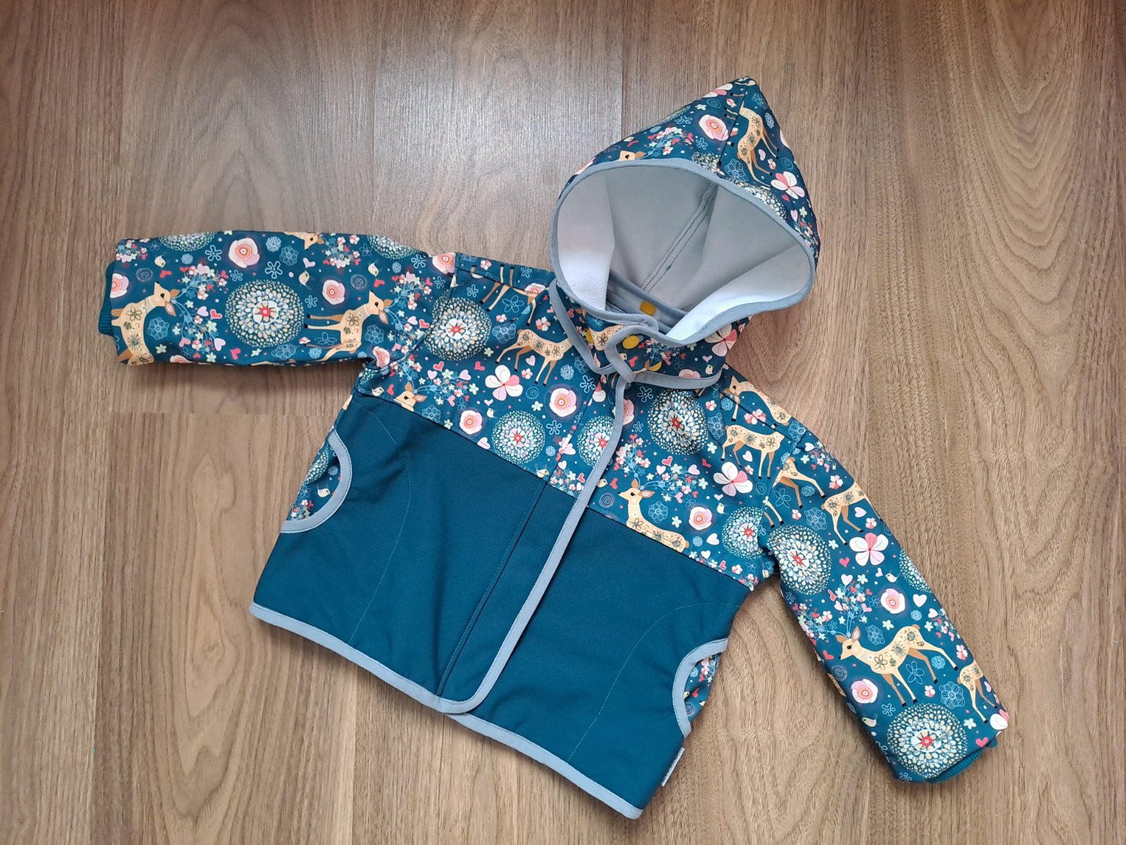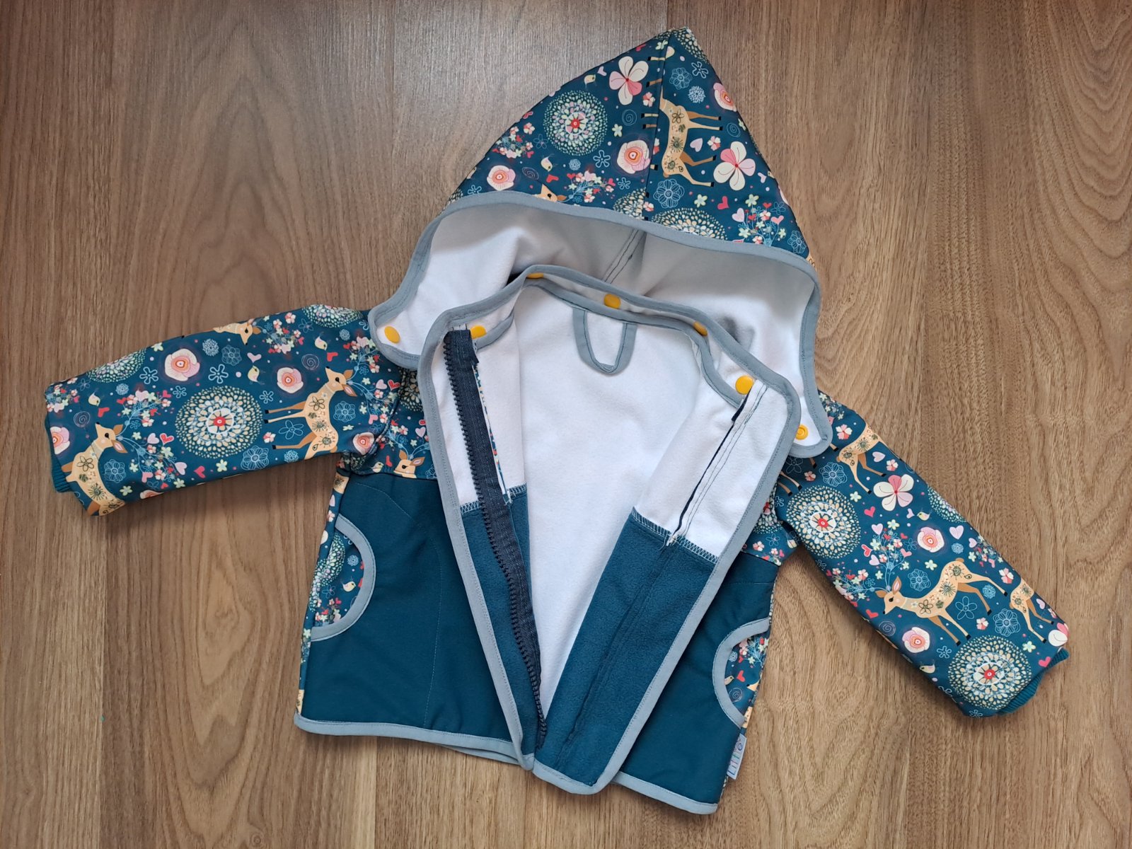 Zapínanie vpredu na zips, bočné vrecká, rukávy ukončené manžetou, odnímateľná kapucňa.