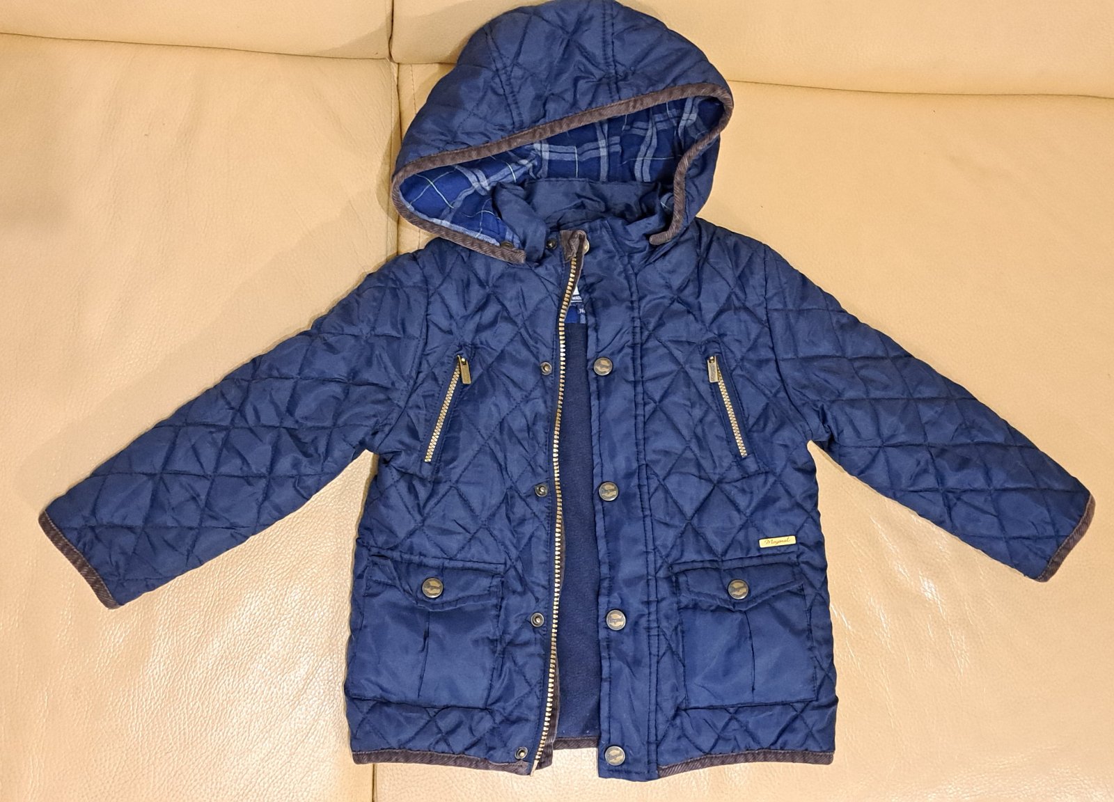 Prechodná, flísom zateplená bundička, kvalitná španielská značka, farba ako na prvej foto, nosenie nie je vidno, synom bola nosena sporadicky, kapucňa odpínateľná, plus poštovne.