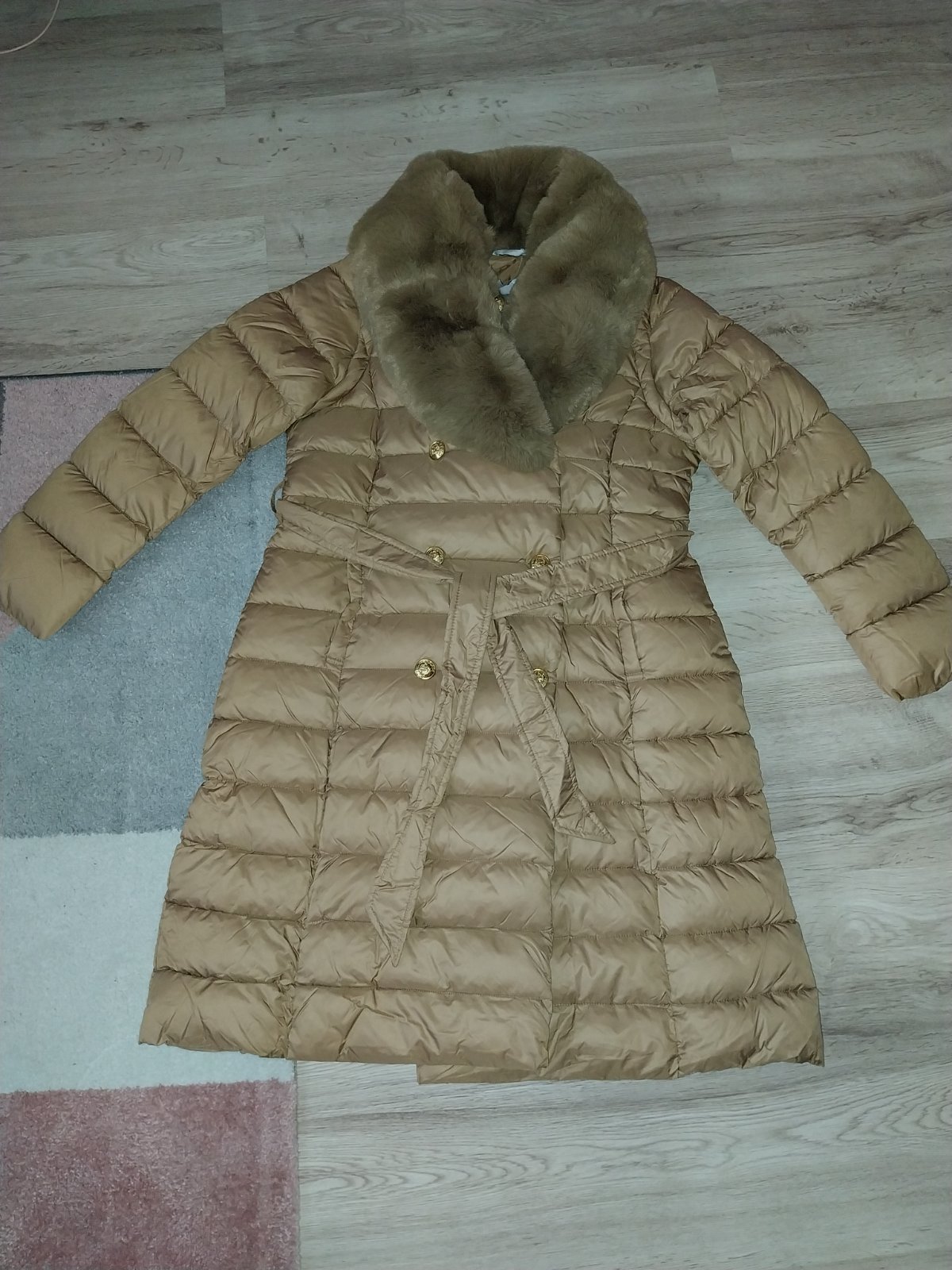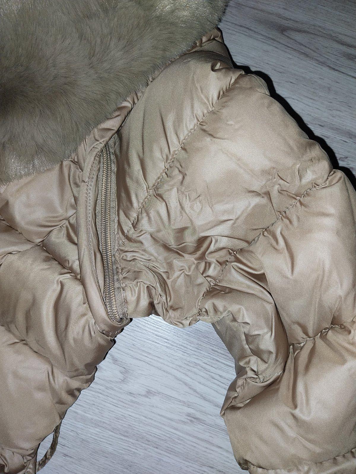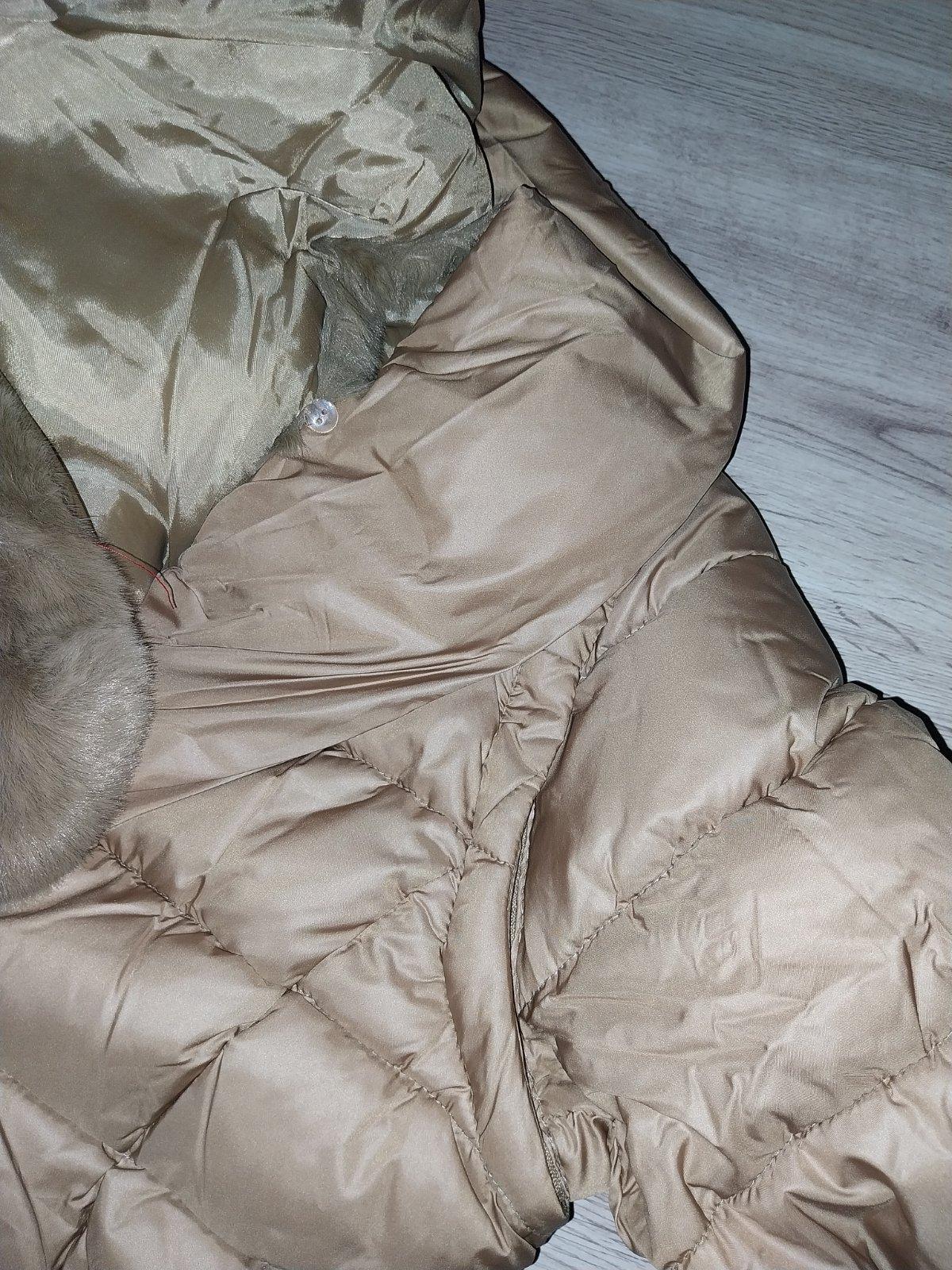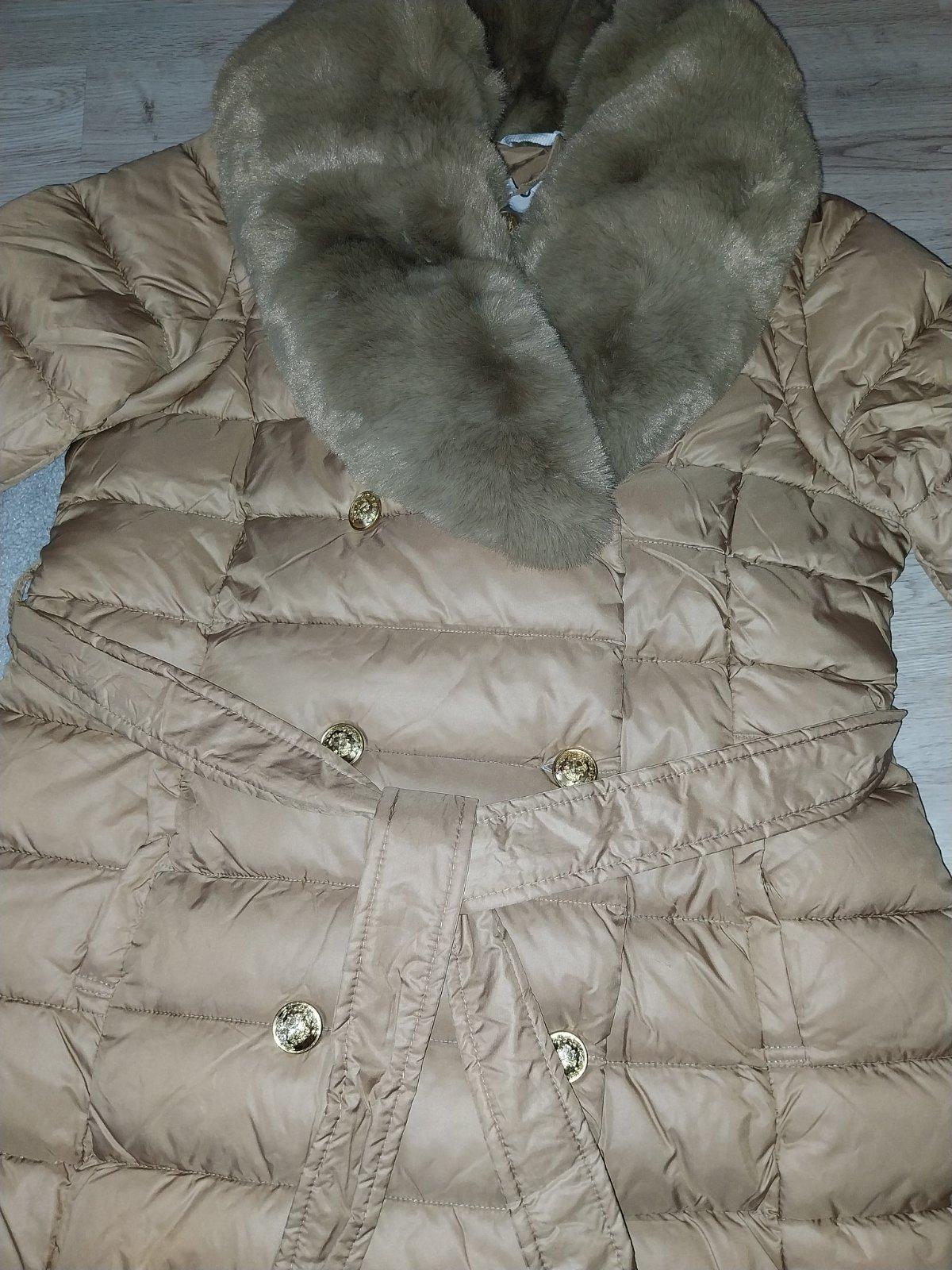 Krásna štýlová bunda, veľ.42-44. uvedená velk.2xl-3xl...rozmerovo sedí skor na 42-44, módna ťavia farba , zlaté gombíky...kožušina a rukávy sa dajú odobrať...je z bundy štýlová vesta...kúpená v PL. PC 79 eur. Je veľmi pekná. Cena 45 eur +pošta