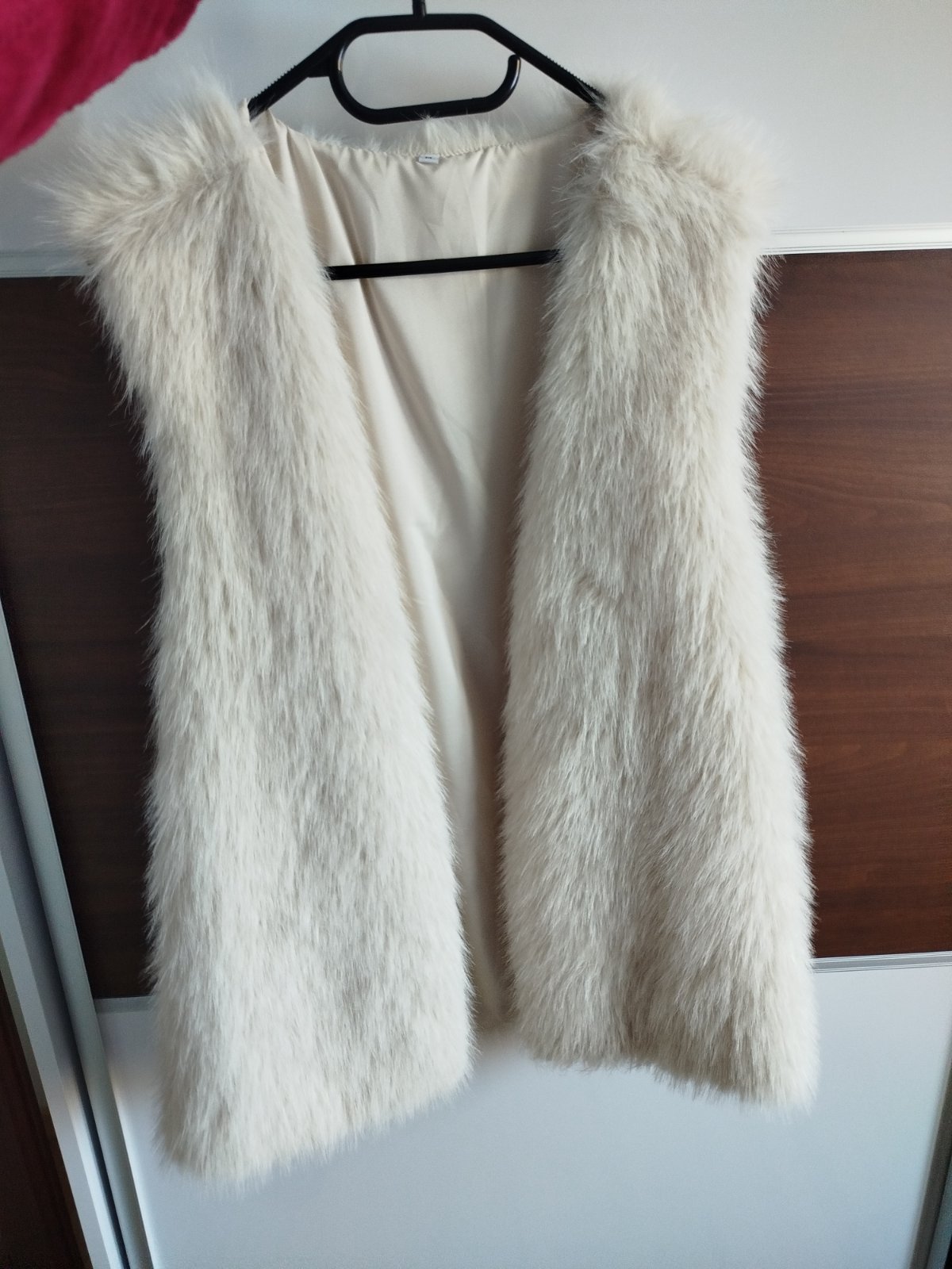 Krásna smotanová kožušinová vesta na veľkosť M/L. Na boku vrecká. Zapínanie na háčiky. Dĺžka 76 cm a prsia 51 cm.