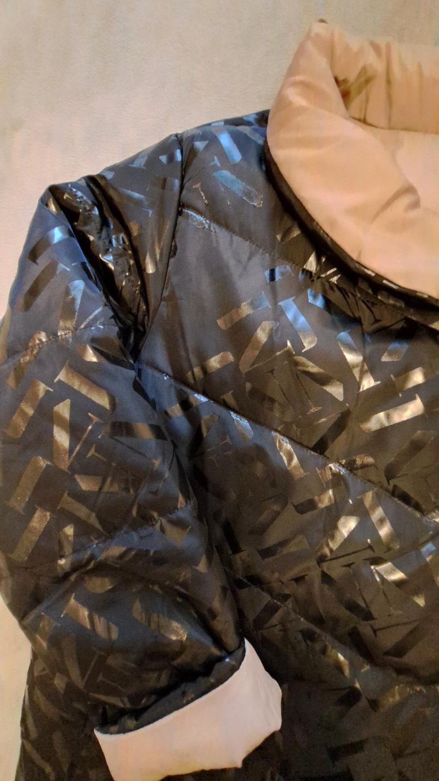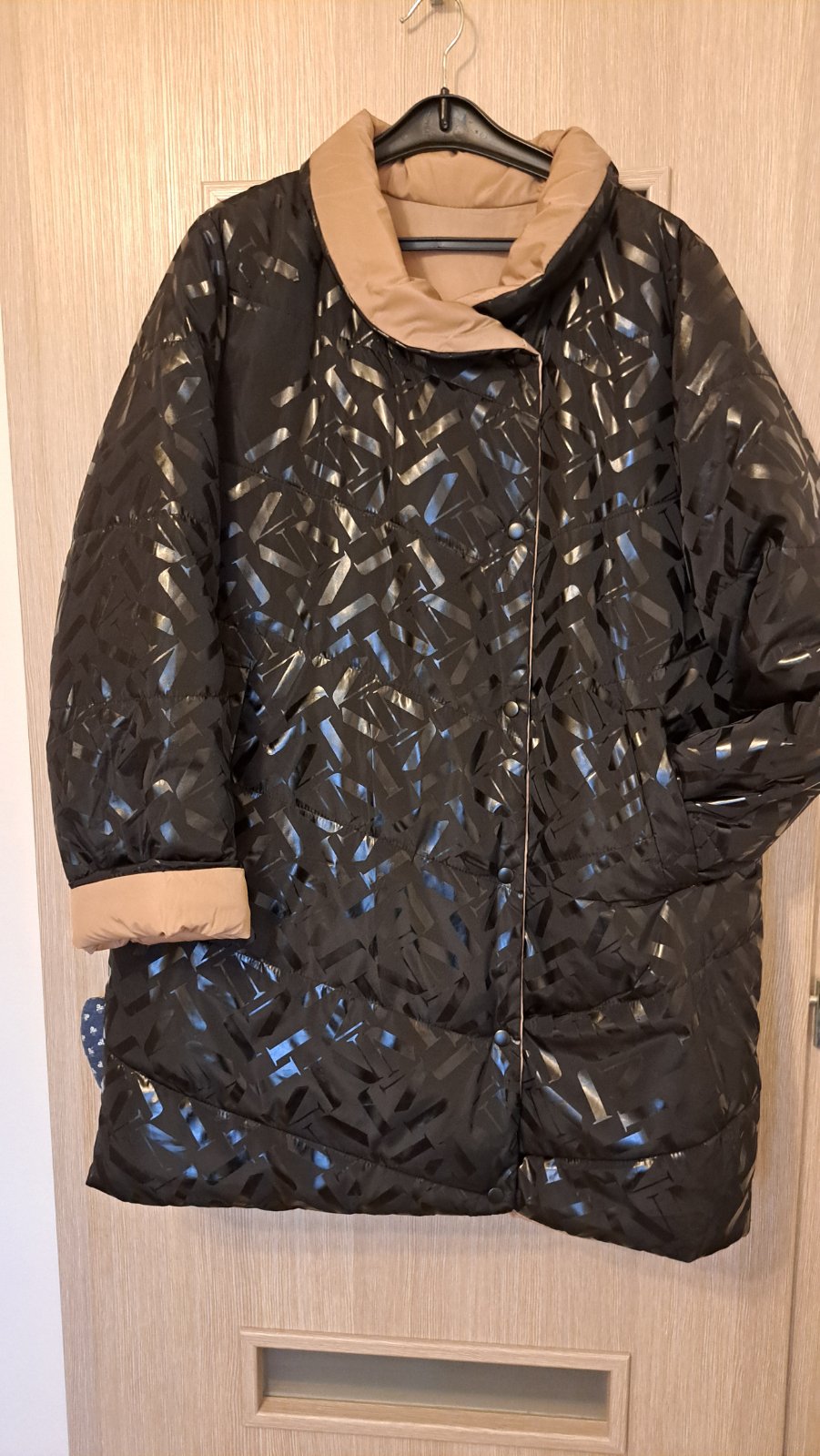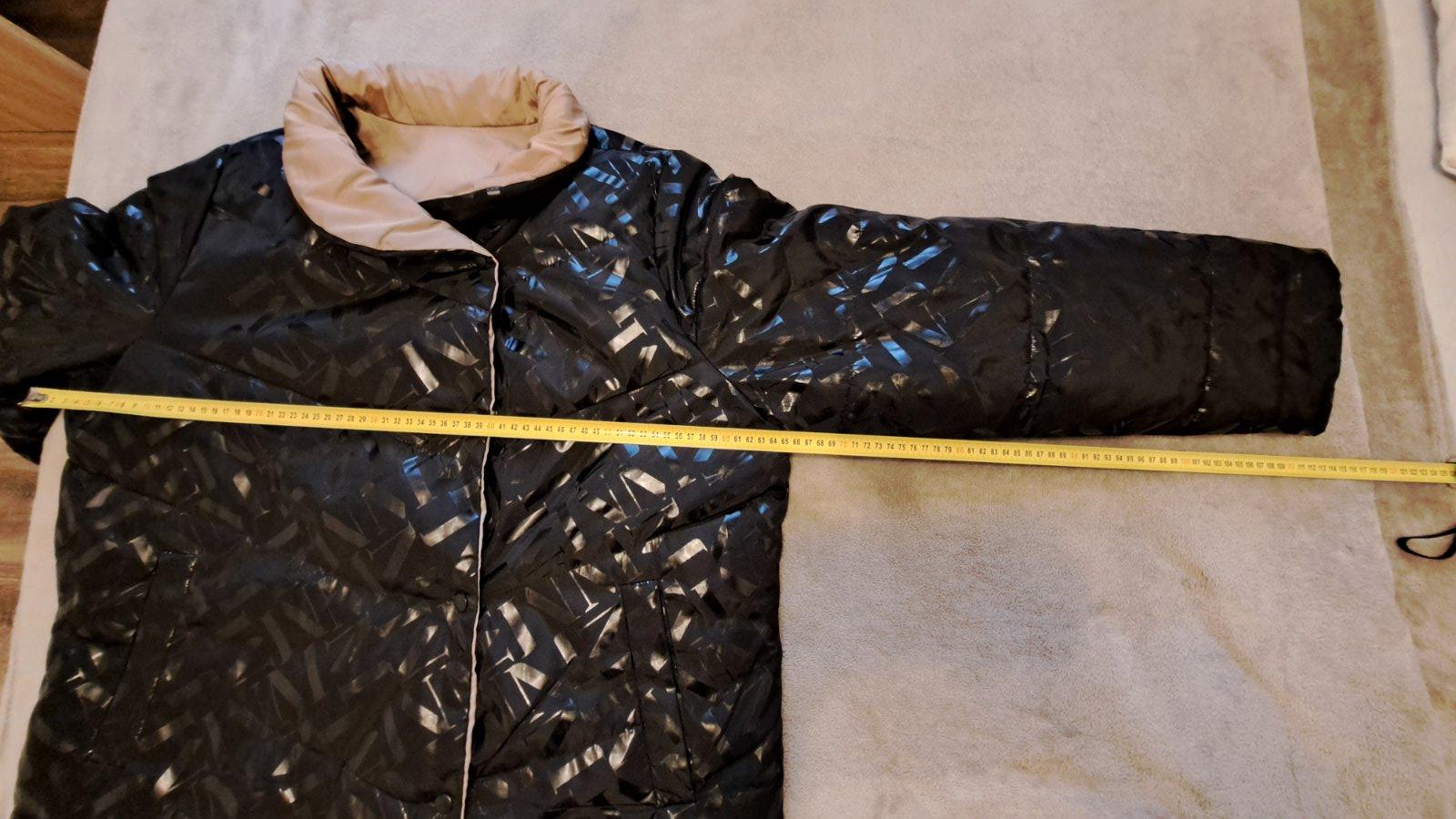 Obojstranna zimná bunda,kupovana nová v MOCHITO predajni Poprad.Dobrý nosený stav,len na čiernej strane pod ramenom vyšuchaný vzor od kabelky. So šálom a kabelkou pri nosení nevidieť. Dá sa nosiť aj z druhej strany