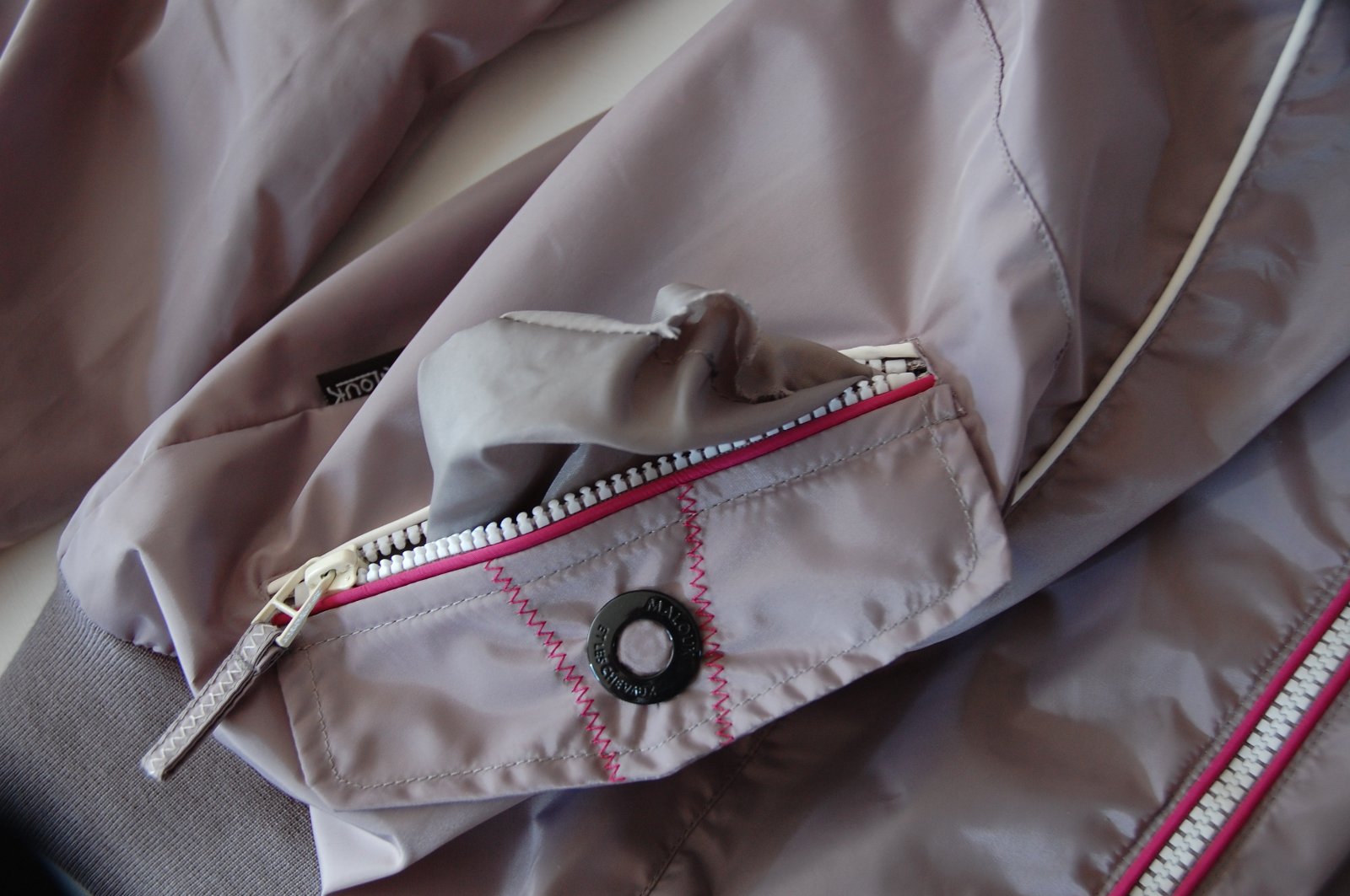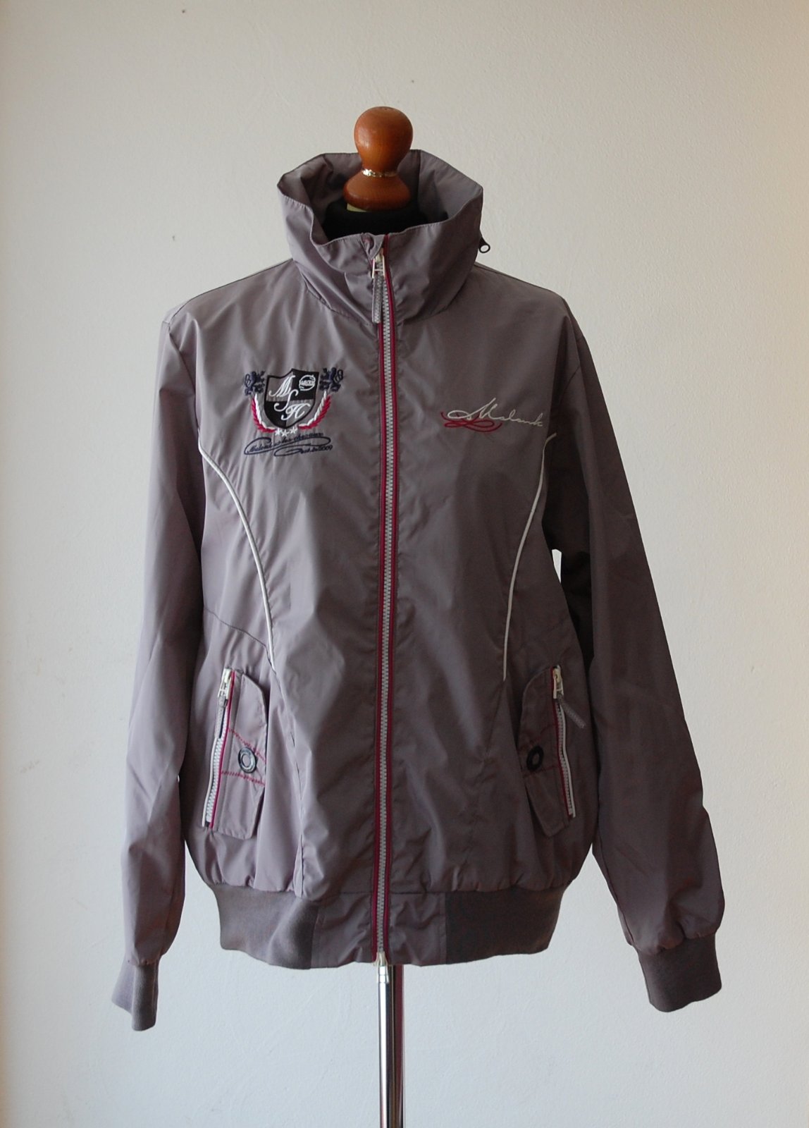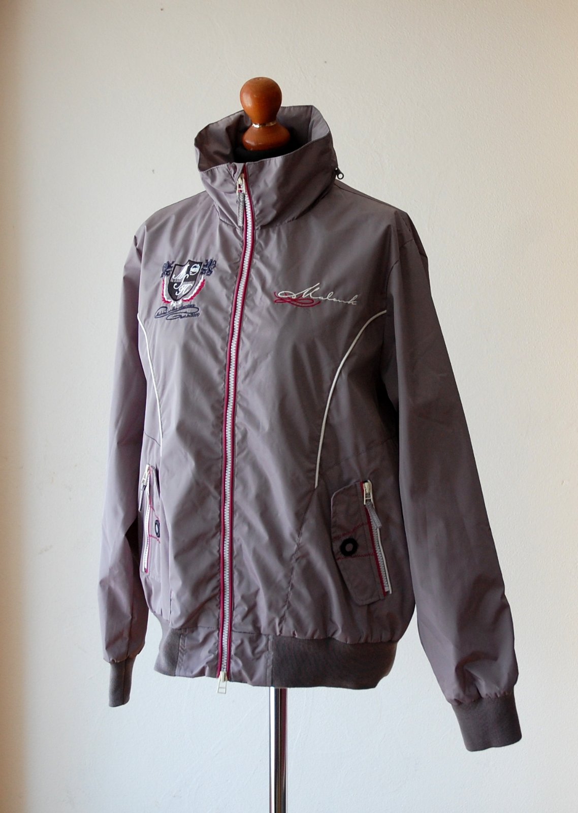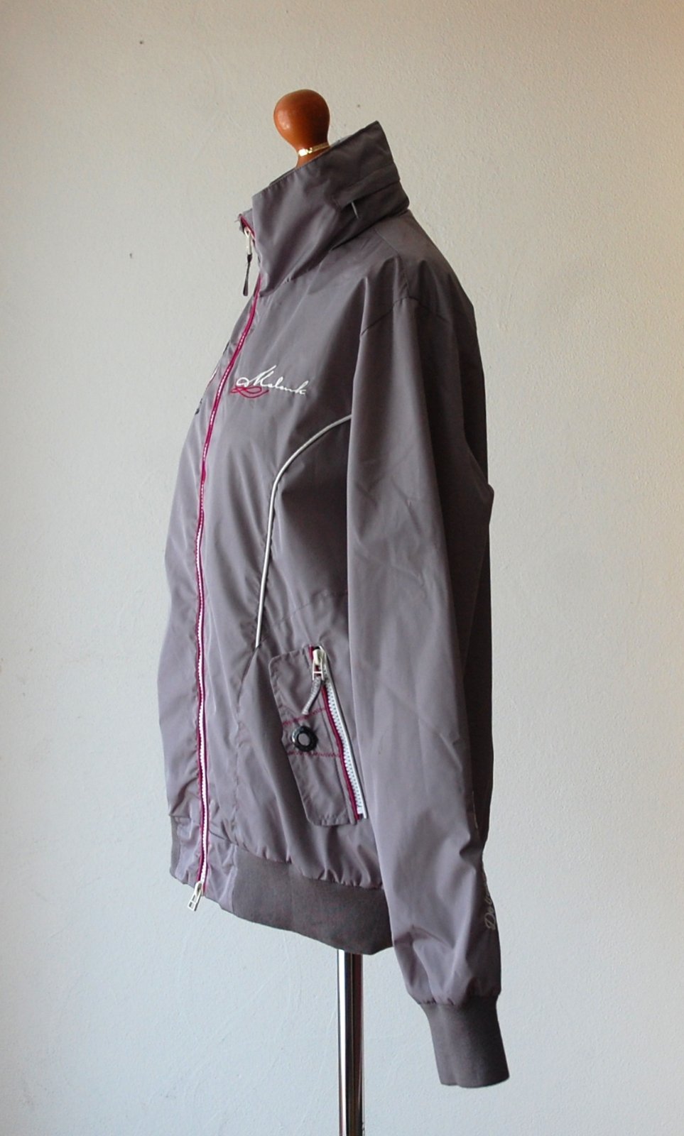 Predám zachovalú športovú bundu v hnedej/sivej farbe s výraznými bielymi a červenými detailmi. Bunda má moderný strih s pružným patentom v páse a na rukávoch. Je ideálna na jar alebo jeseň, prípadne ako ľahká vetrovka na športové aktivity. Jediné drobné upozornenie: vo vnútri jedného vrecka je povolený steh (nič, čo by bránilo noseniu, šikovná ruka to za pár minút zašije, zohľadnené v cene).