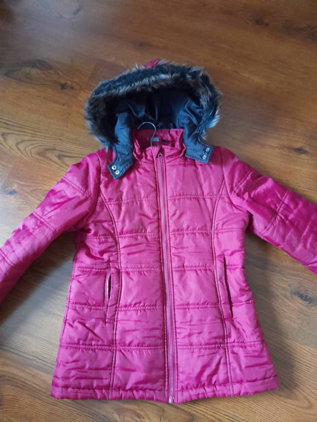 vetrovka bez poškodenia s kožušinkou,veľmi príjemná z vnútra, vrecká,opasok,kapucňa 13-14rokov dl.70cm dl.r.64cm š.43cm