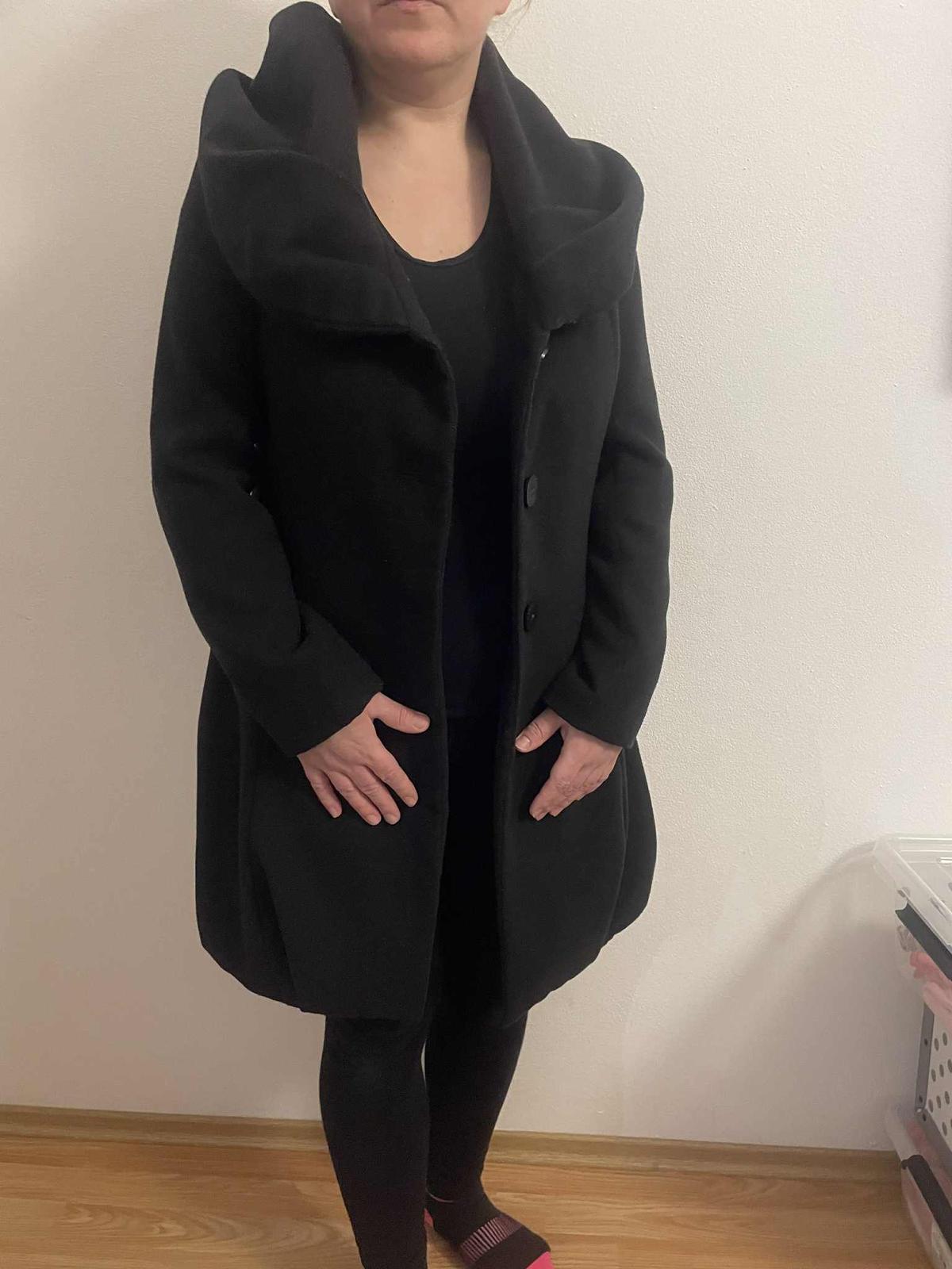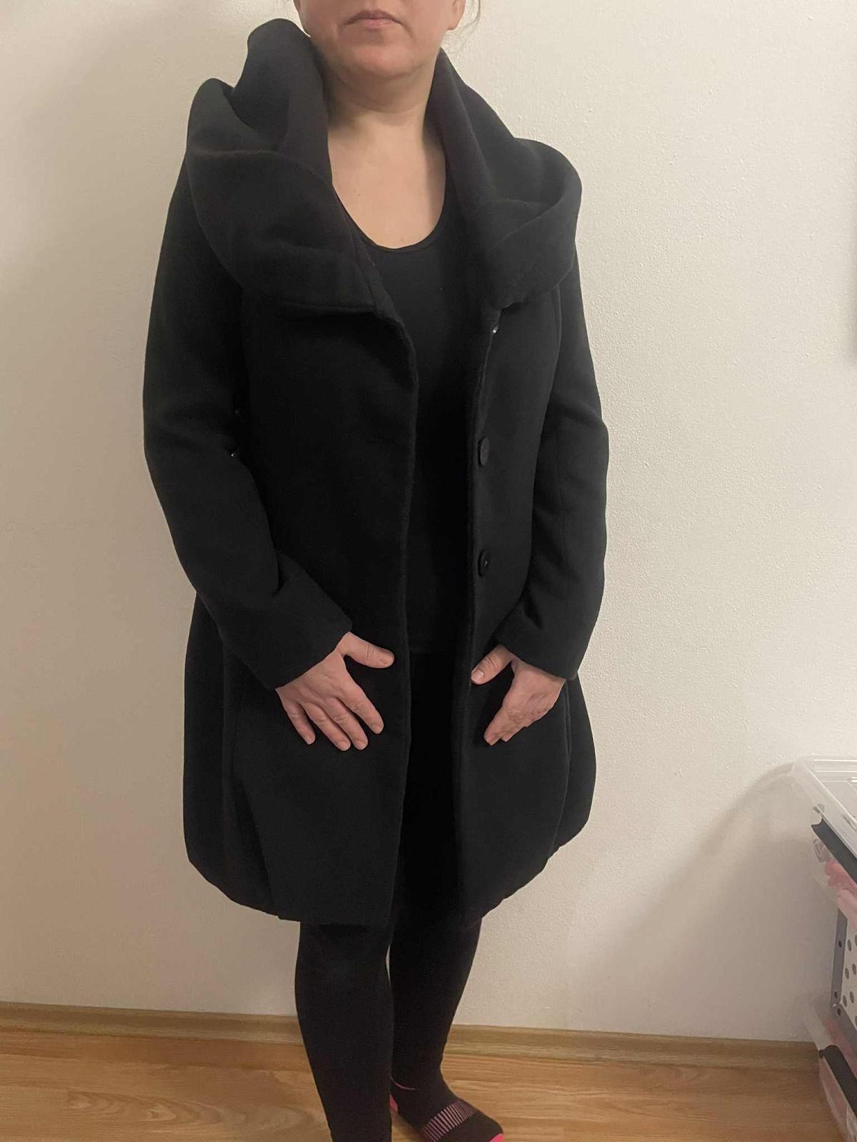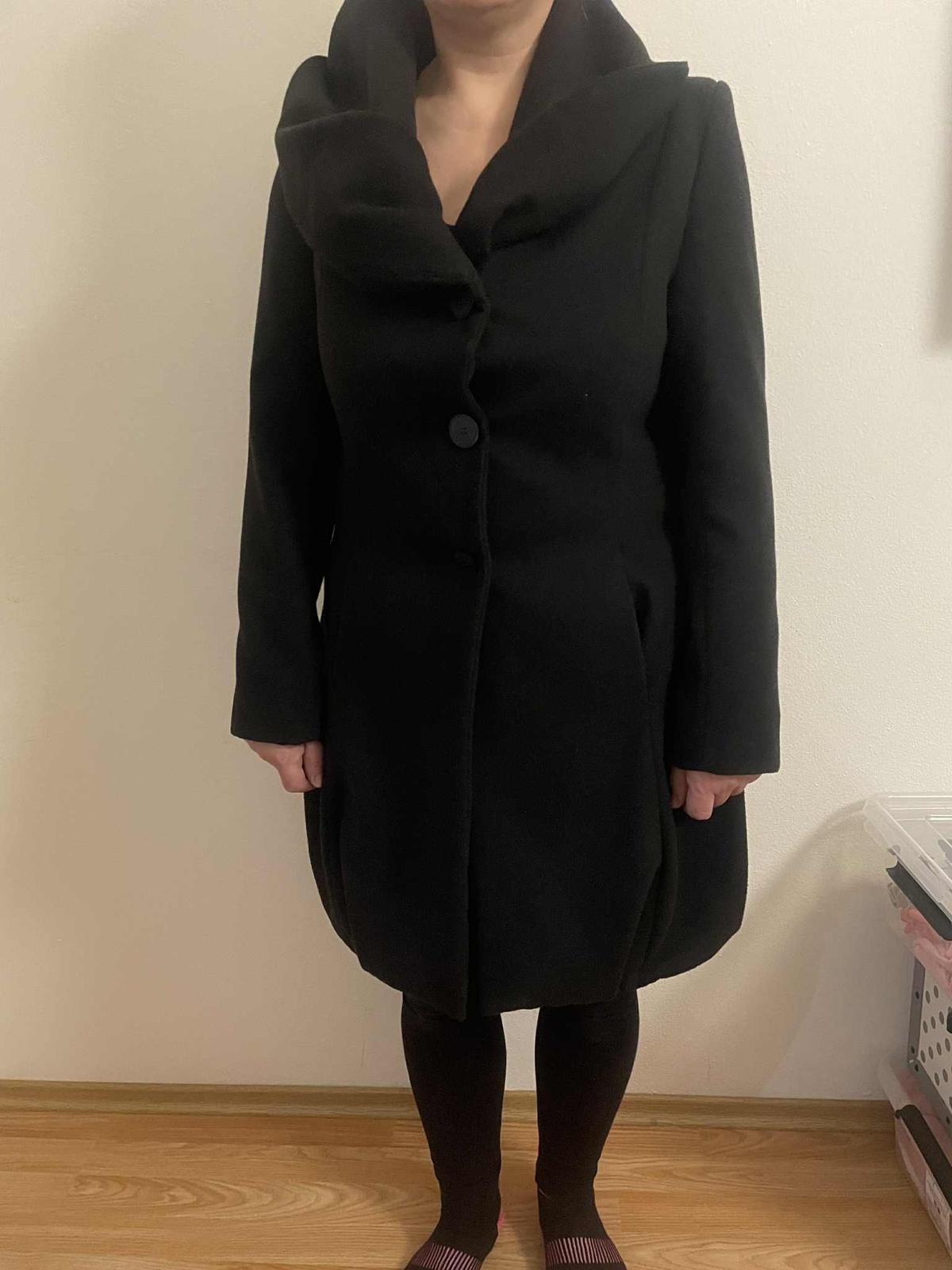 Cierny uzky kabat, prepracovany velkost 40 spolu so salom, vrecka, velmi pekny stylovy-stredne hruby,z kvalitneho materialu-nie tie tenke latky z ktorych sa siju kabaty dnes