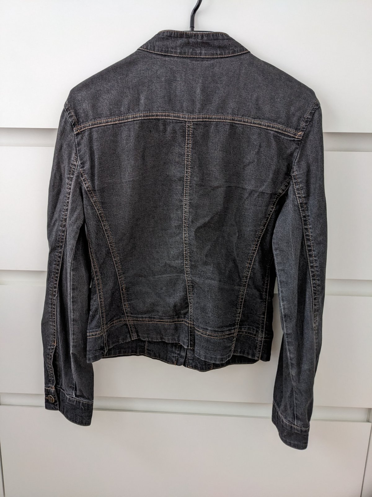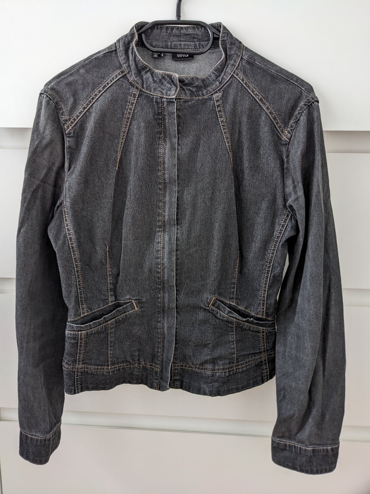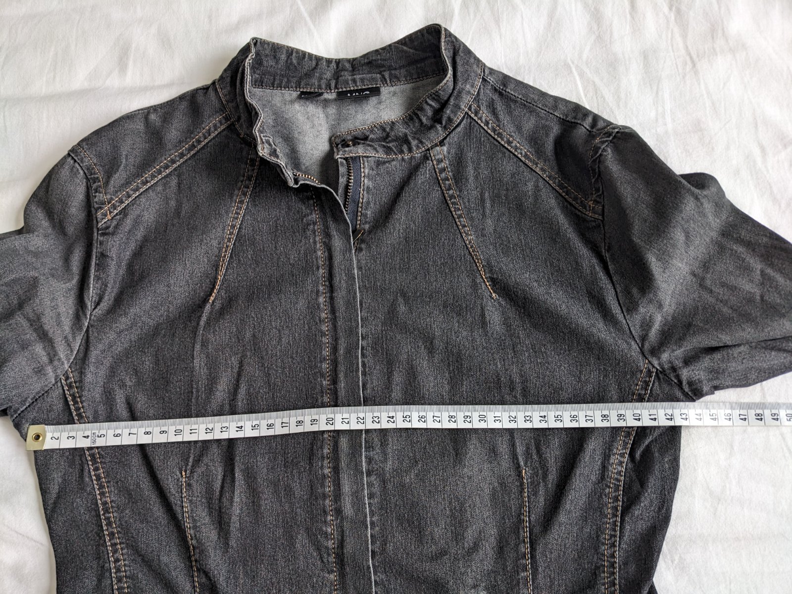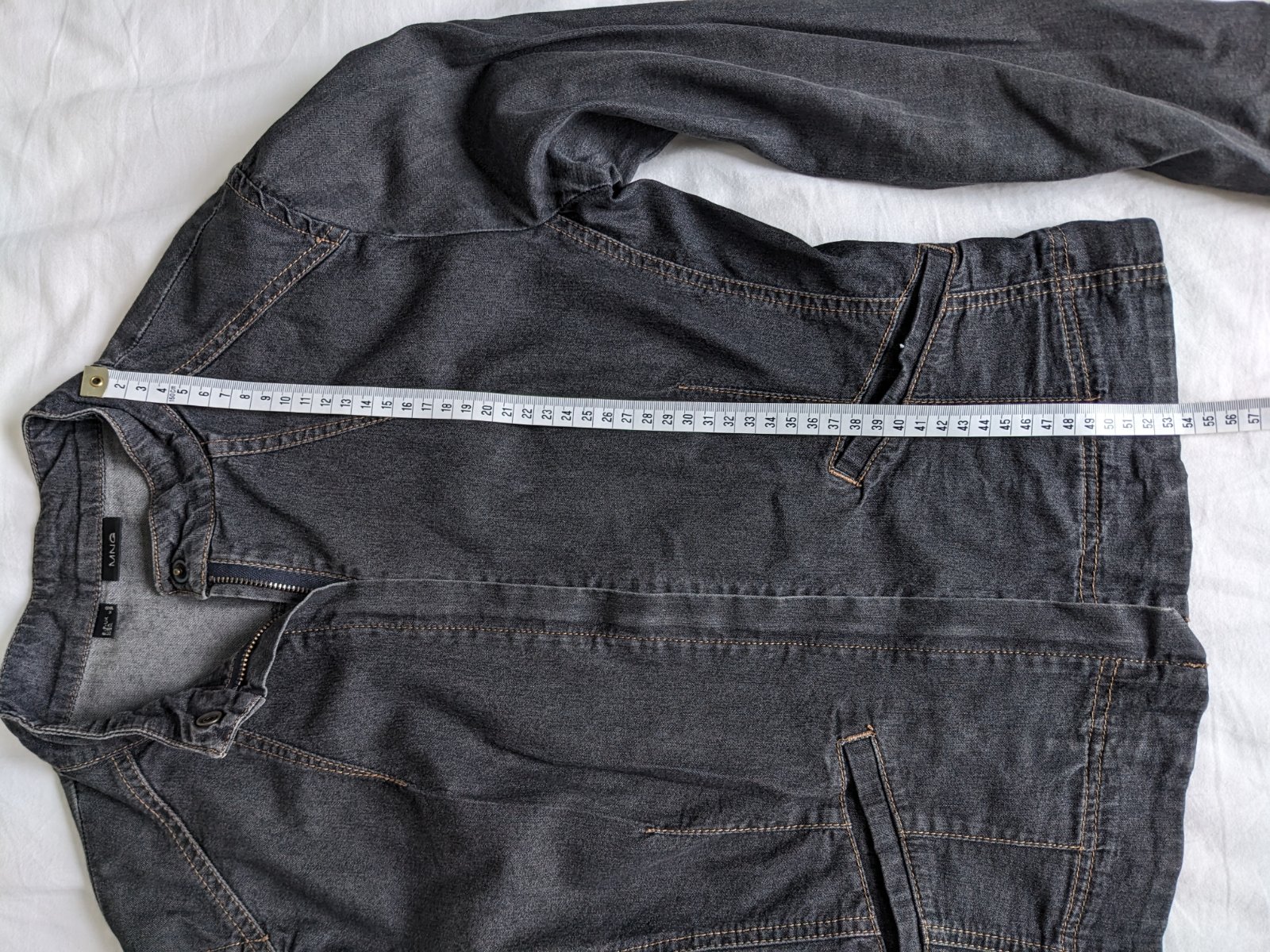 Darujem rifľovú tenkú krátku bundu, Zn. Mango, rozmery na foto. Má aj vrecká.