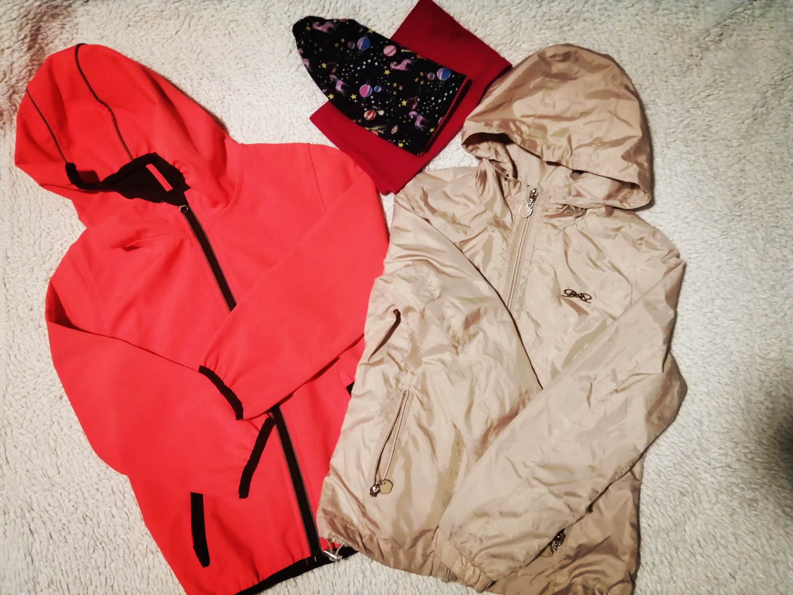 Predám 2 kusy prechodné bundy. Na oranžovej malinky fliacik, skoro ho nie je vidno.. Inak dobrý, nosený stav. Darujem k ním čiapku a nakrcnik. Cena za všetko je 5€.
