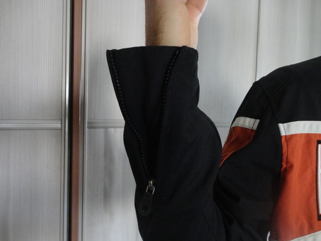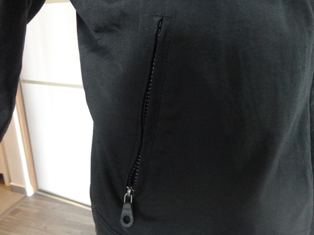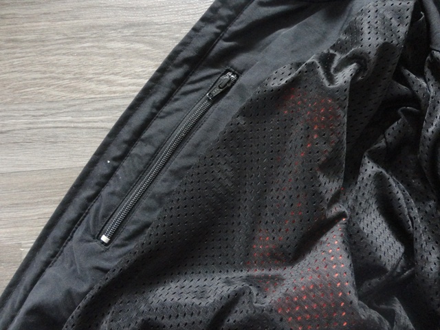 Priedušná vnútorná látka, zapínanie na zips, na spodu bundy je patent, stojačik na krku na cvok, rukávy na spodu možno rozšířit zipsom, 2 vonkajšie vrecká na zips, 2 vnútorné vrecká (1 na zips), oranžové nápisy spredu, zozadu bundy aj na oboch rukávoch.