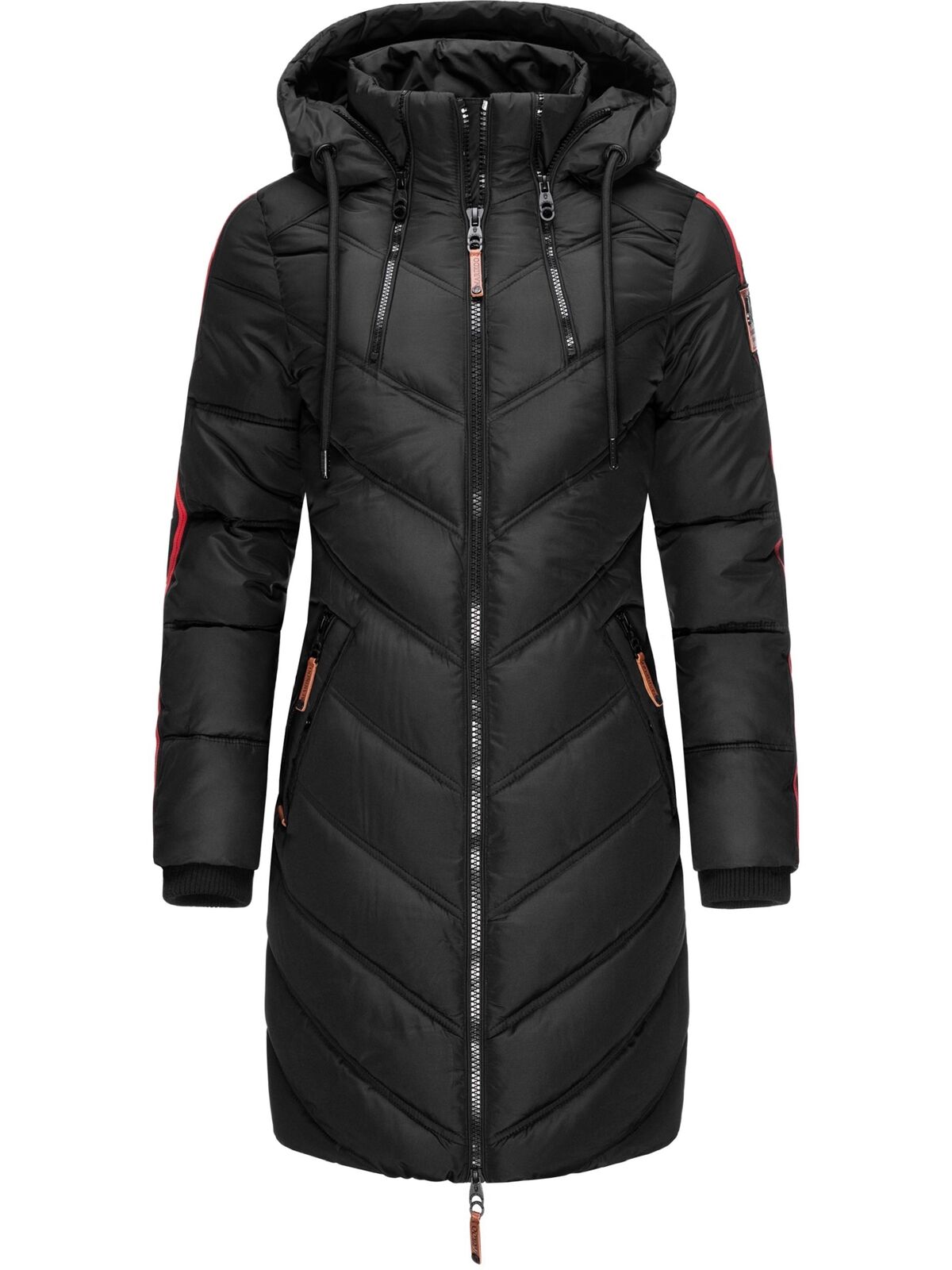 NEBULUS - zimna dlha bunda - kabat v ciernej farbe s vyraznymi cervenymi aplikaciami zipsov s kapuckou lemovanou kozusinou - neda sa odopinat,vrecka uzatvaratelne na zips,logo znacky nasite na ruka...