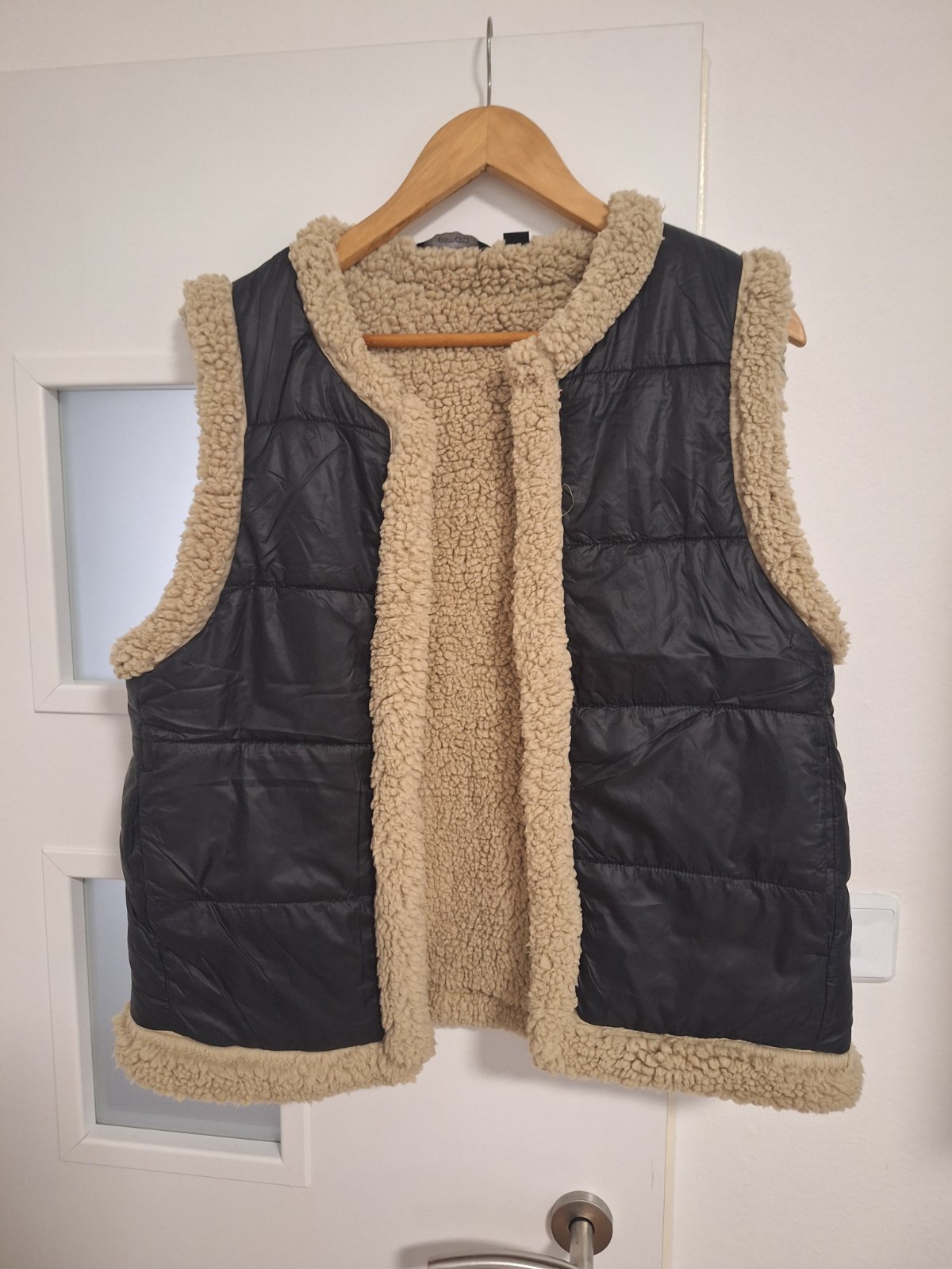 Nová nenosená zateplená vesta v zadu dlhšia v predu kratšia rozmery sú šírka cez prsia 50cm dĺžka v predu 66cm a v zadu 69cm