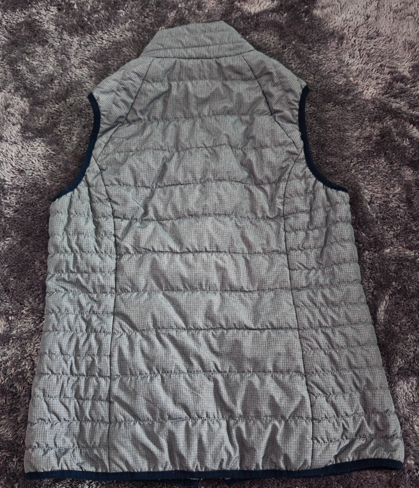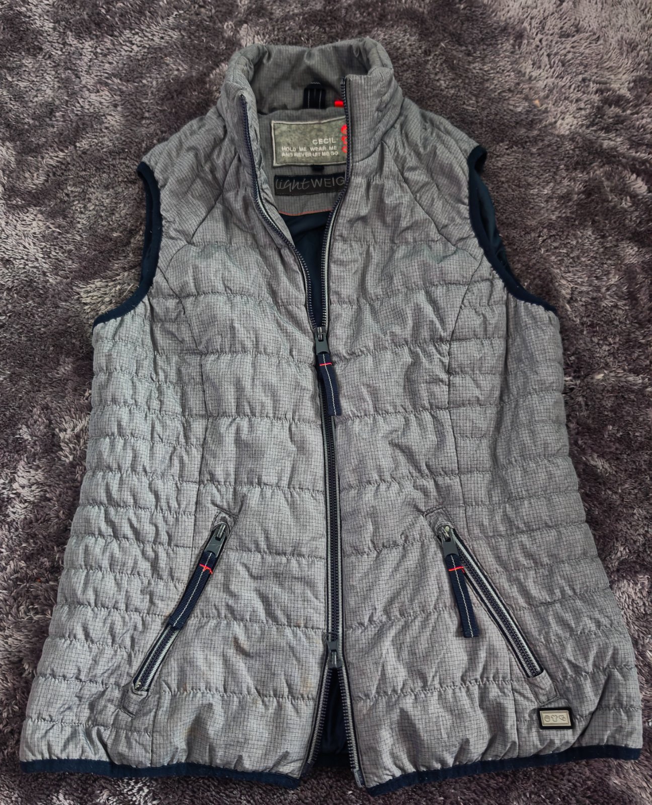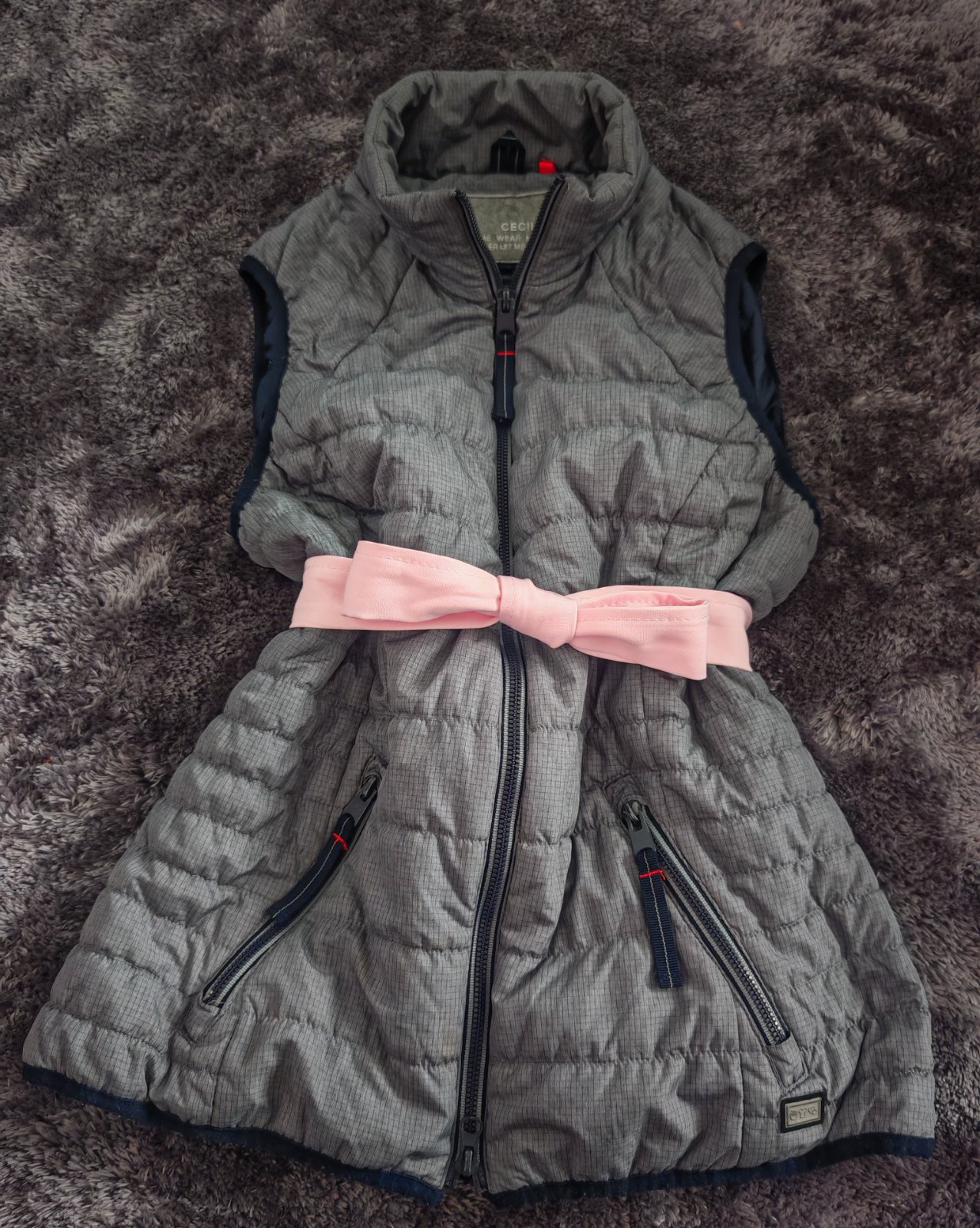 Šedá, presivana vestička na obojstranny zips, vpredu dve vrecká, jedno vnútorné, je ľahucka, teplá. Kupovaná nová v obchode Desigual, nosena len dcérkou, bez chýb