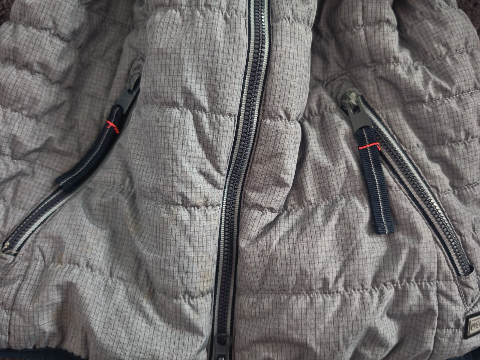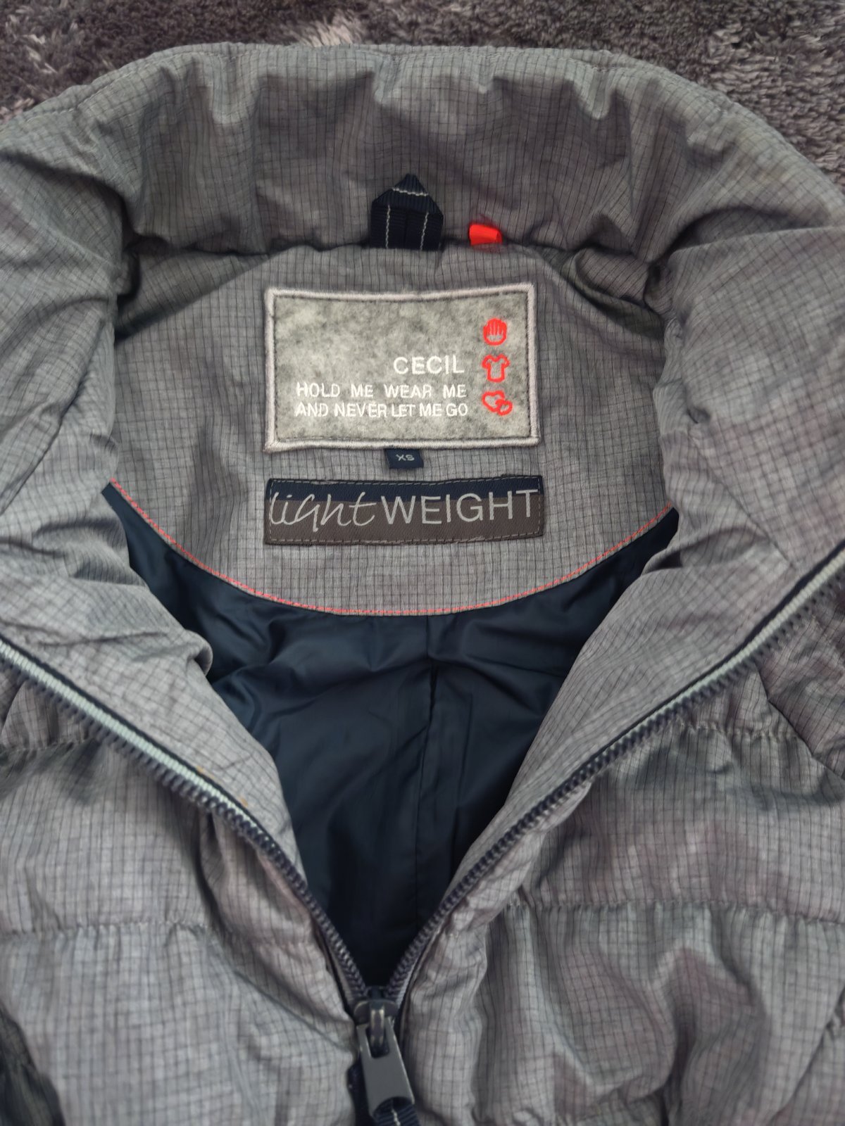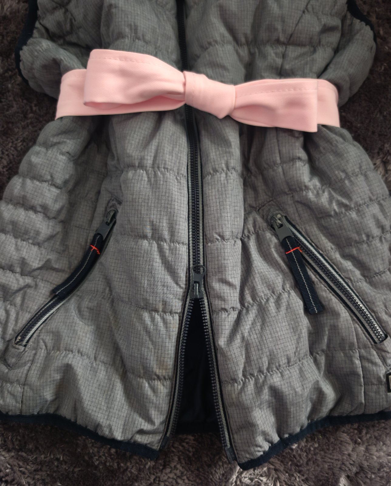 Šedá, presivana vestička na obojstranny zips, vpredu dve vrecká, jedno vnútorné, je ľahucka, teplá. Kupovaná nová v obchode Desigual, nosena len dcérkou, bez chýb