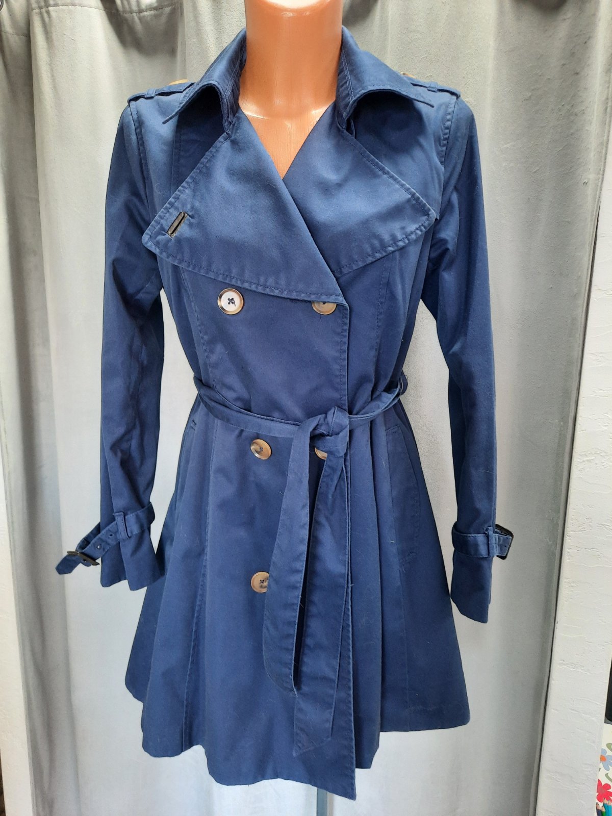Výborný stav, denimova modrá, tenká riflovina, strih kopírujuci postavu, formované v páse, nepruží, veľkosť 38,šírka pod pazuchami cca 46 cm, dĺžka 66 cm, rukáv bol skrachovaný