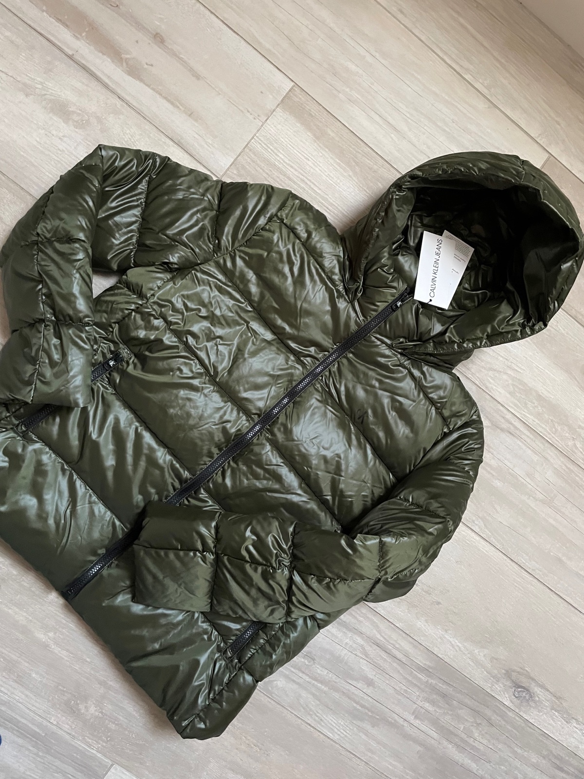 Úžasná bundička, nádherná farba oliva s jemným leskom, originál, posobí veľmi luxusne, je ľahká a pritom teplá,
