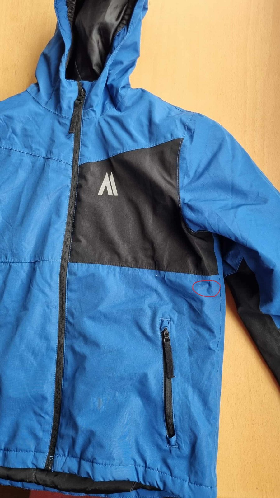 Na druhej fotke zakrúžkované 3 malé čierne bodky, netuším od čoho sú. Inak dieťa malo oblečenú bundu maximálne 5-krát.