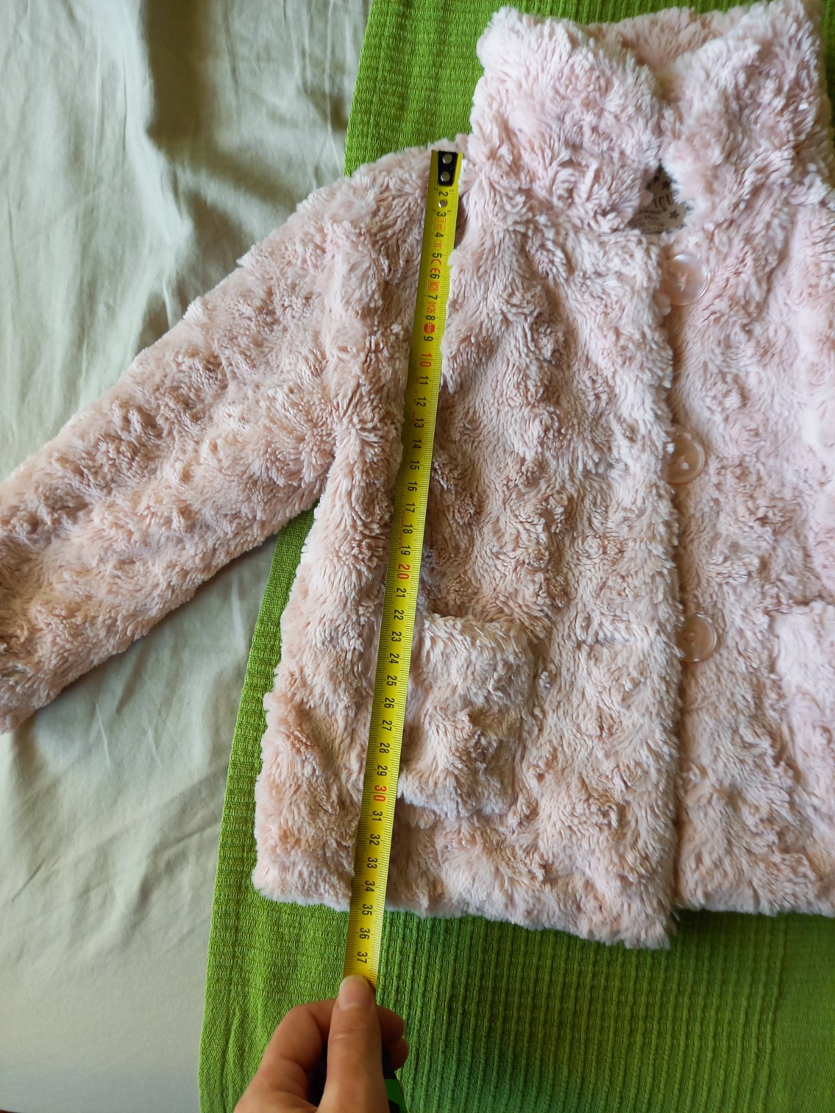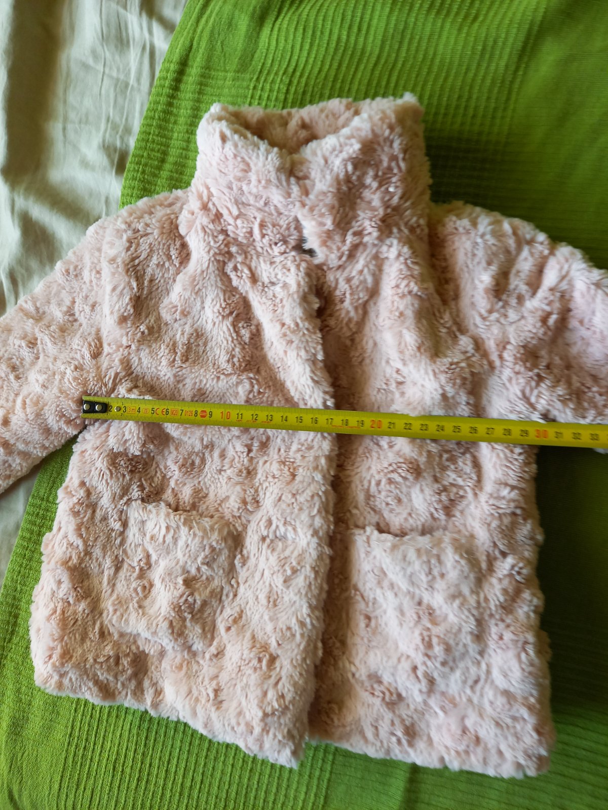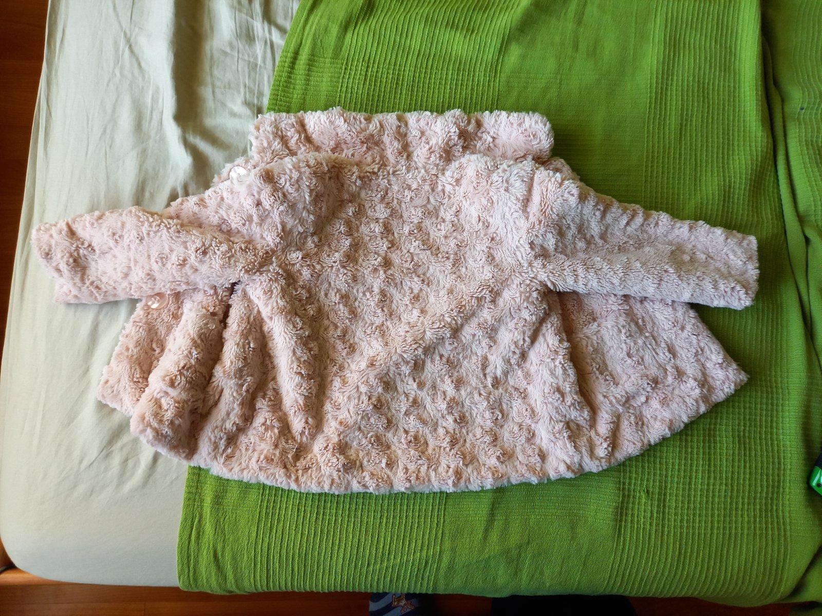 Predám svetlo ružový mäkkučký kabátik. Rozmery na fotkách . Farba svetloružova vid fotky. Jedinú chybičku ma fľak vo vnútri na podšívke nie veľmi viditeľný. Inak bez poškodení