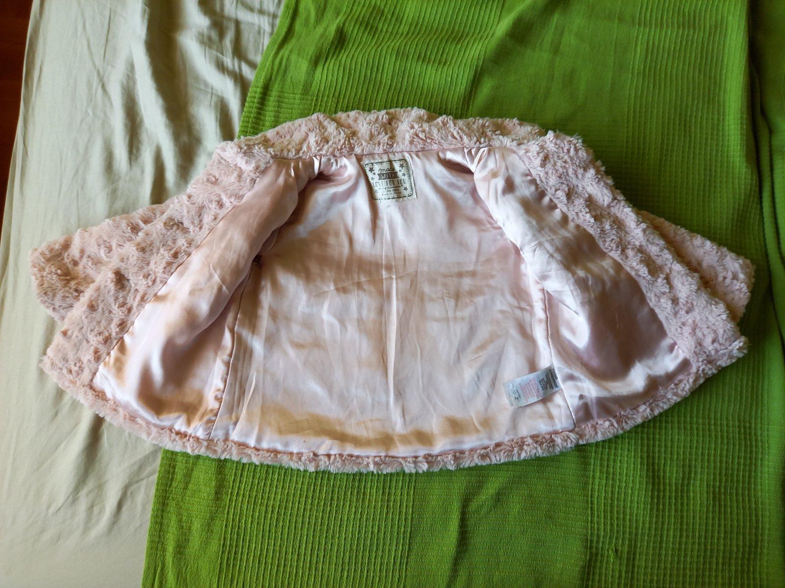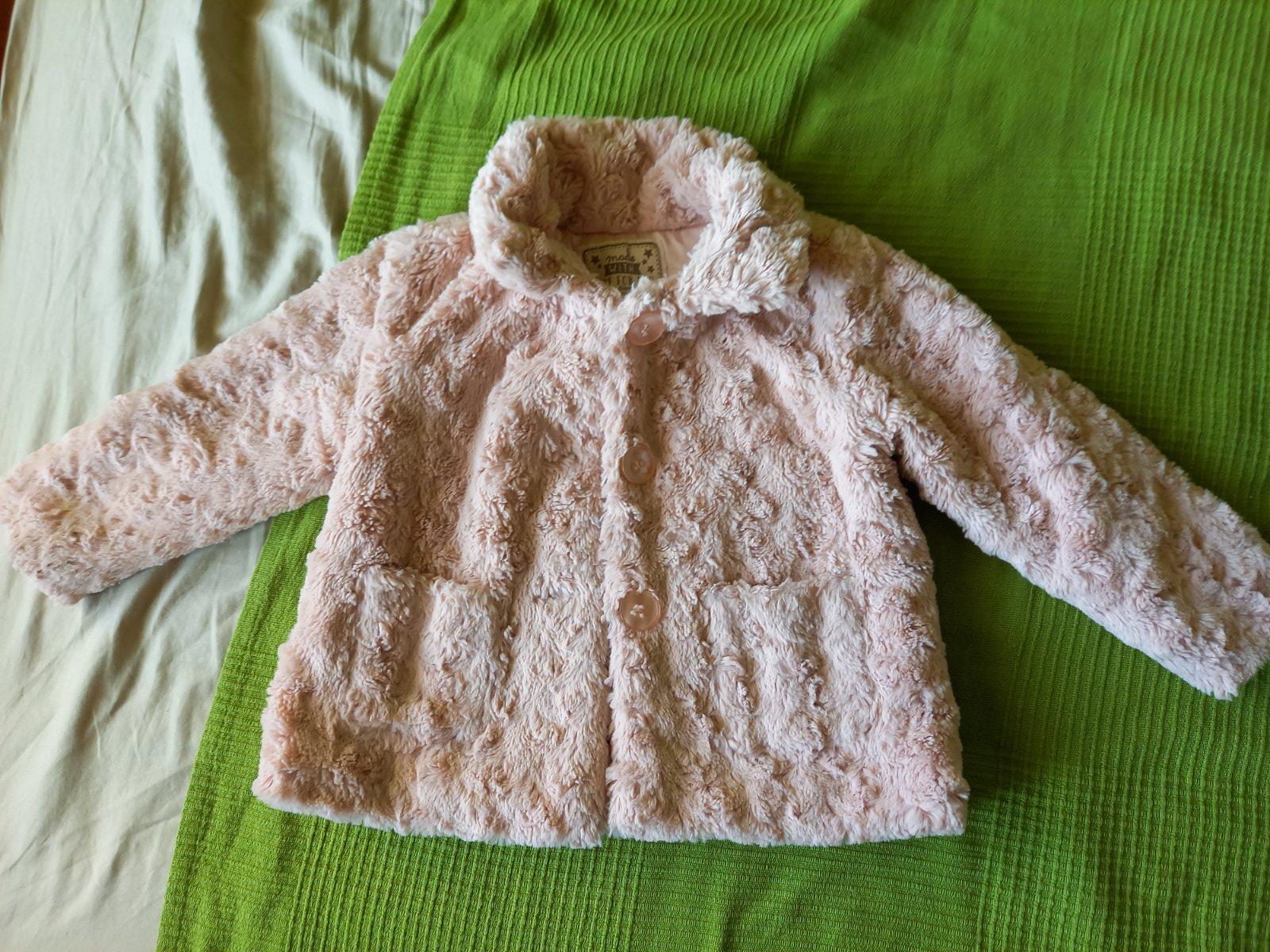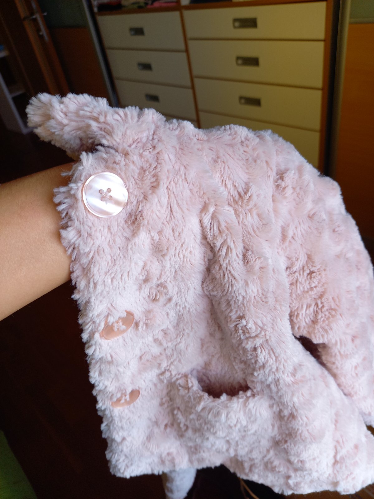Predám svetlo ružový mäkkučký kabátik. Rozmery na fotkách . Farba svetloružova vid fotky. Jedinú chybičku ma fľak vo vnútri na podšívke nie veľmi viditeľný. Inak bez poškodení