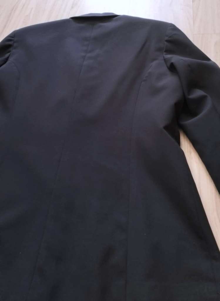 Štítok nemá, takže zloženie materiálu neviem, je to klasické sako, nie hrubé a má lesklú podšívku.