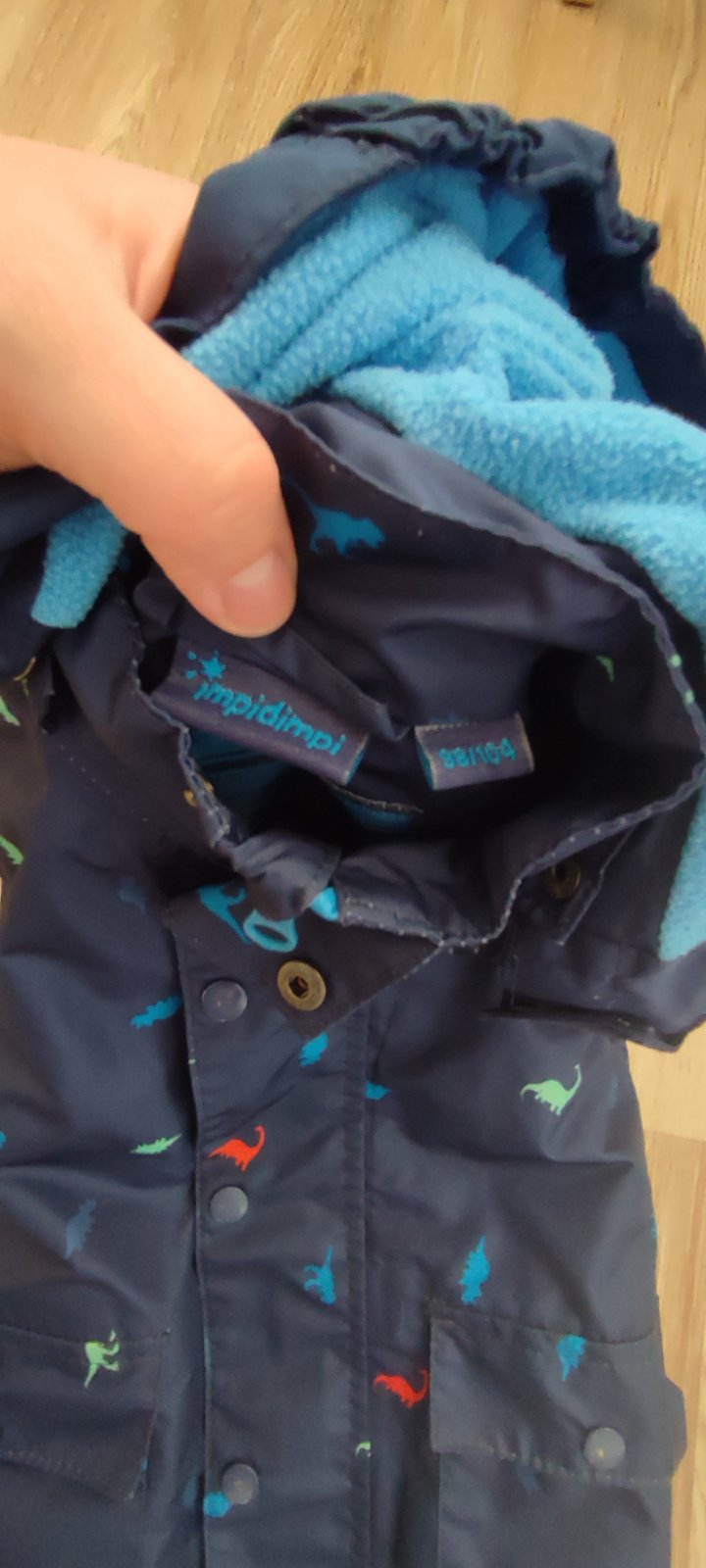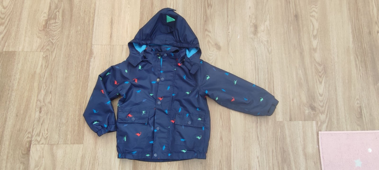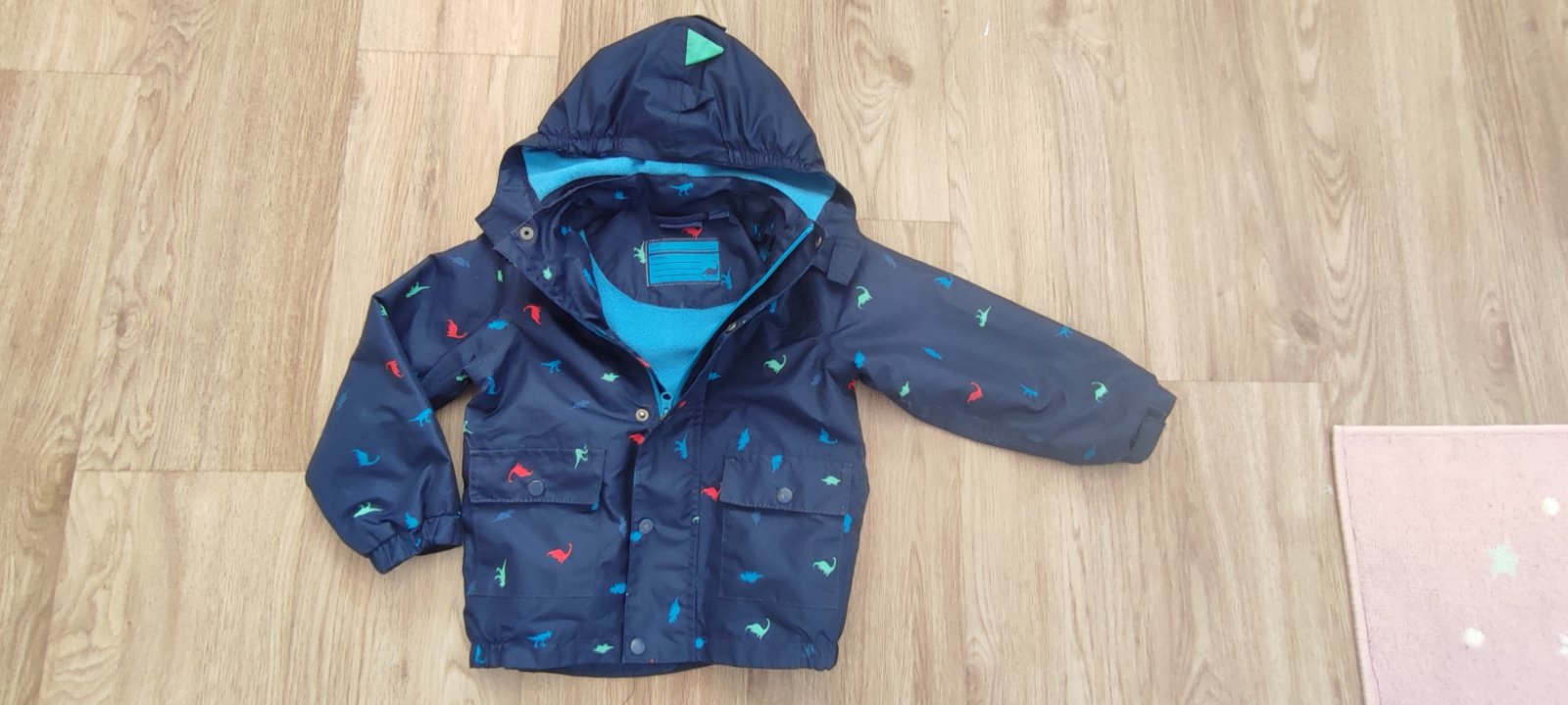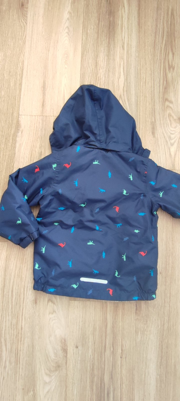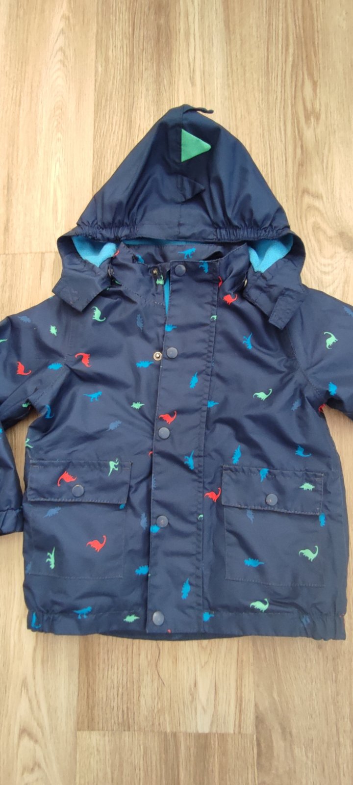 Dobry stav az velmi dobry, bezne znamky nosenia, oskrete gombiky, osuchnuty reflexny pasok na chrbte, inak bez dier, flakoc, farba pekna tmavomodra s dinosaurami, vnutri cela podsita flisom, aj rukavy