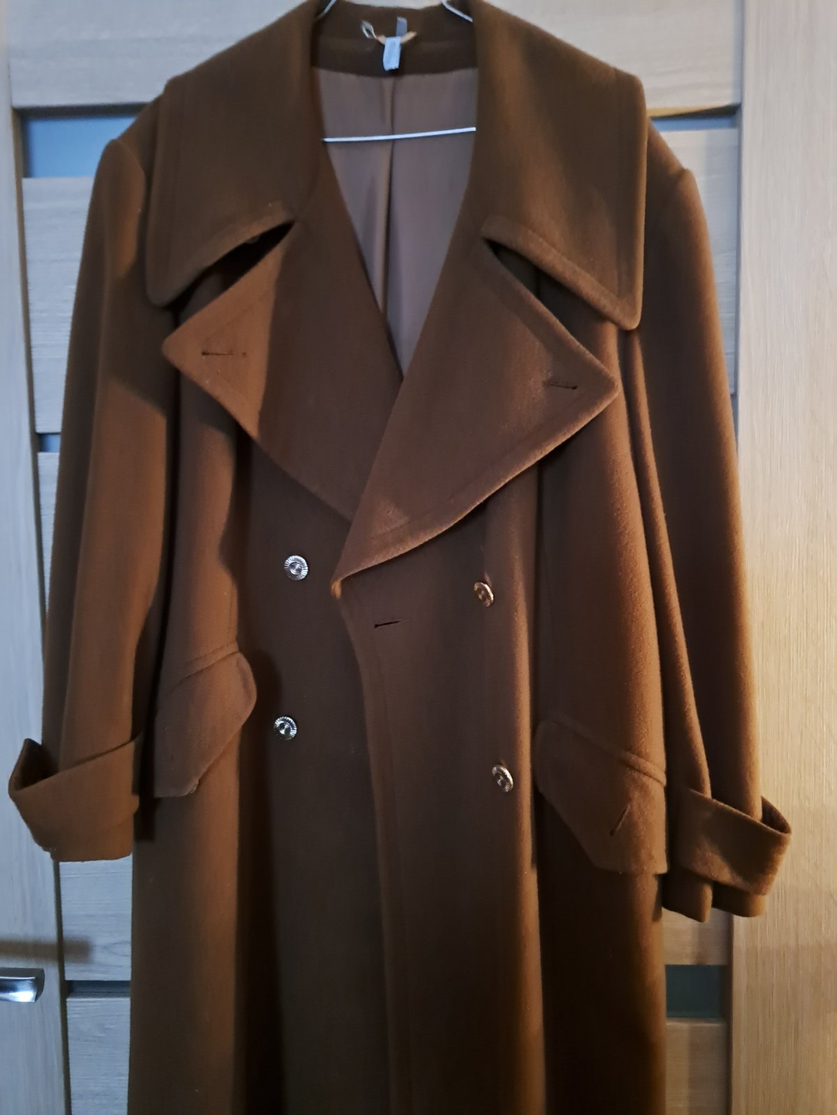 Dámsky kabát,v zachovalom stave,šírka 55cm x2 a dĺžka 125cm.Čistý,ma aj dve vrecká, zapínanie na gombíky.Tenky flaus,je veľmi ľahký.Skor na prechodné obdobie,slabšiu zimu.Uvedena cena je len formálna,podľa pravidiel Modrého koník.Okrasne zlate gombiky su aj na rukavoch a vreckach.Realna cena je 35€ + poštovné.