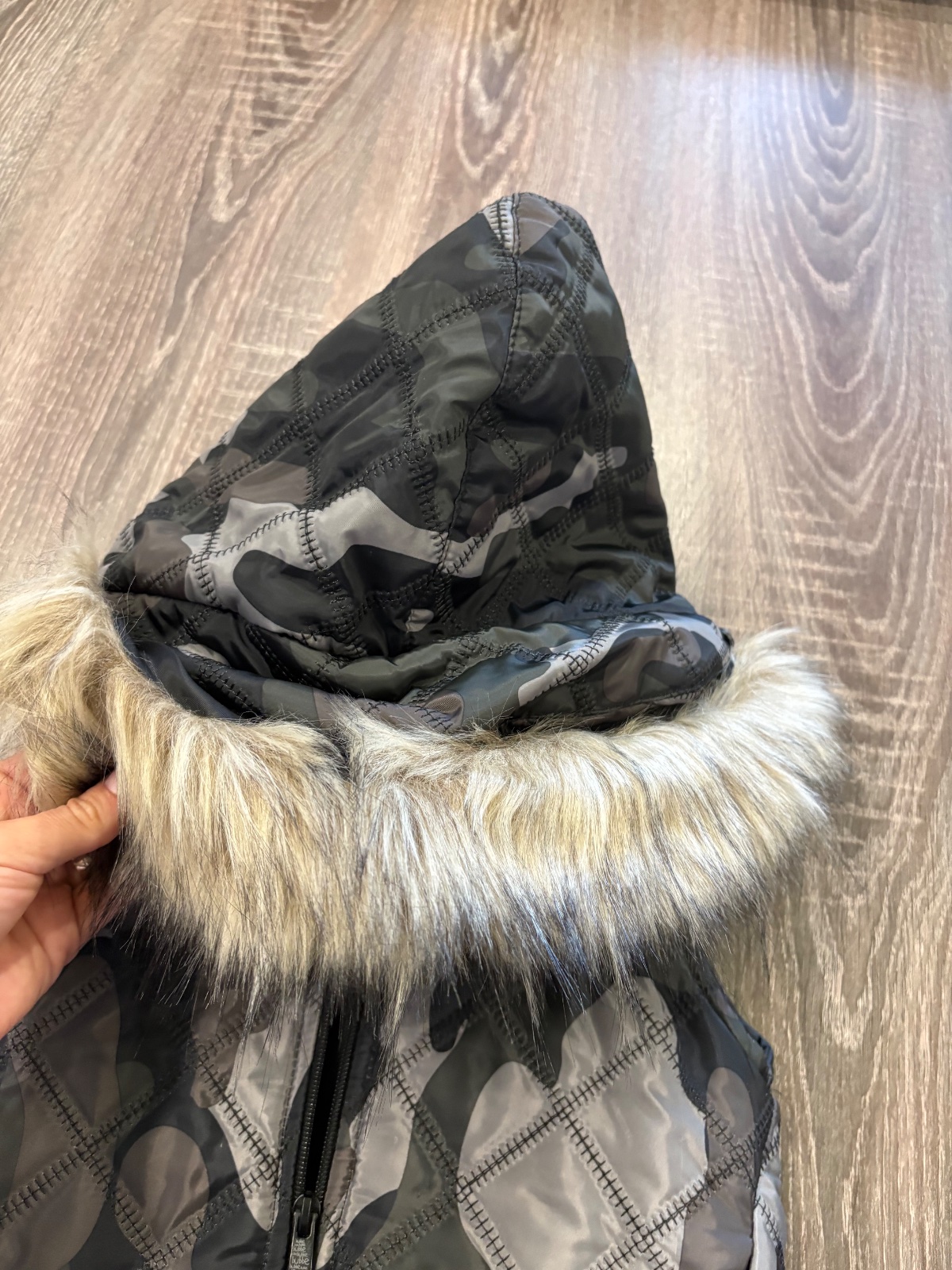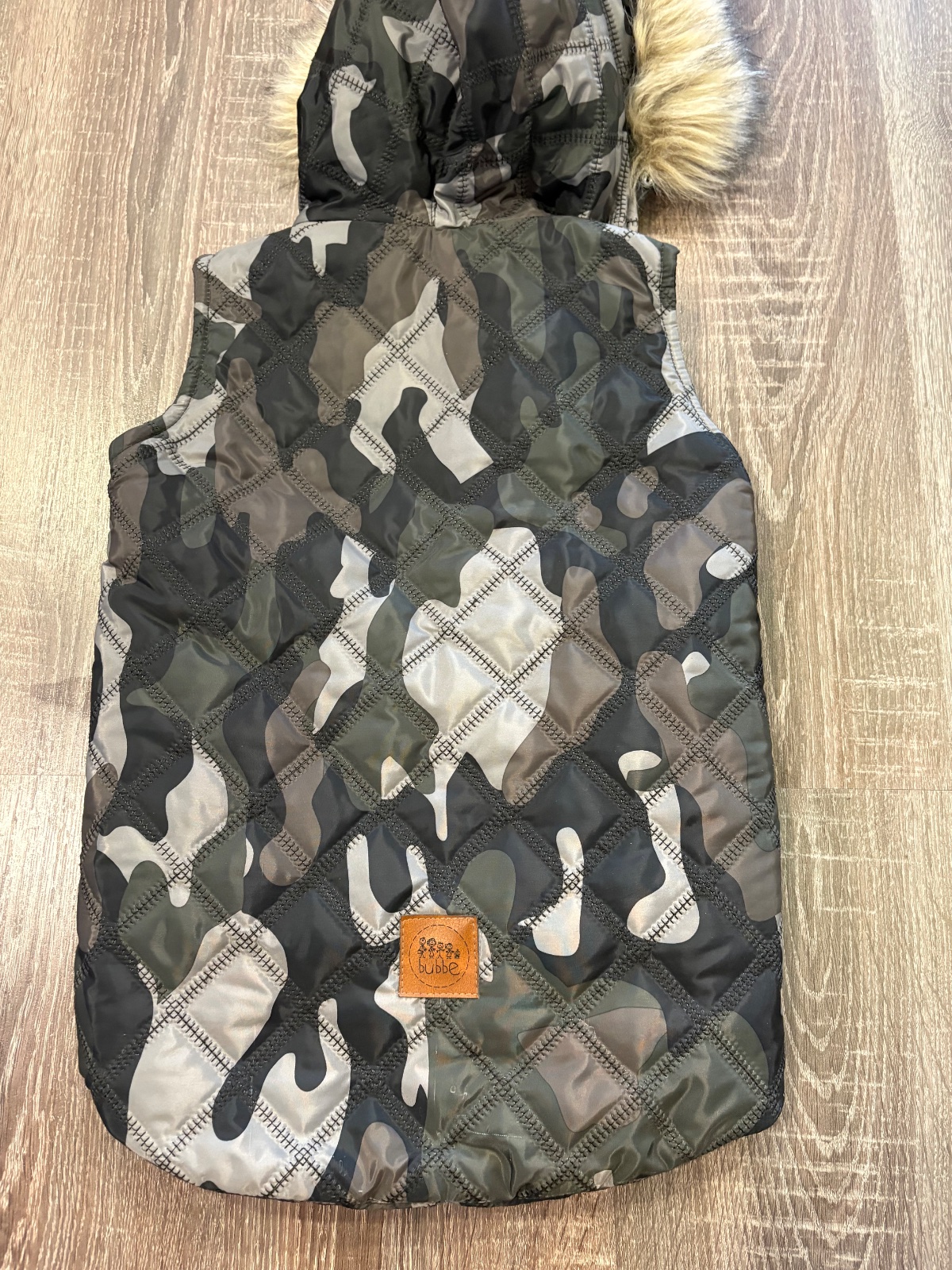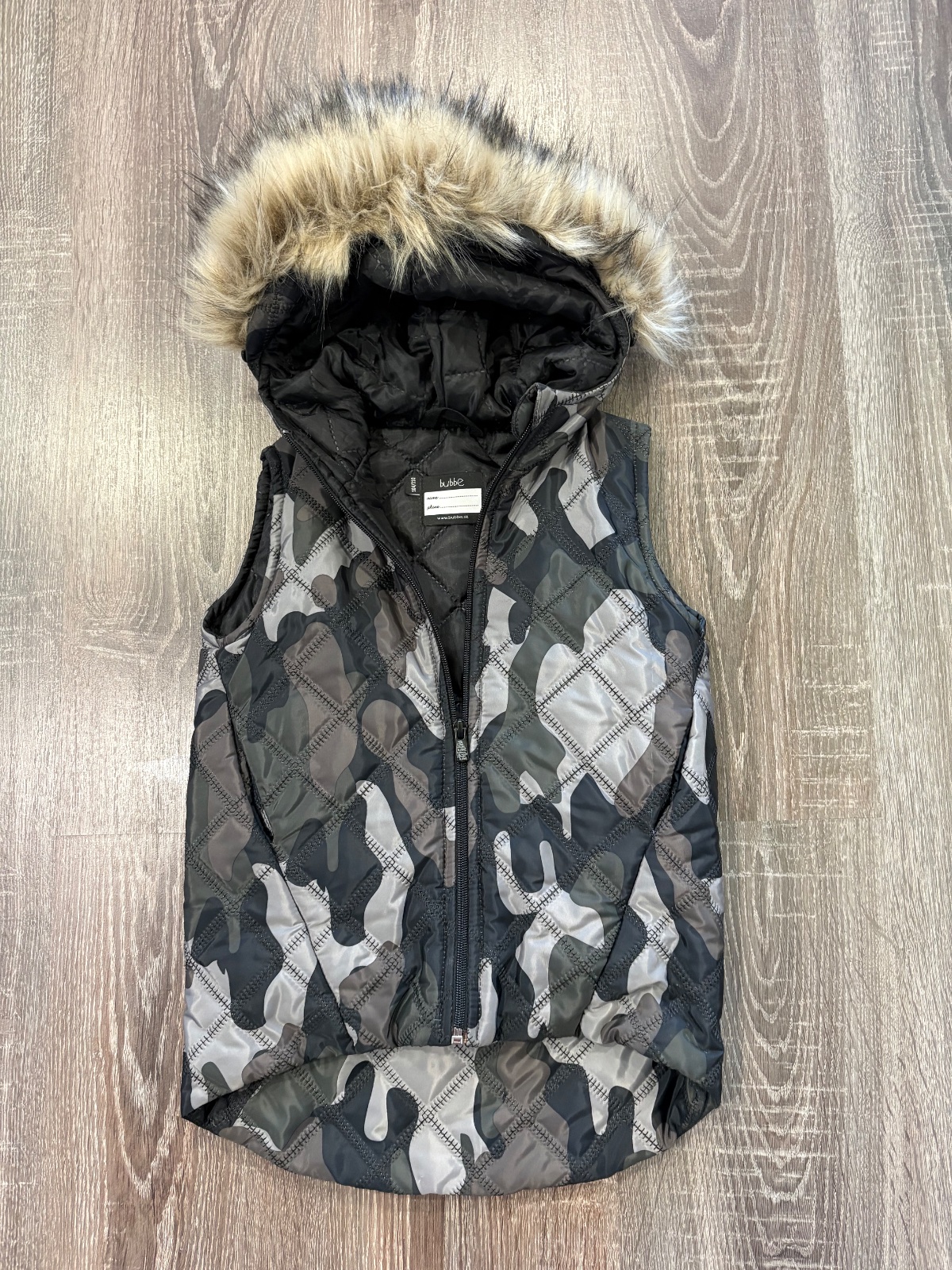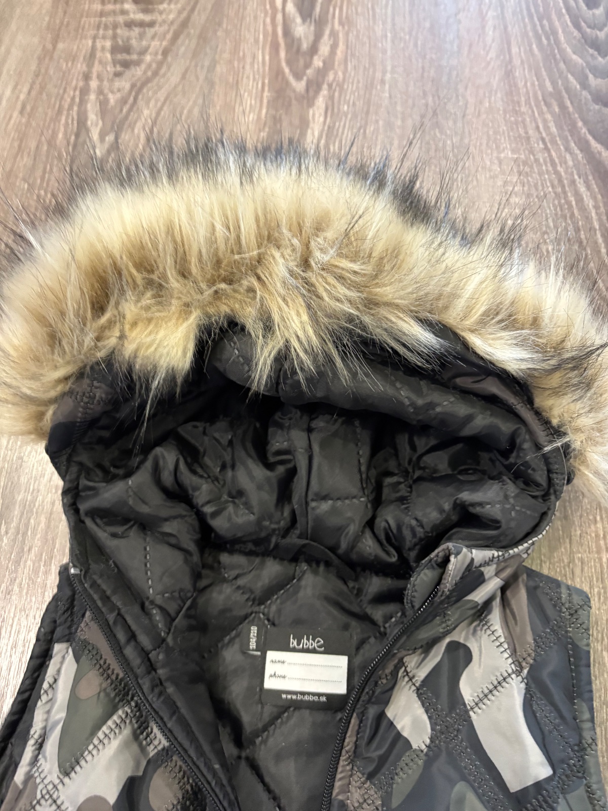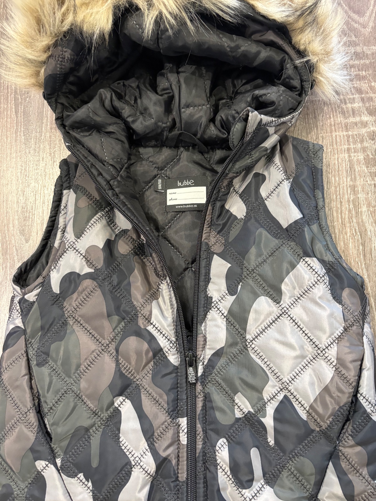 05.Bubbe štylova predlzena vesta bez rukavov,na kapucni kozušinka ktora sa da odopnut.Velkost 104/110,no vynosite dlhsie.Dlzka prednej casti je 44cm,zadnej casti je 54cm ,sirka v podpazusi je 36x2cm