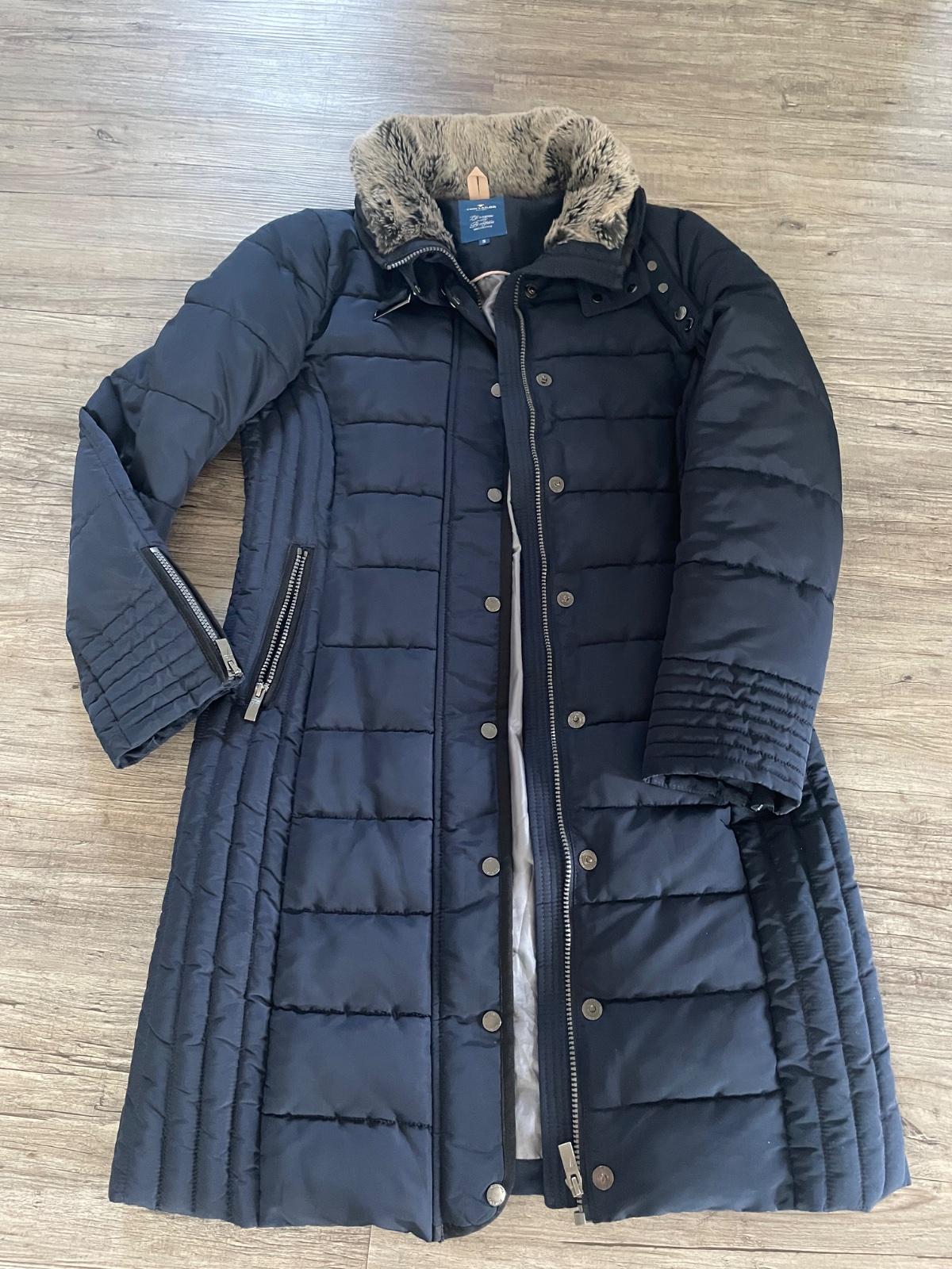 pekná tlmená tmavomodrá farba s výraznými bielymi zipsami, prešívaná, teplá, s krásnou kožušinkou v celej kapucke. Veľmi dobrý nosený stav bez poškodení, uv. veľ. S dl. 67cm, rukáv od kapucky 73cm,...