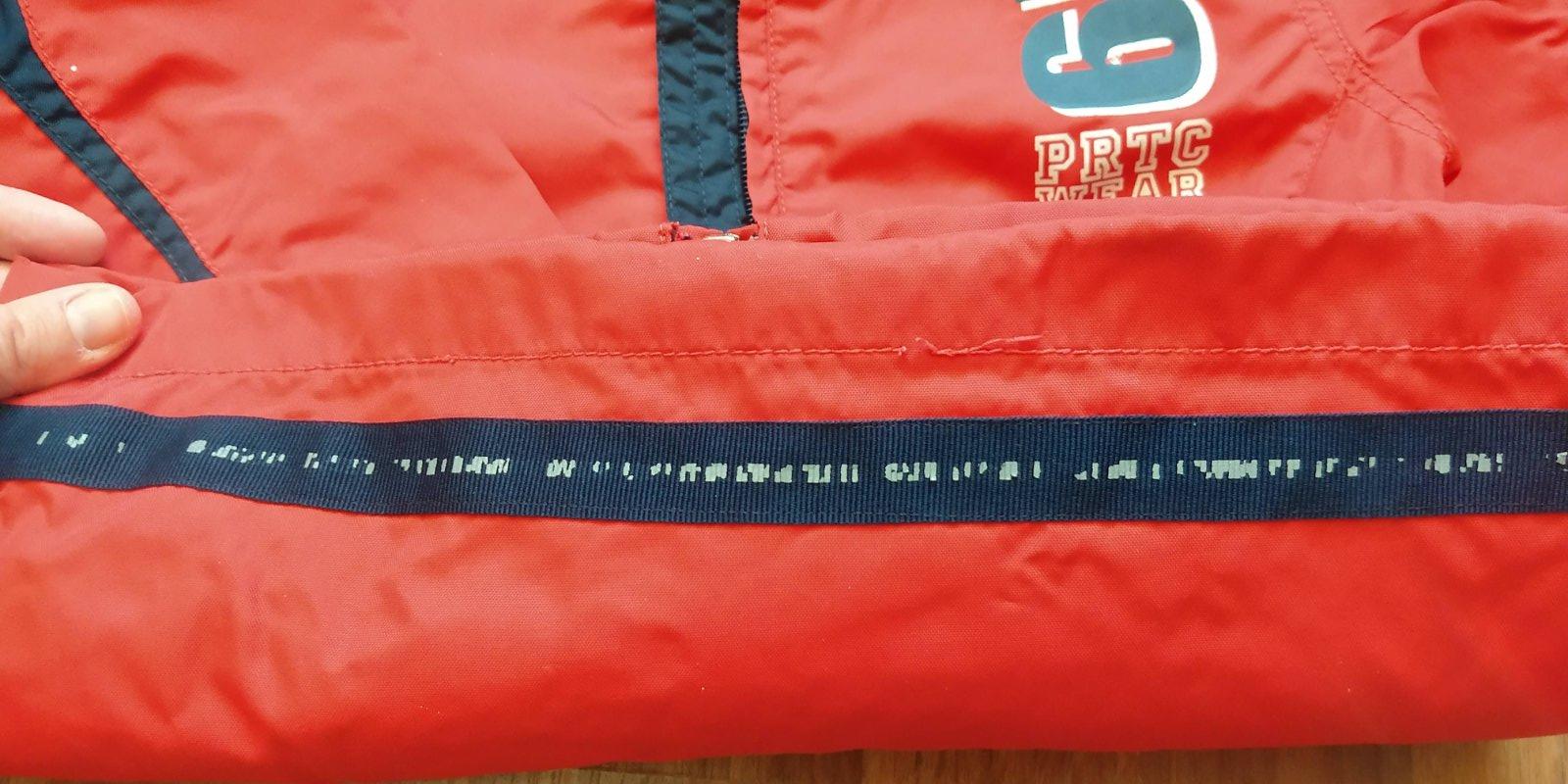 Používaná vetrovka, materiál šuštiakovina (čiastočne neprefúka, čiastočne zadrží vodu). Bežné známky nosenia. Miestami nápis zničený (foto), bez funkčného poškodenia. Kapucňa sa dá odzipsovať.