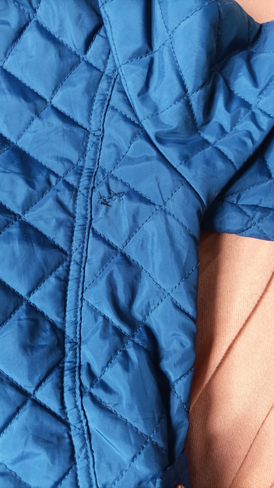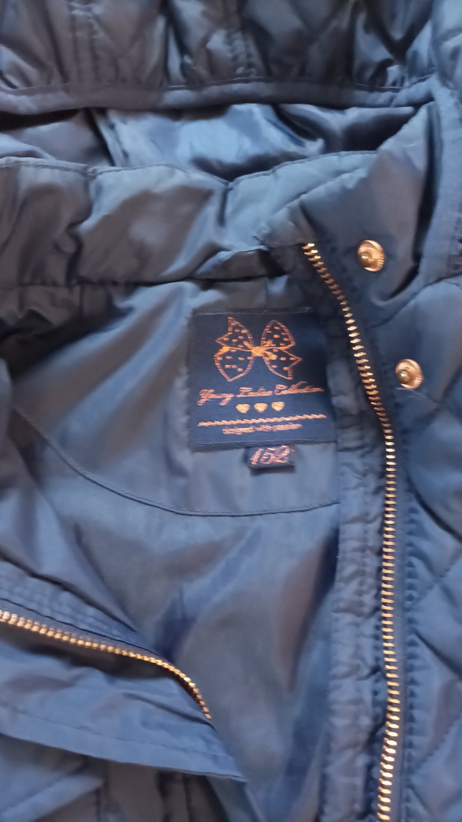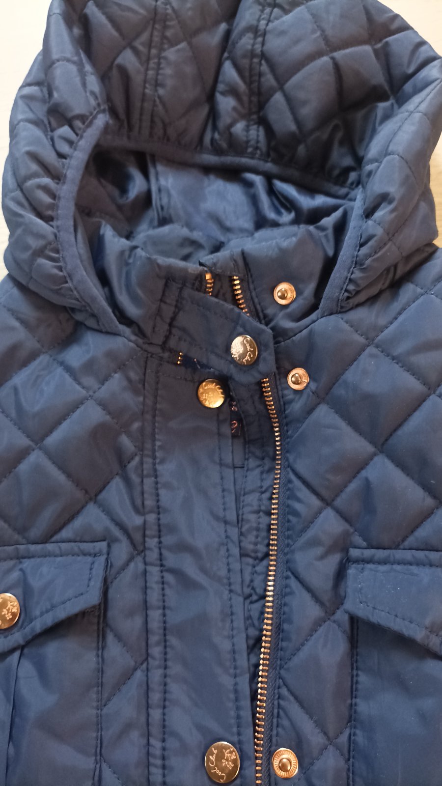 Dievčenská prechodná bunda. Vzadu pod rukávom je trošku zašitá, nie je to veľmi vidieť. Rozmery: celková dĺžka 57 cm, šírka cez prsia 42 cm, šírka cez pás 38 cm, dĺžka rukáva 54 cm.