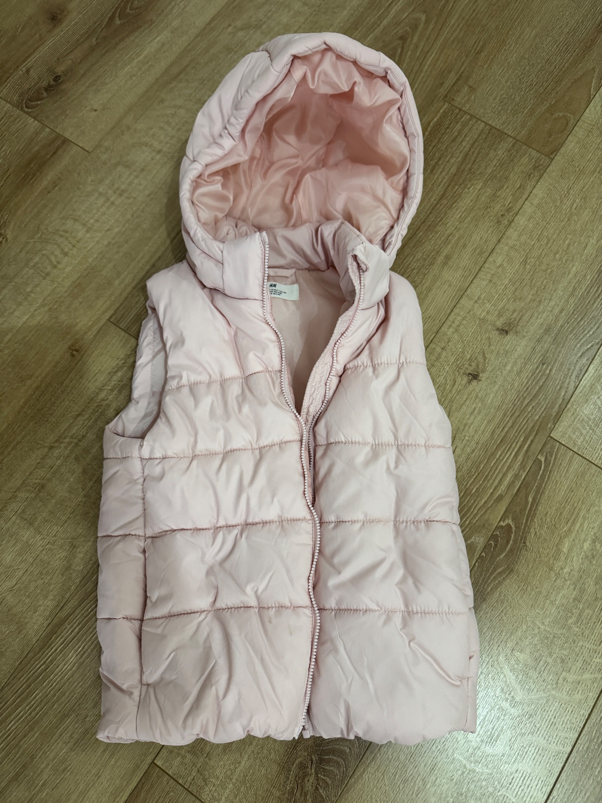 Predám malo nosenu vestu po dcére dvojvelkost 122/128. Poškodenia som nenašla. Farba je pekná svetloruzova, na foto vyšla sedoruzova. Kapuca sa dá odobrať.