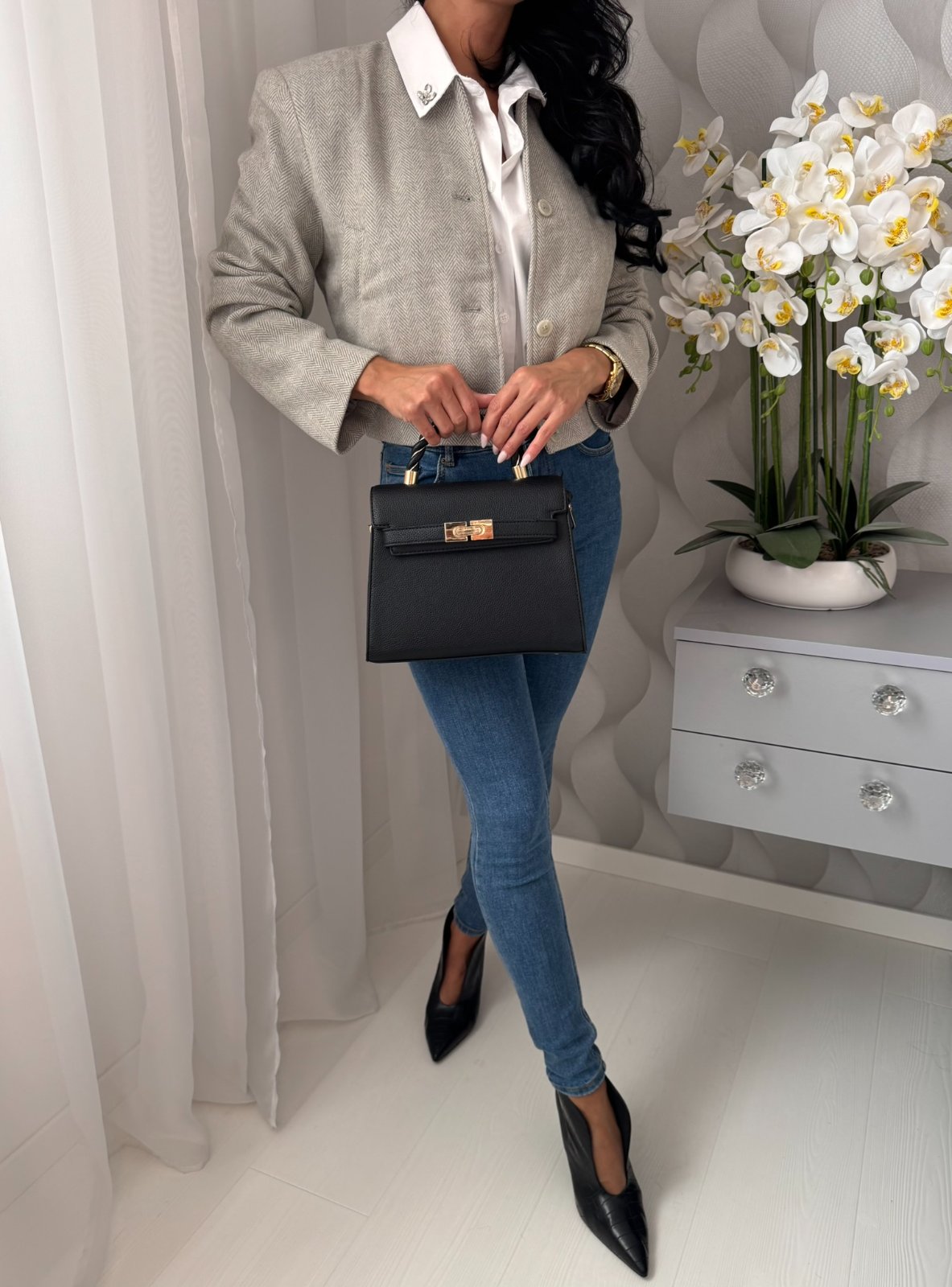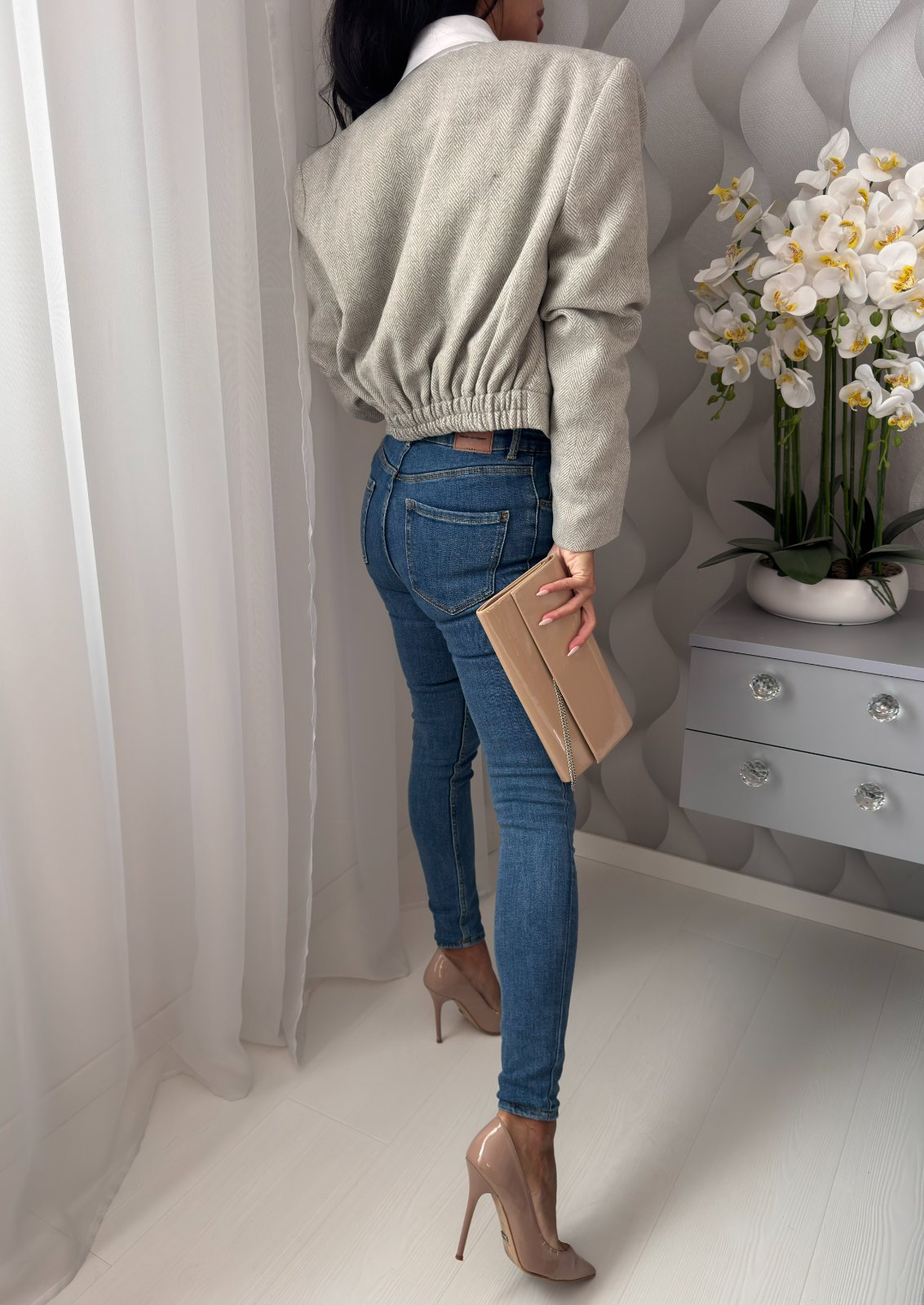 Krátka bunda voľného strihu z tkanej látky s okrúhlym výstrihom, zapínaním na gombíky a vypchávkami na pleciach.