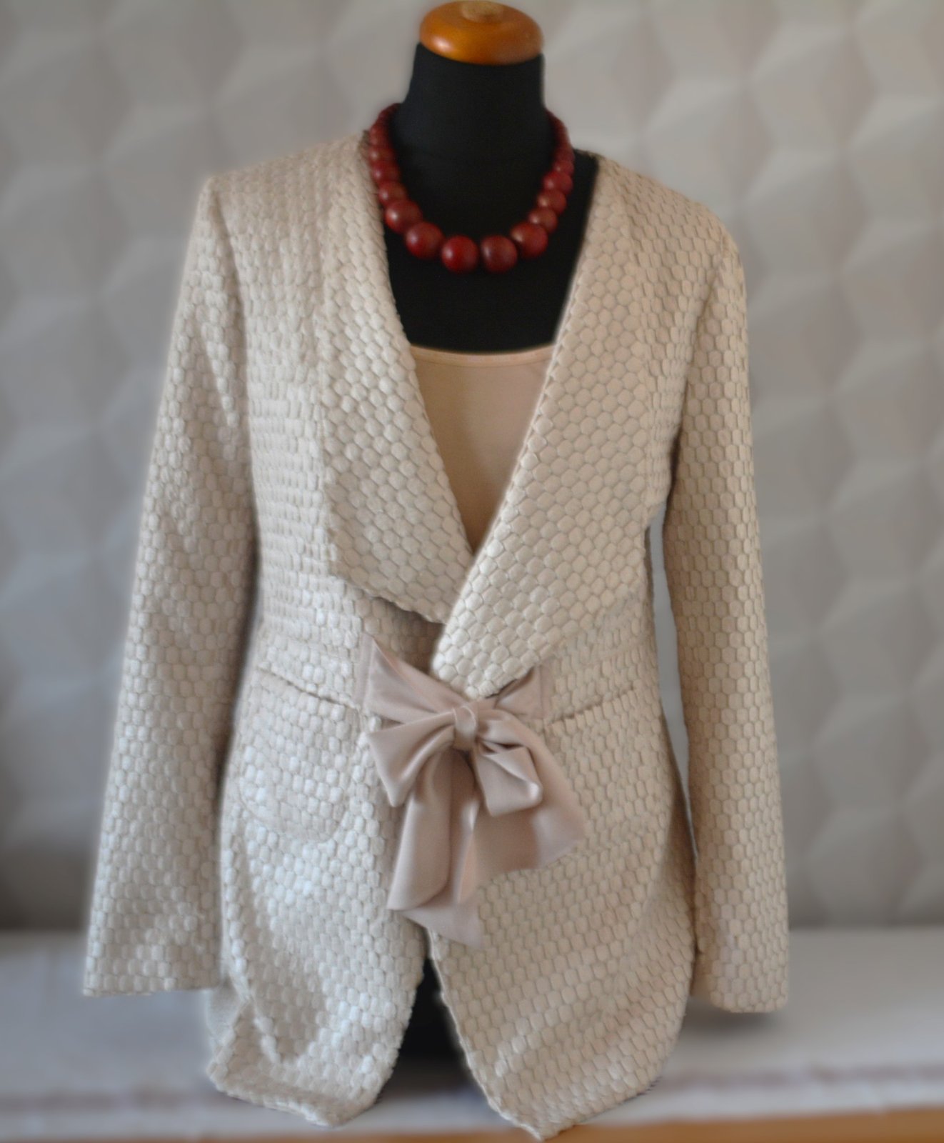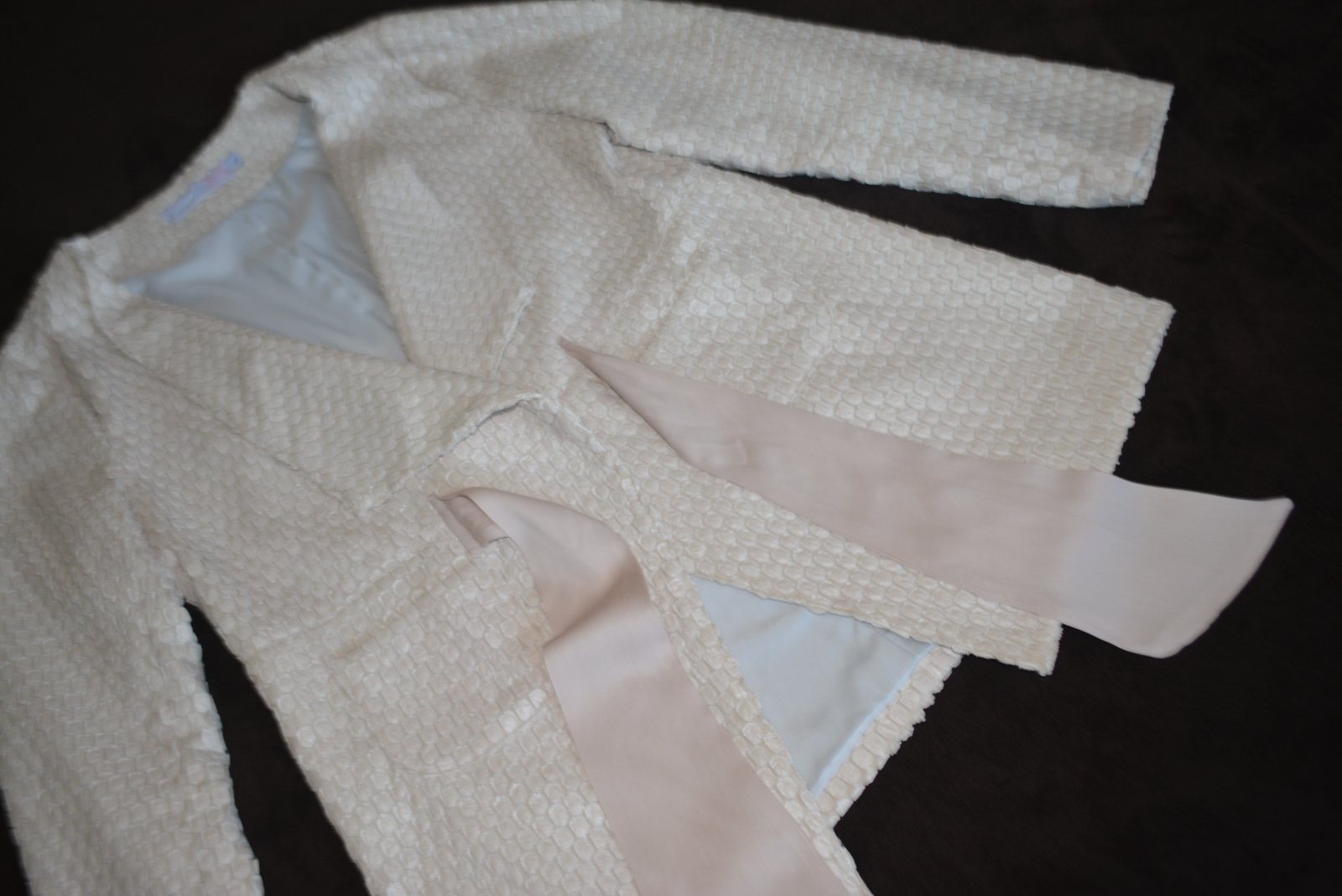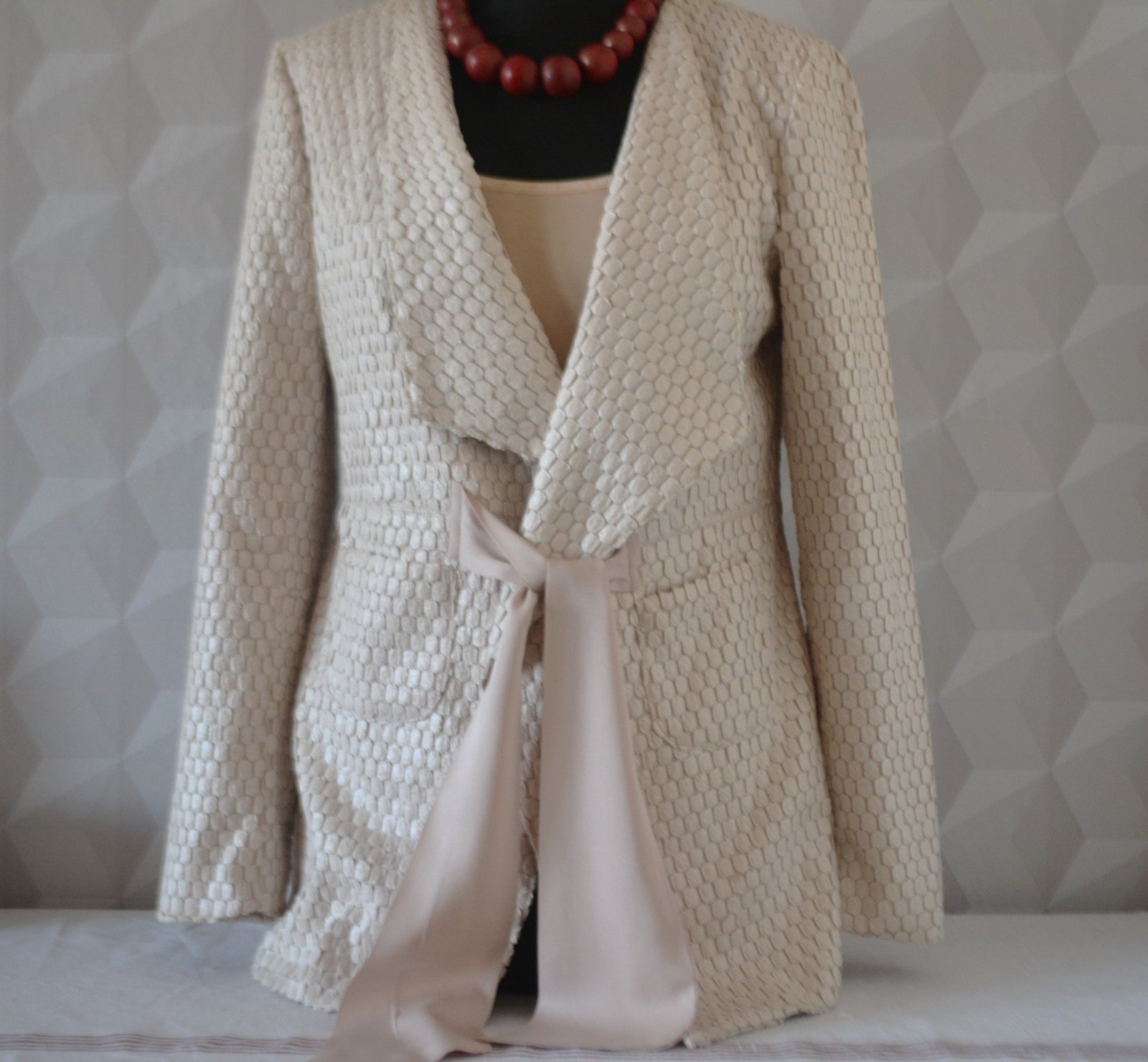 Sako je veľmi pekné, kvalitné. Štruktúra látky a hodvábna stuha mu dávajú punc elegancie.