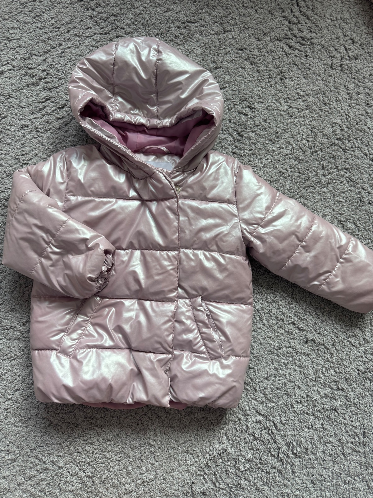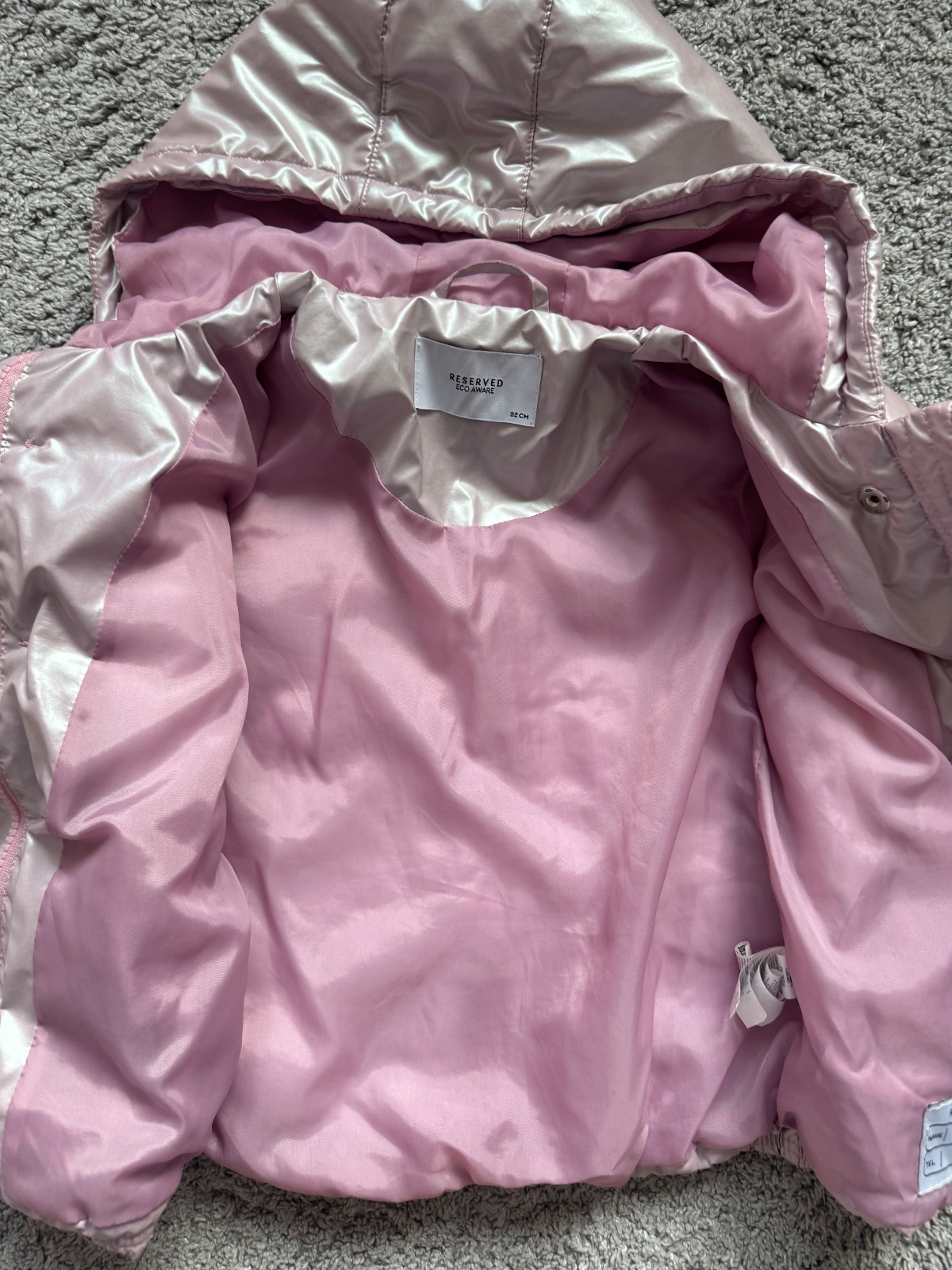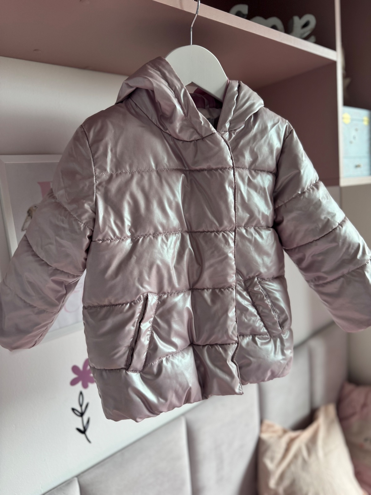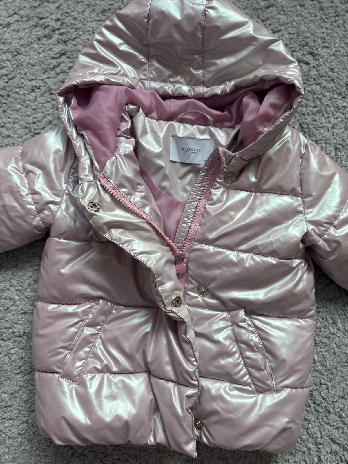 Nosená bundička, pekný stav. Ponosíte aj 98. Oblečená vyzerá naozaj dobre, je moderná. Farba jemná, ružovo-fiaľová.
