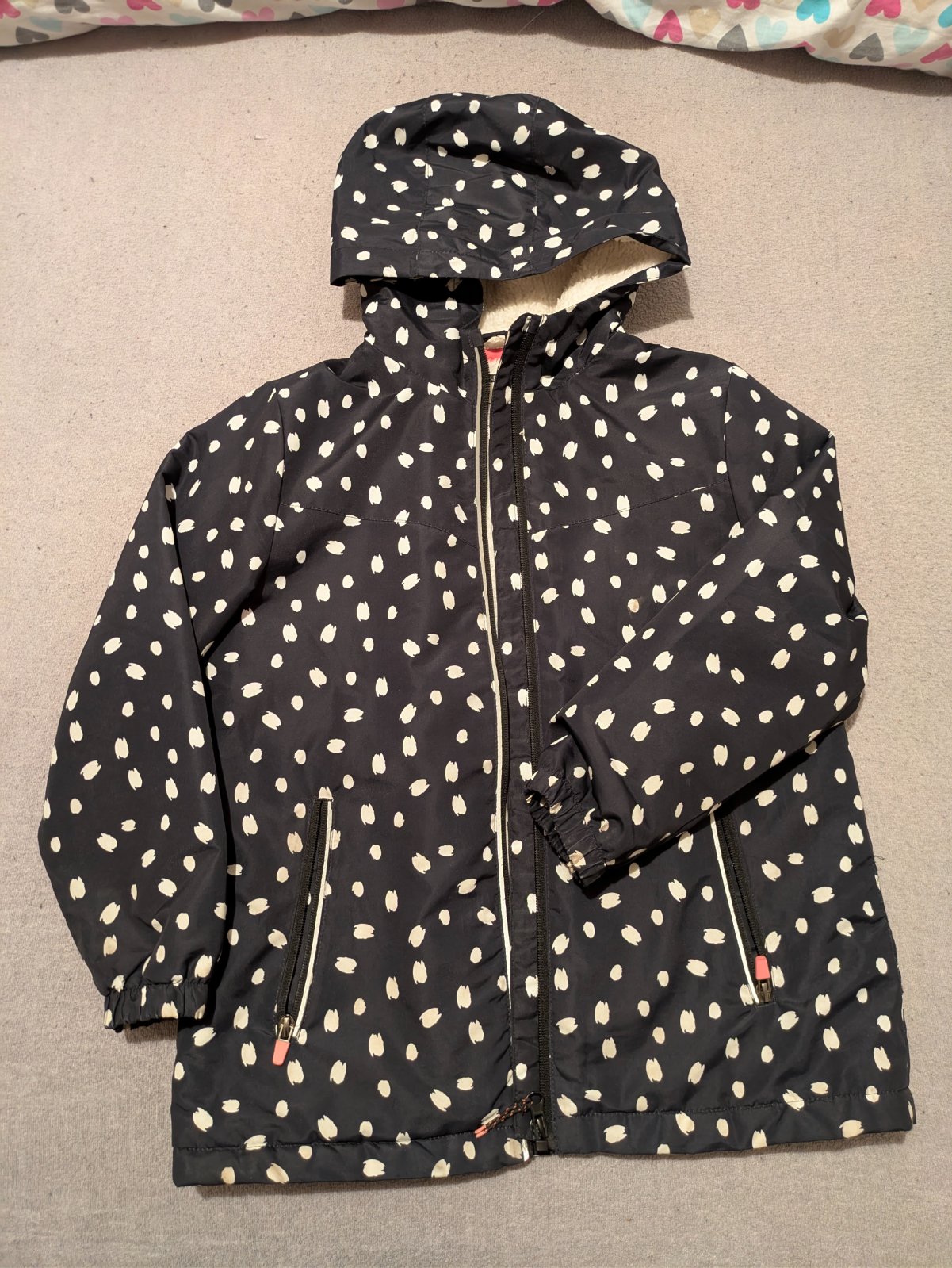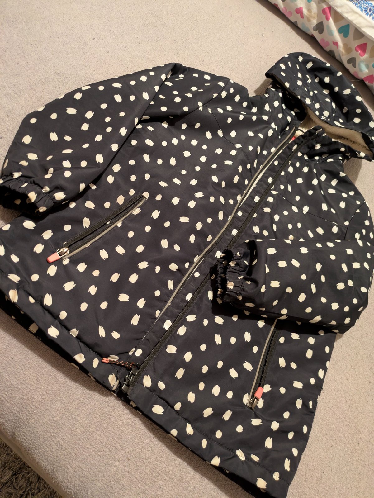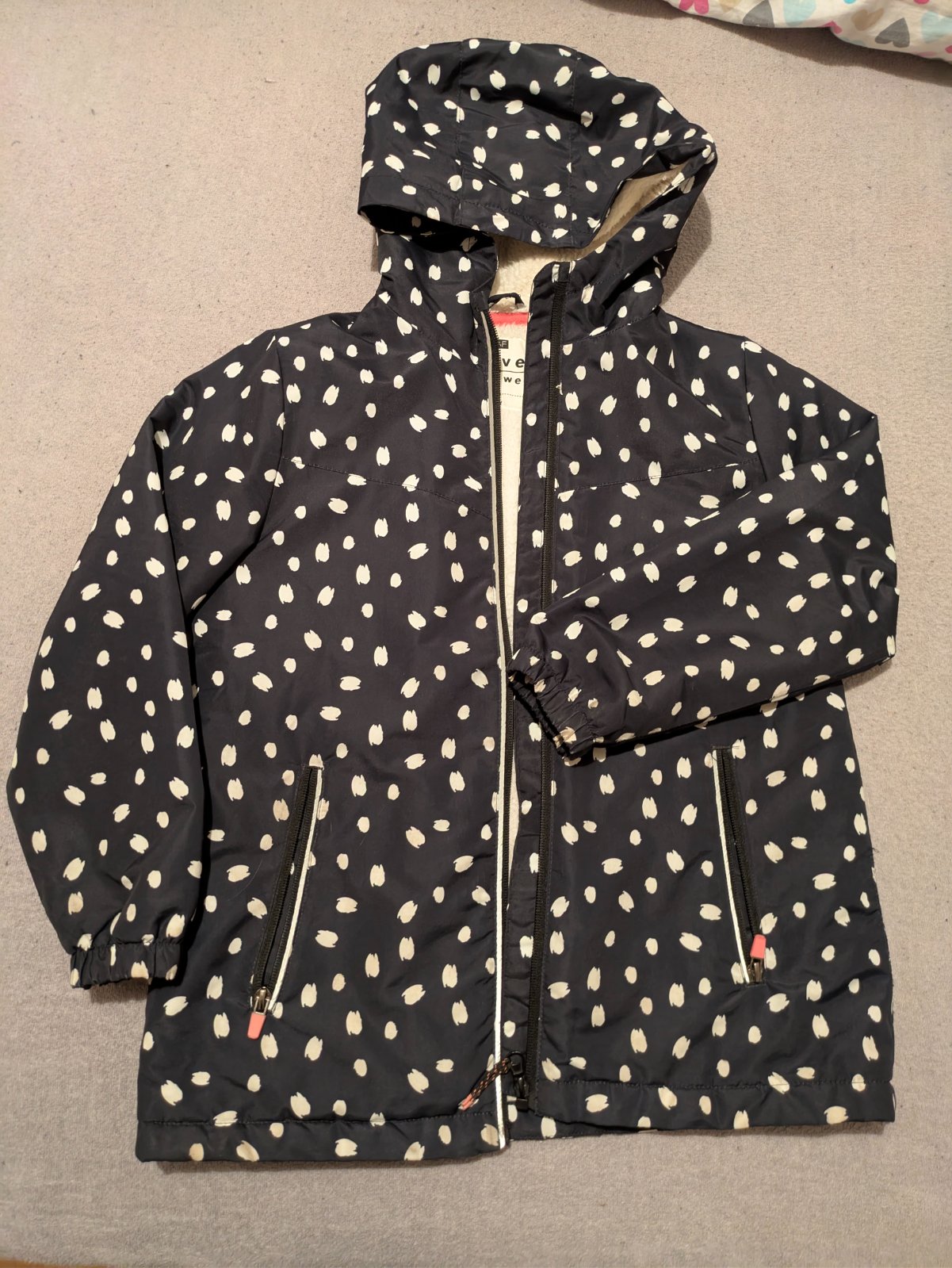 Krásna jesenná bundička pre malú slečnu. Zateplená teplou kožisinkou, nepremokavá. Bez poškodení . Veľkosť 8-9 rokov, ( 128/134 ) veľkosť sedi .