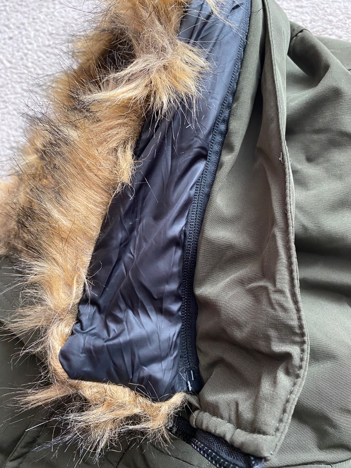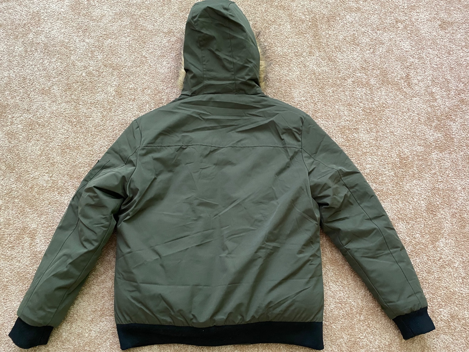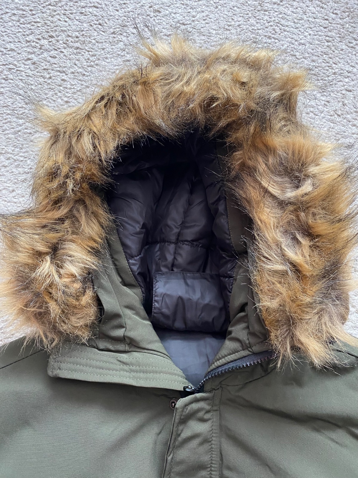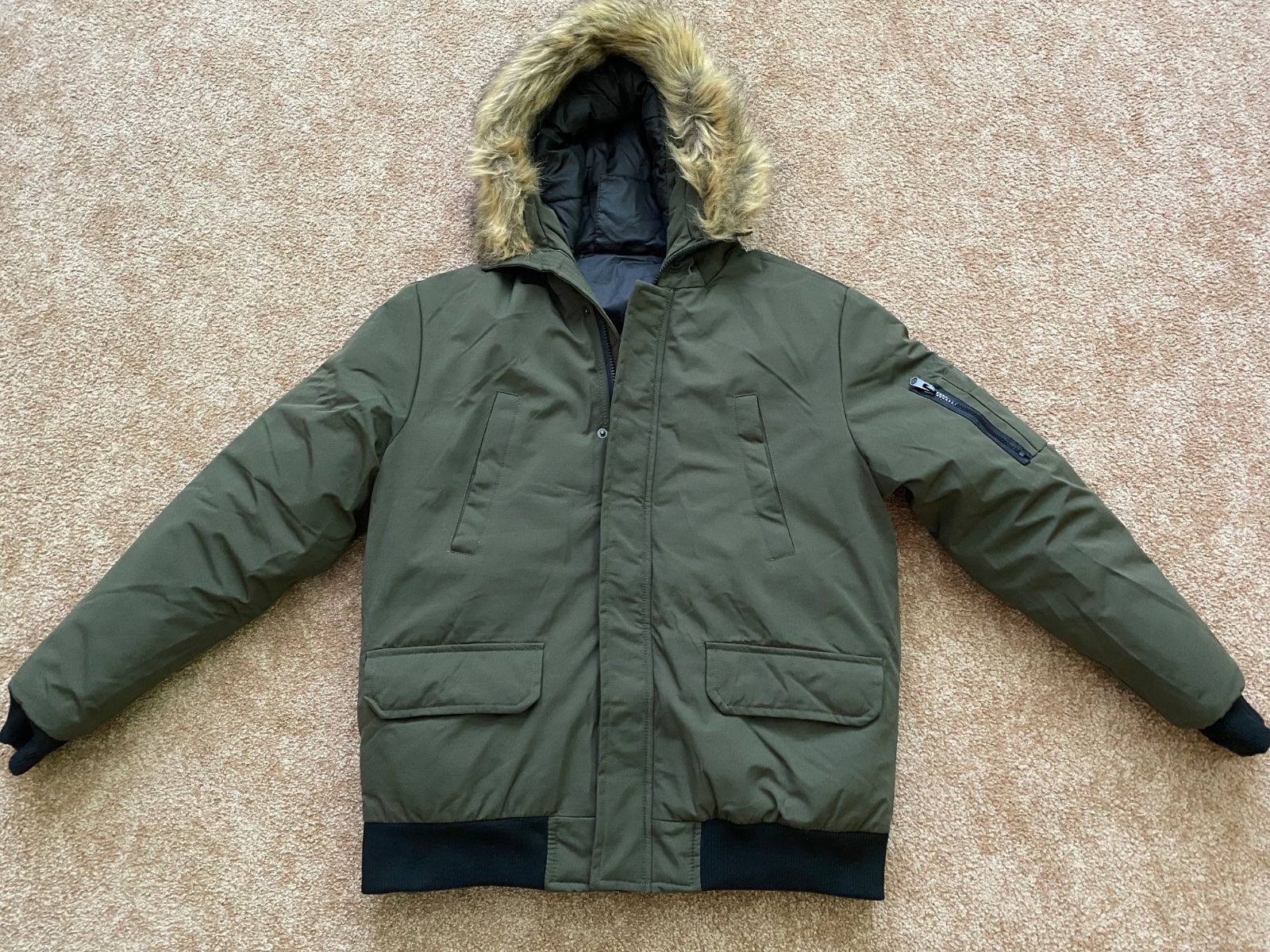 Predám krásnu nenosenú bundu, nesadla nám veľkosť a nestihli sme vrátiť. Vojenská tmavozelená farba, kapucňa napevno ale kožušinka sa dá dať dole. Rozmery sú na foto. Veľkosť XL. Jedna chyba - cvok na vačku - viď foto.
