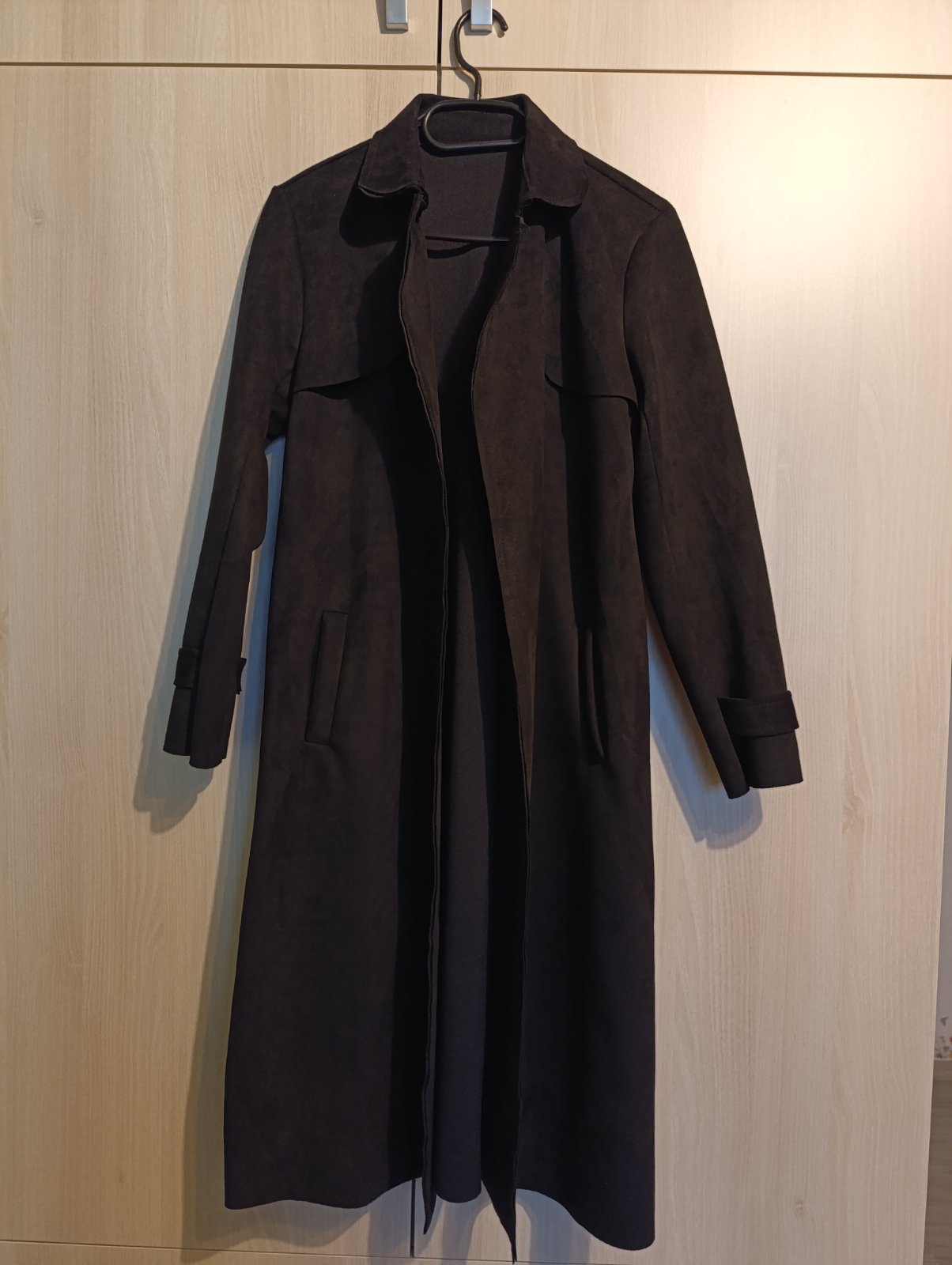Dámsky kabát bez zapínania s opaskom.