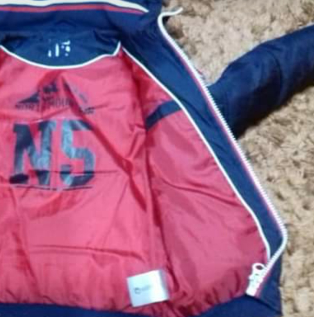 Pár malých opotrebovani na rukávoch,malička dierka pod rukou.podla mňa nič strašné ,synček ju nosil normálne do školy.