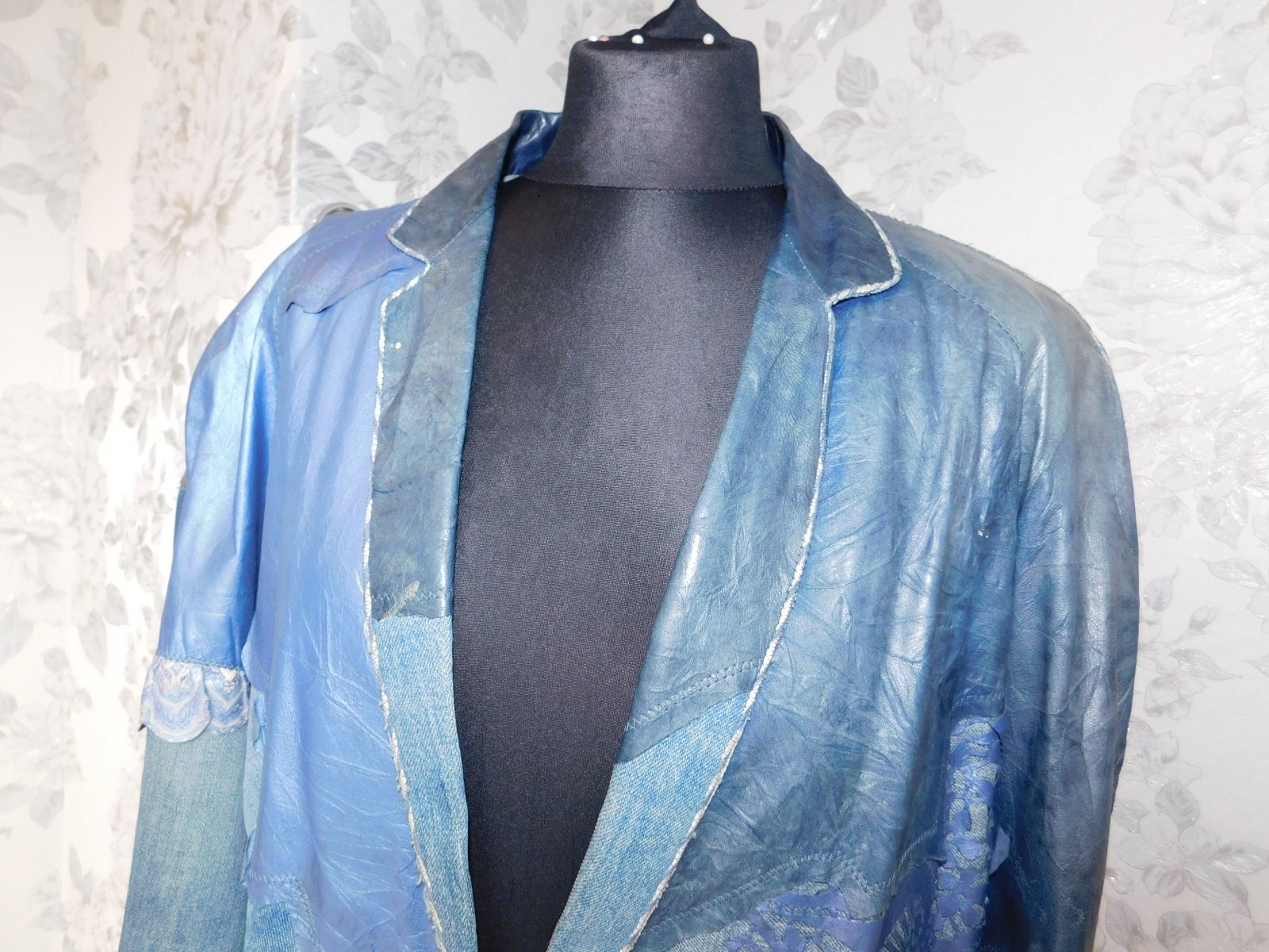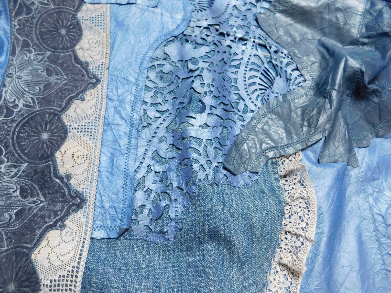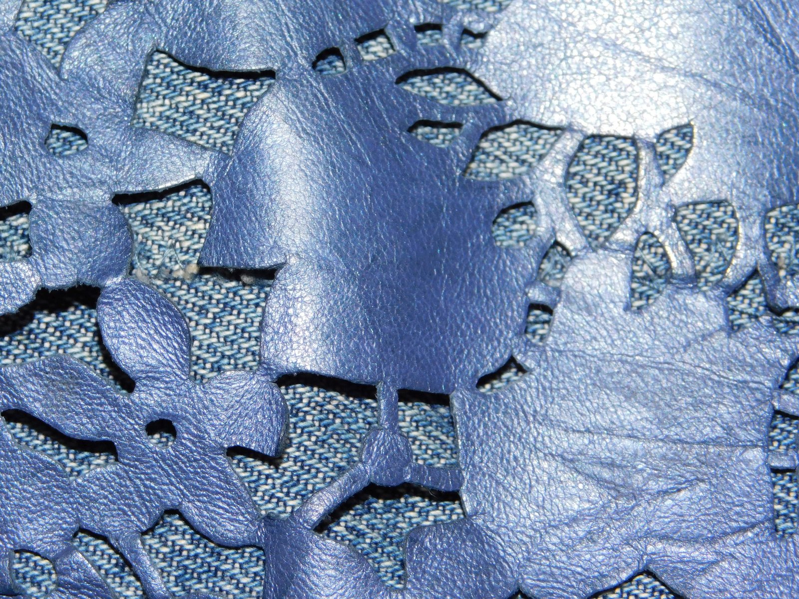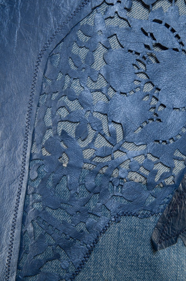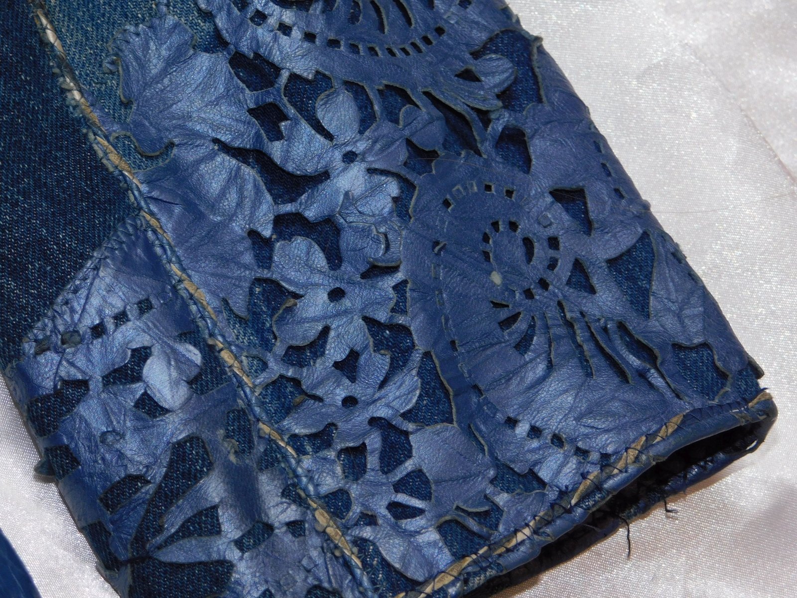 Luxusna vintage bunda,modrej farby,extra jemna perforovana koža kombinovana z riflovinou a čipkou,s podšivkou,zapinaie na 2 cvočka.100%prava koža,100%cotton.super stav.