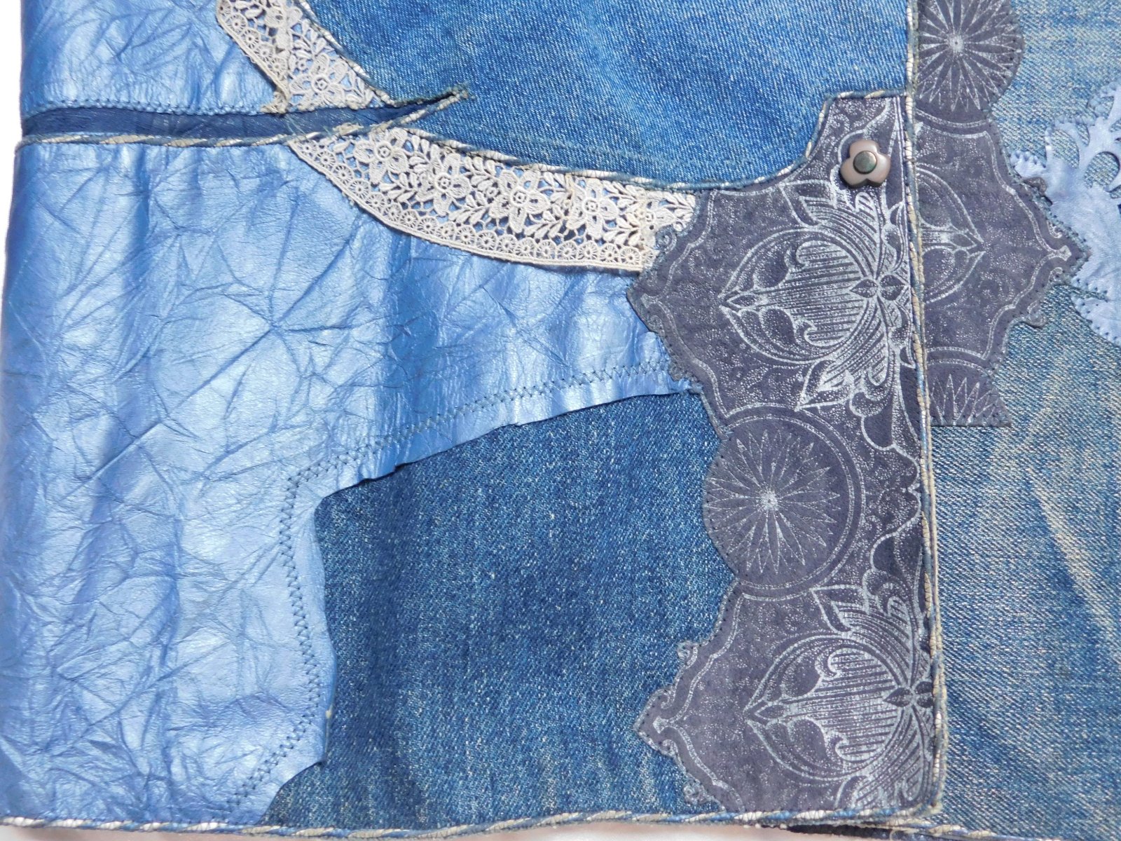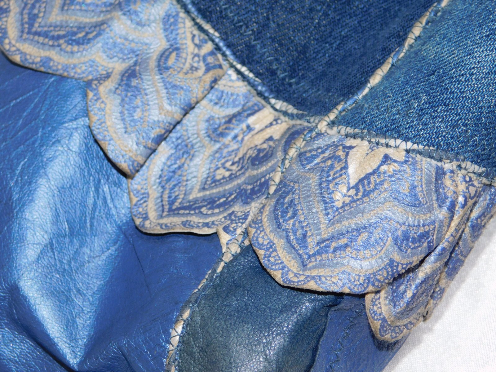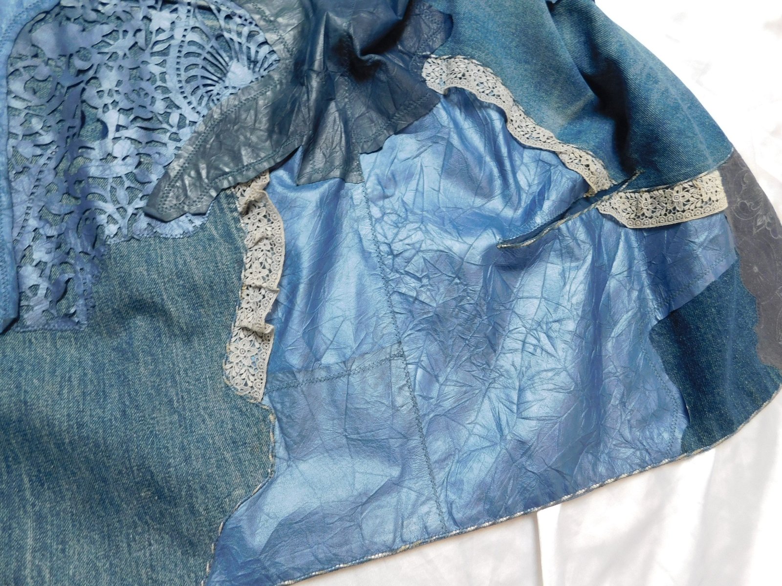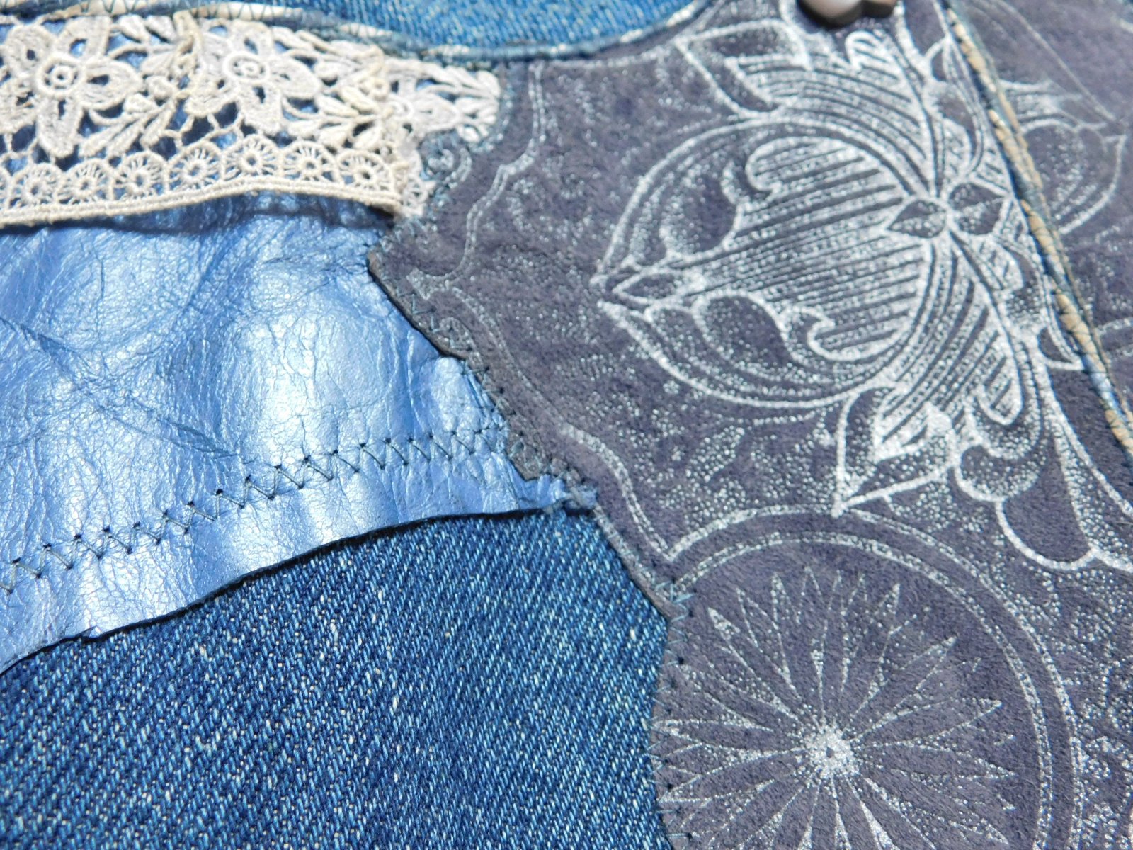 Luxusna vintage bunda,modrej farby,extra jemna perforovana koža kombinovana z riflovinou a čipkou,s podšivkou,zapinaie na 2 cvočka.100%prava koža,100%cotton.super stav.