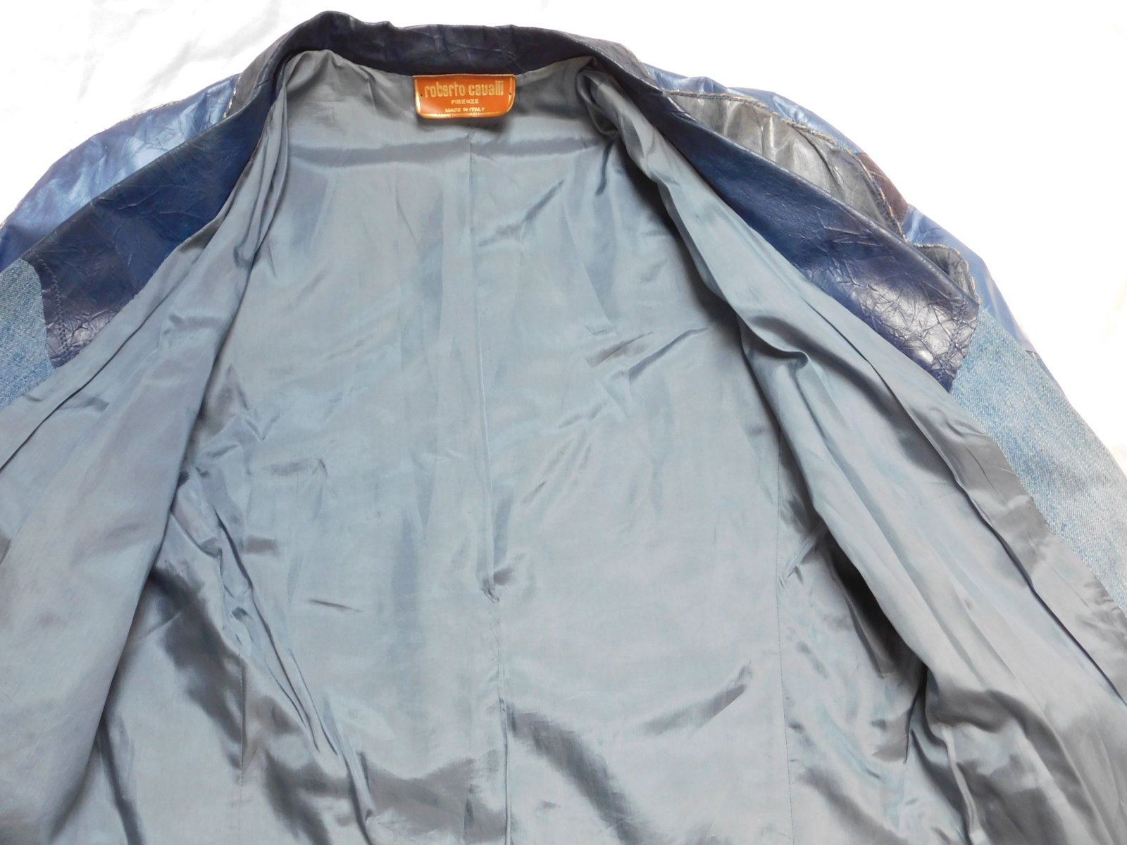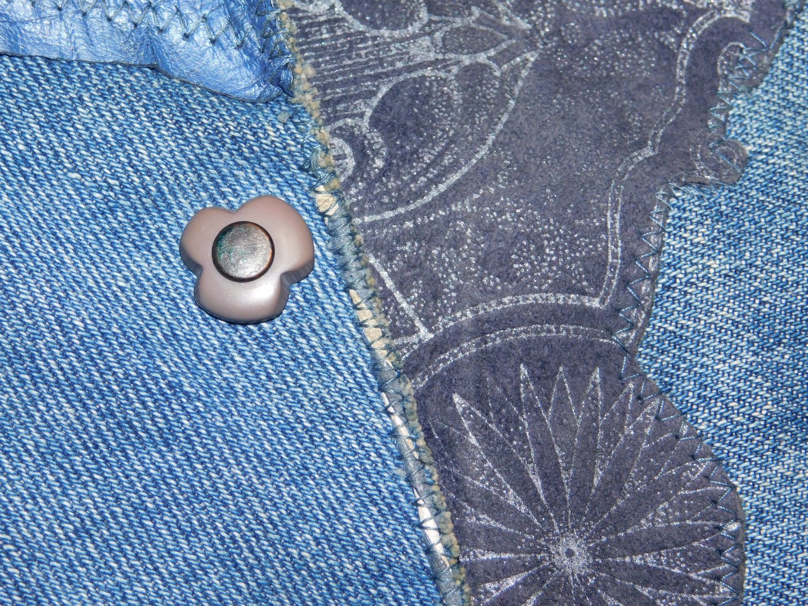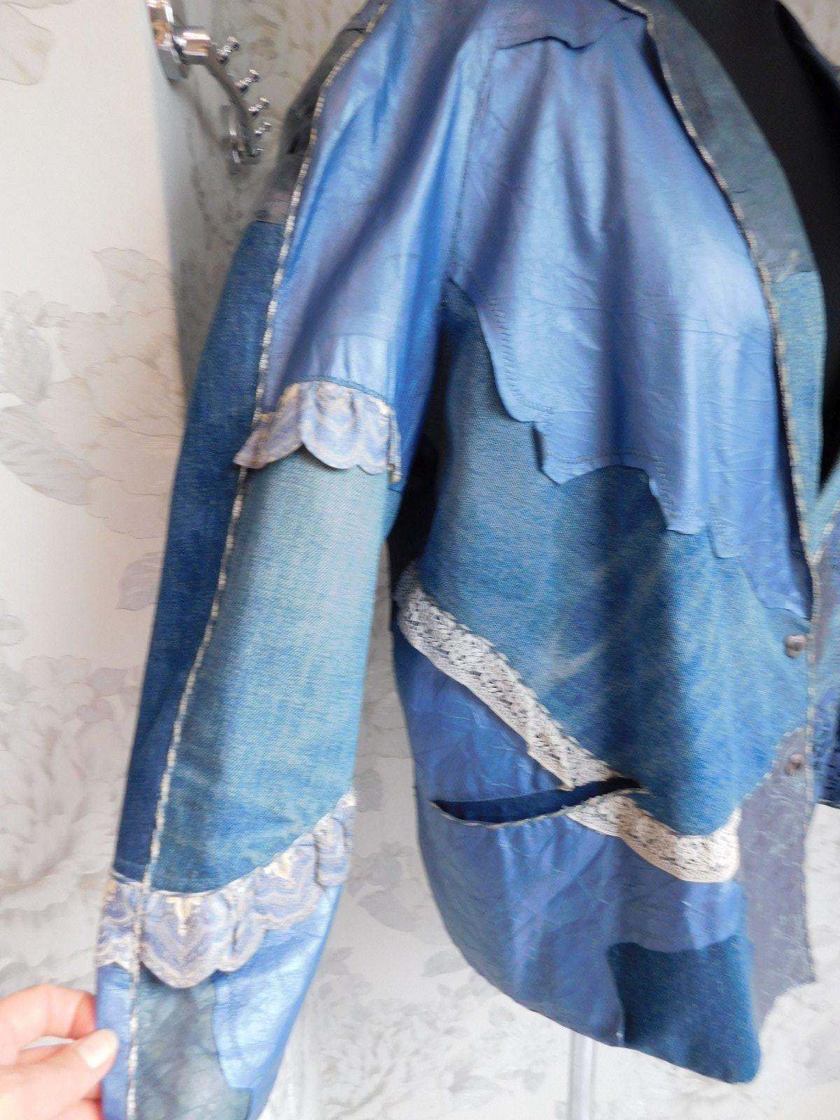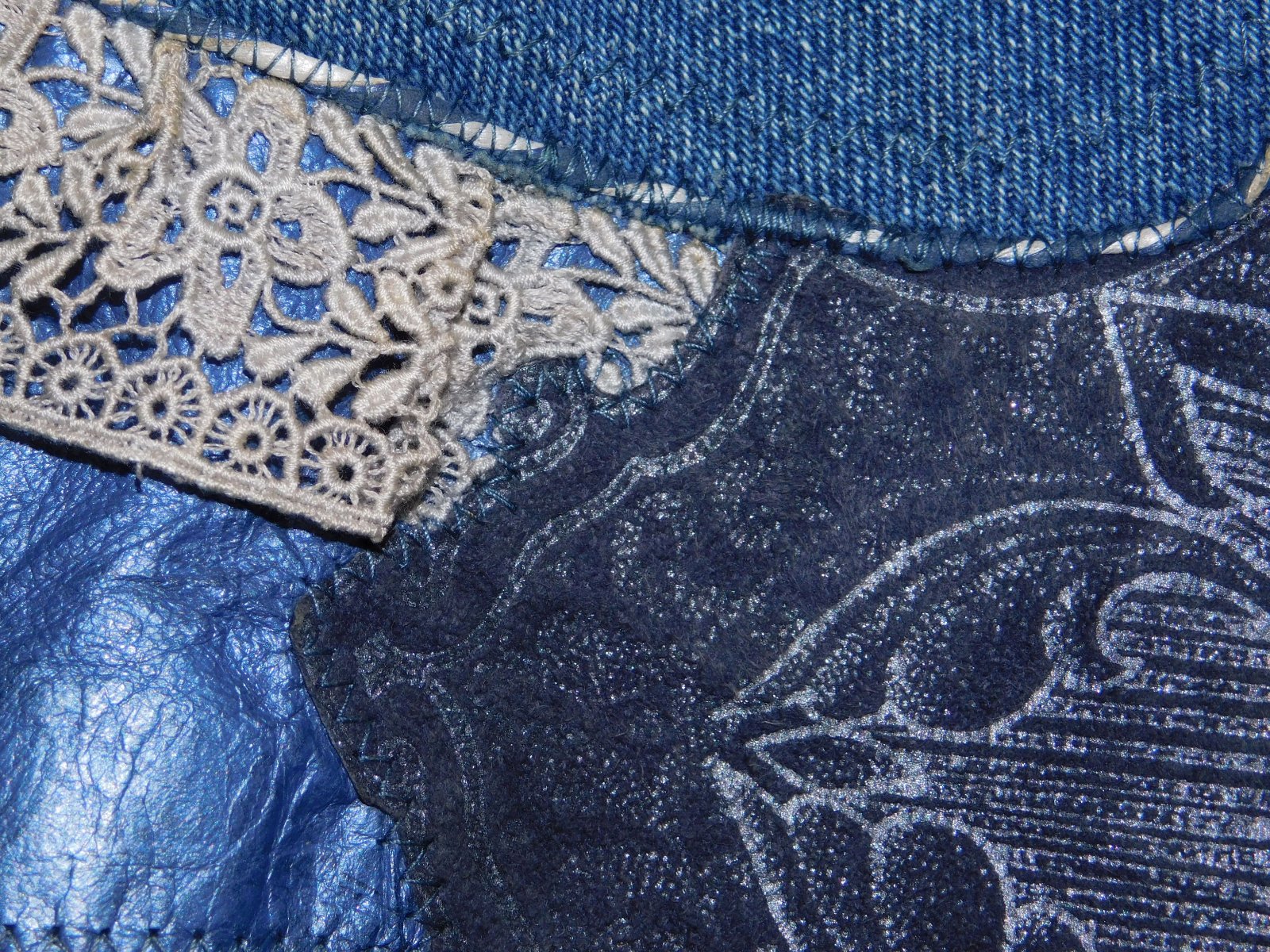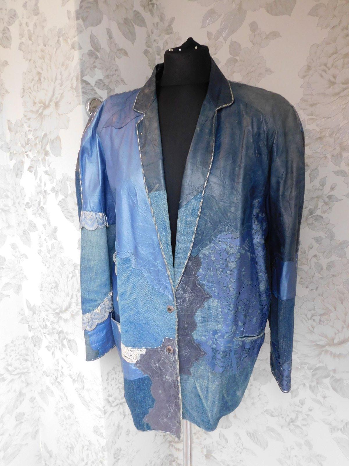 Luxusna vintage bunda,modrej farby,extra jemna perforovana koža kombinovana z riflovinou a čipkou,s podšivkou,zapinaie na 2 cvočka.100%prava koža,100%cotton.super stav.