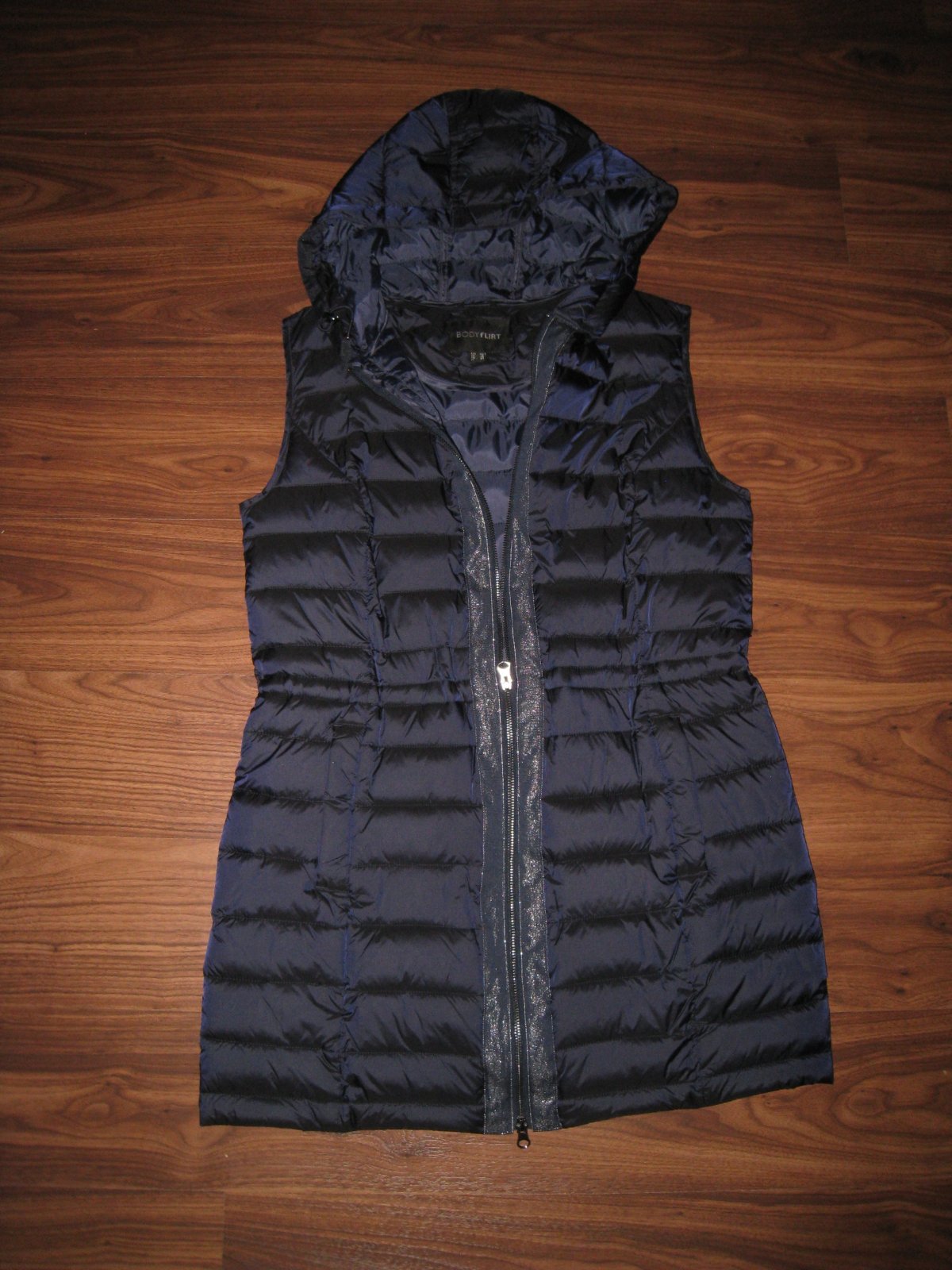 Predĺžená dámska vesta, prešívaná, kapuca na pevno s gumičkou na stiahnutie, v páse s gumičkou na stiahnutie z vnútornej strany, farba tm.modrá, rozmery: dĺžka 82cm, šírka v podpazuší 50cm, asi 1-2x oblečená v top stave.