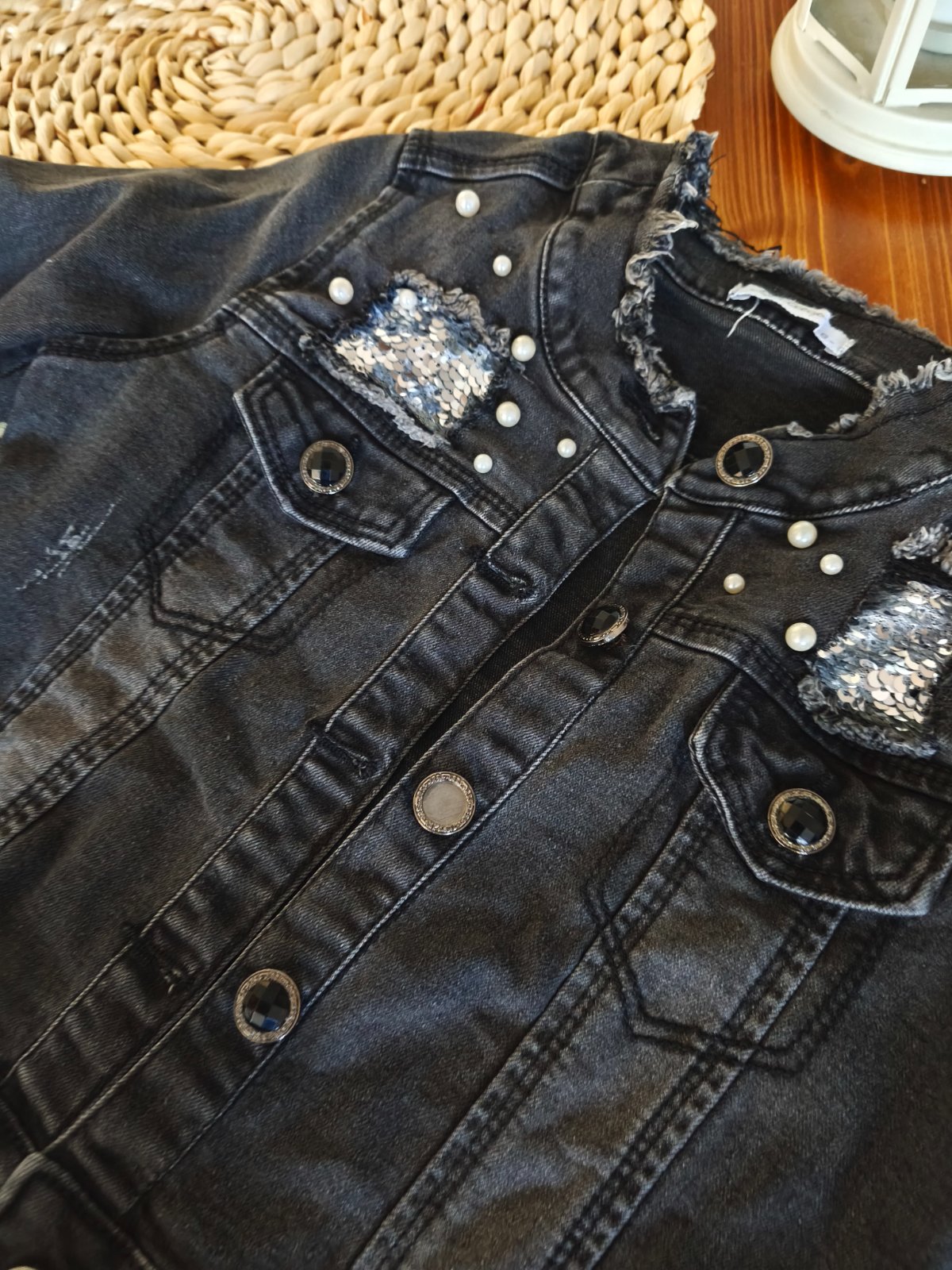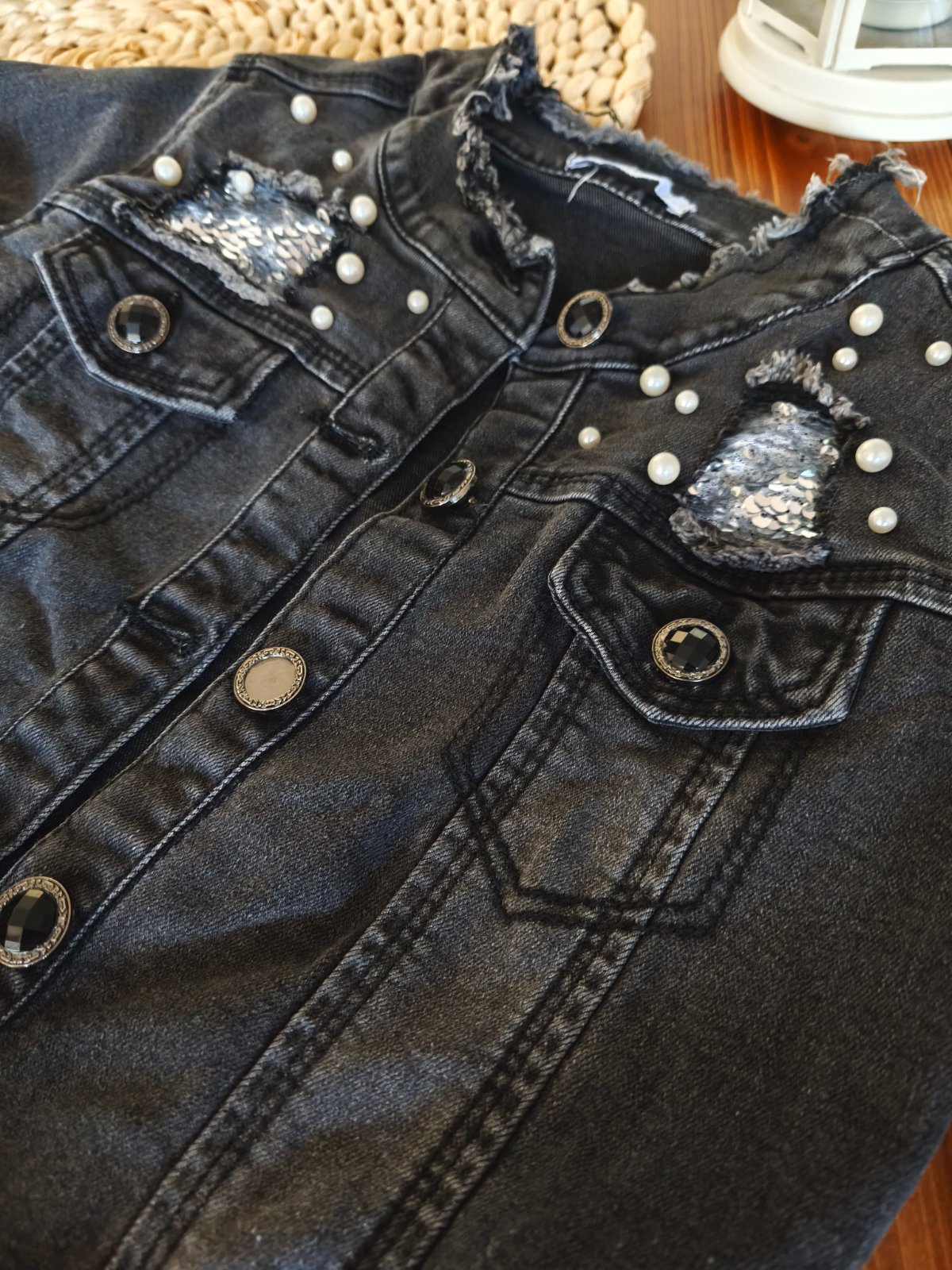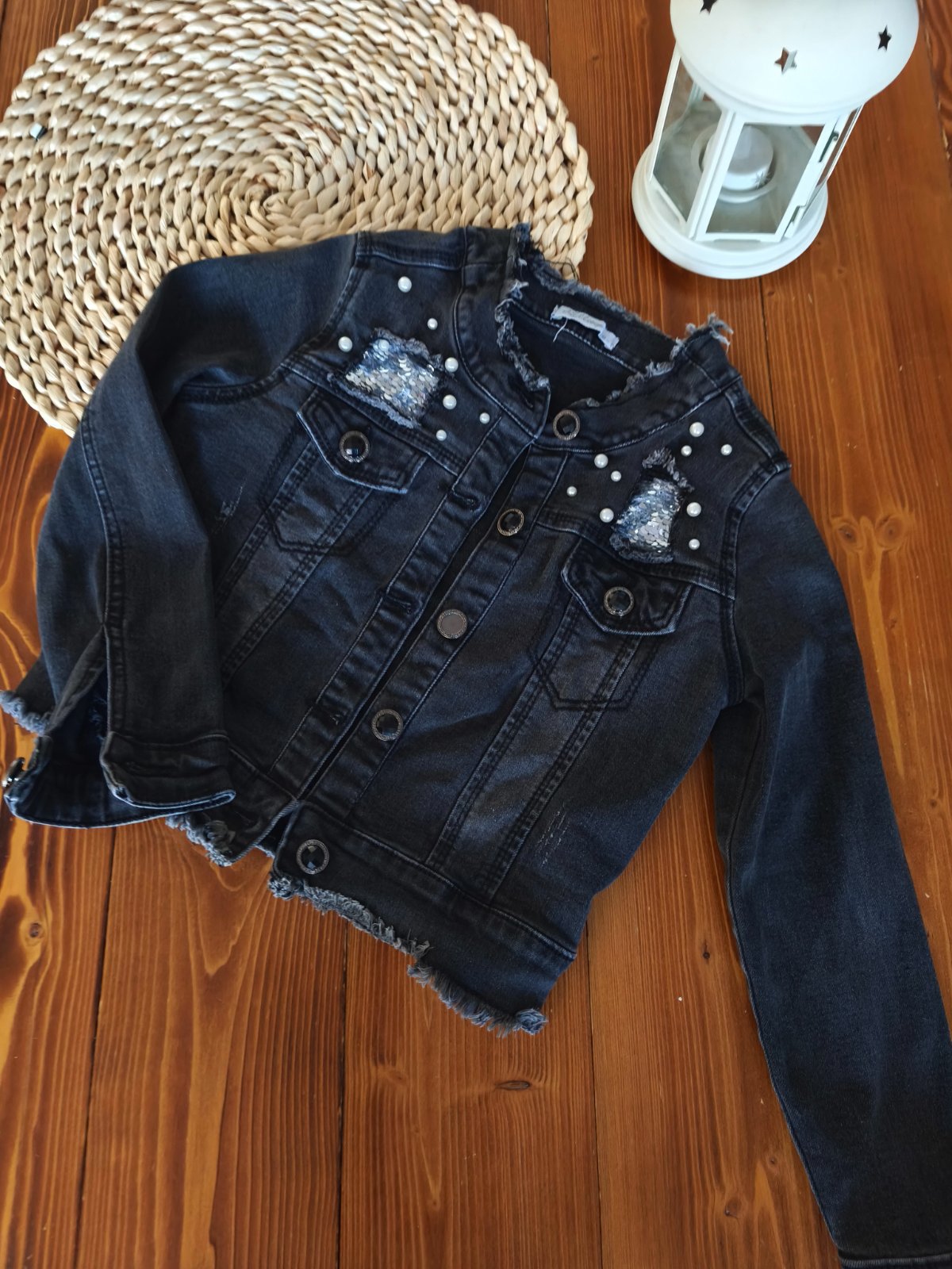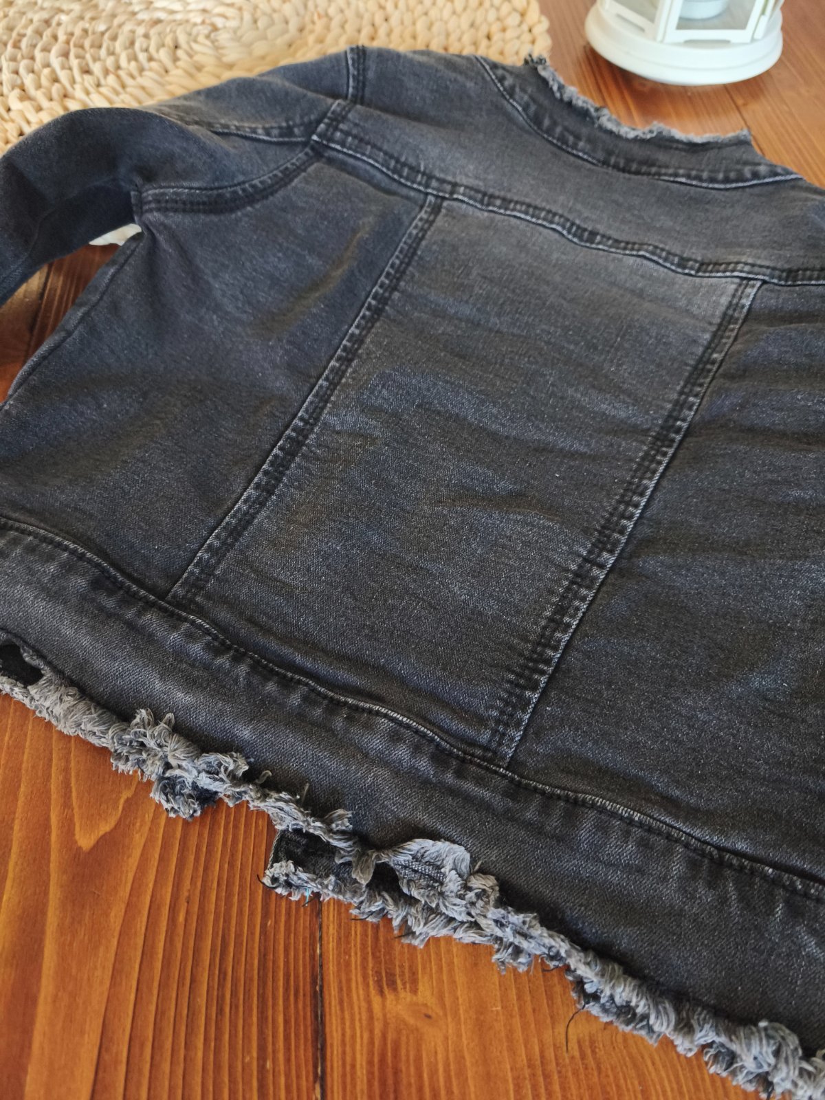 Krásna frajerska bundička tmavošedej farby. Rozmery uvedené na foto. SKôr pre chudšie dievčatko.