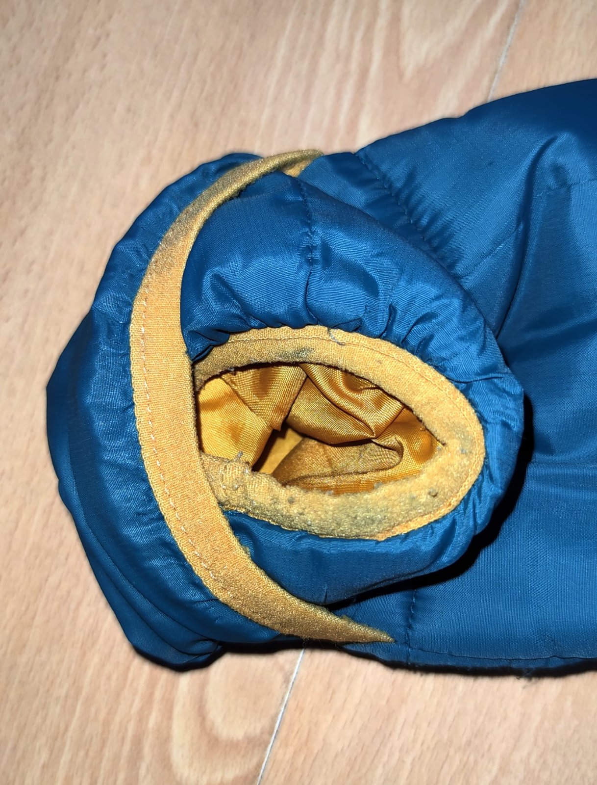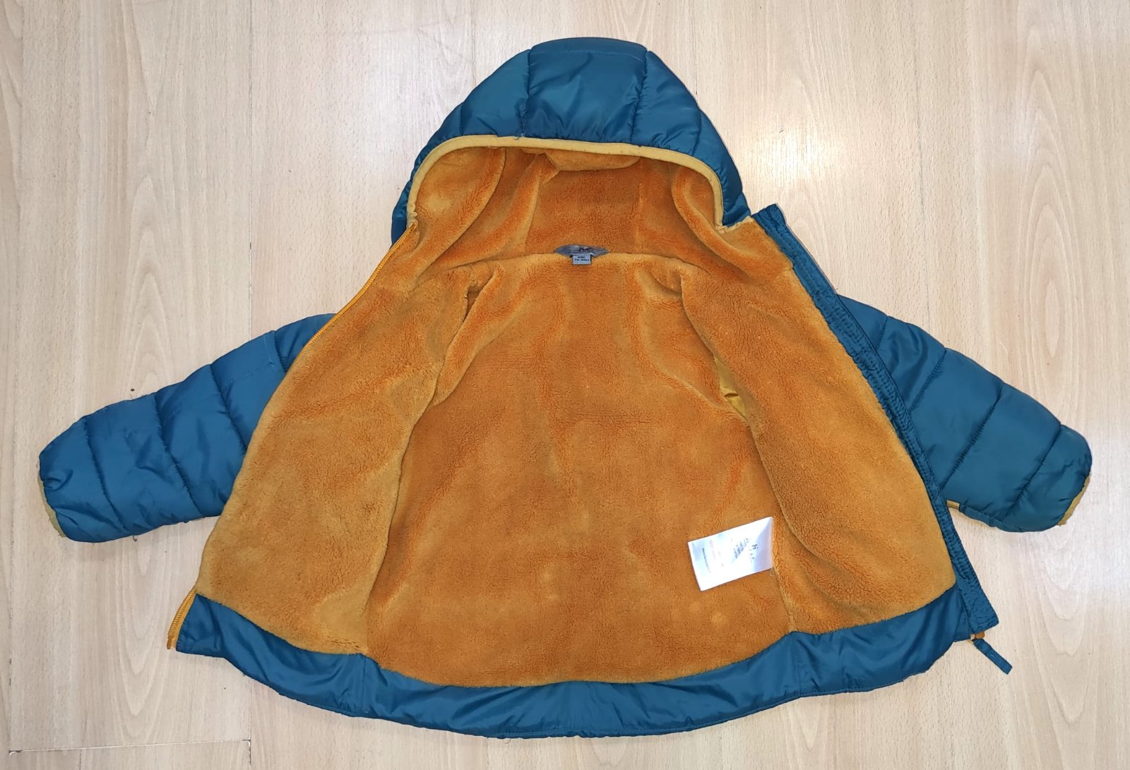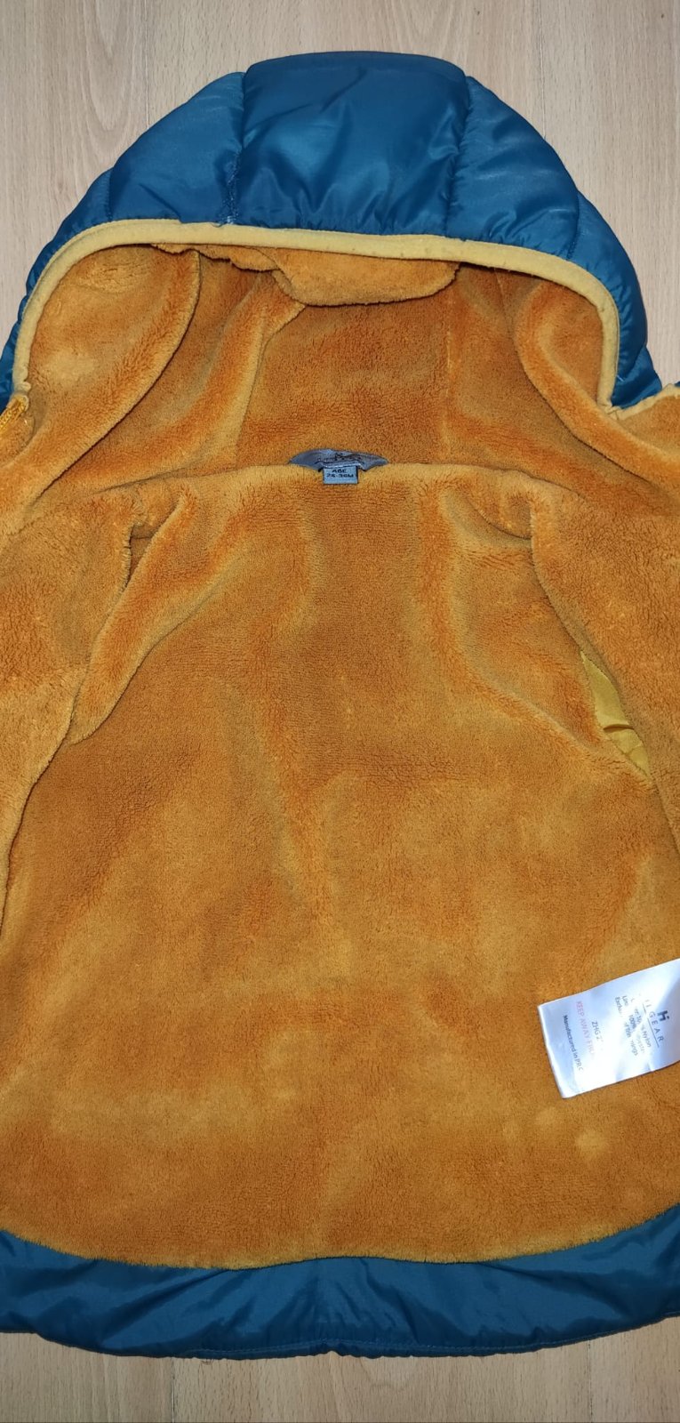 Ma kapucňu, je podsivana krasnou a teplou podšívkou horčicovej farby.