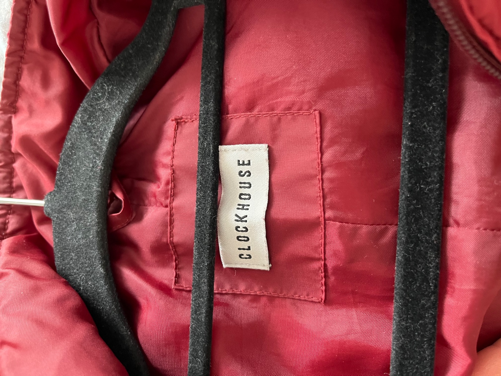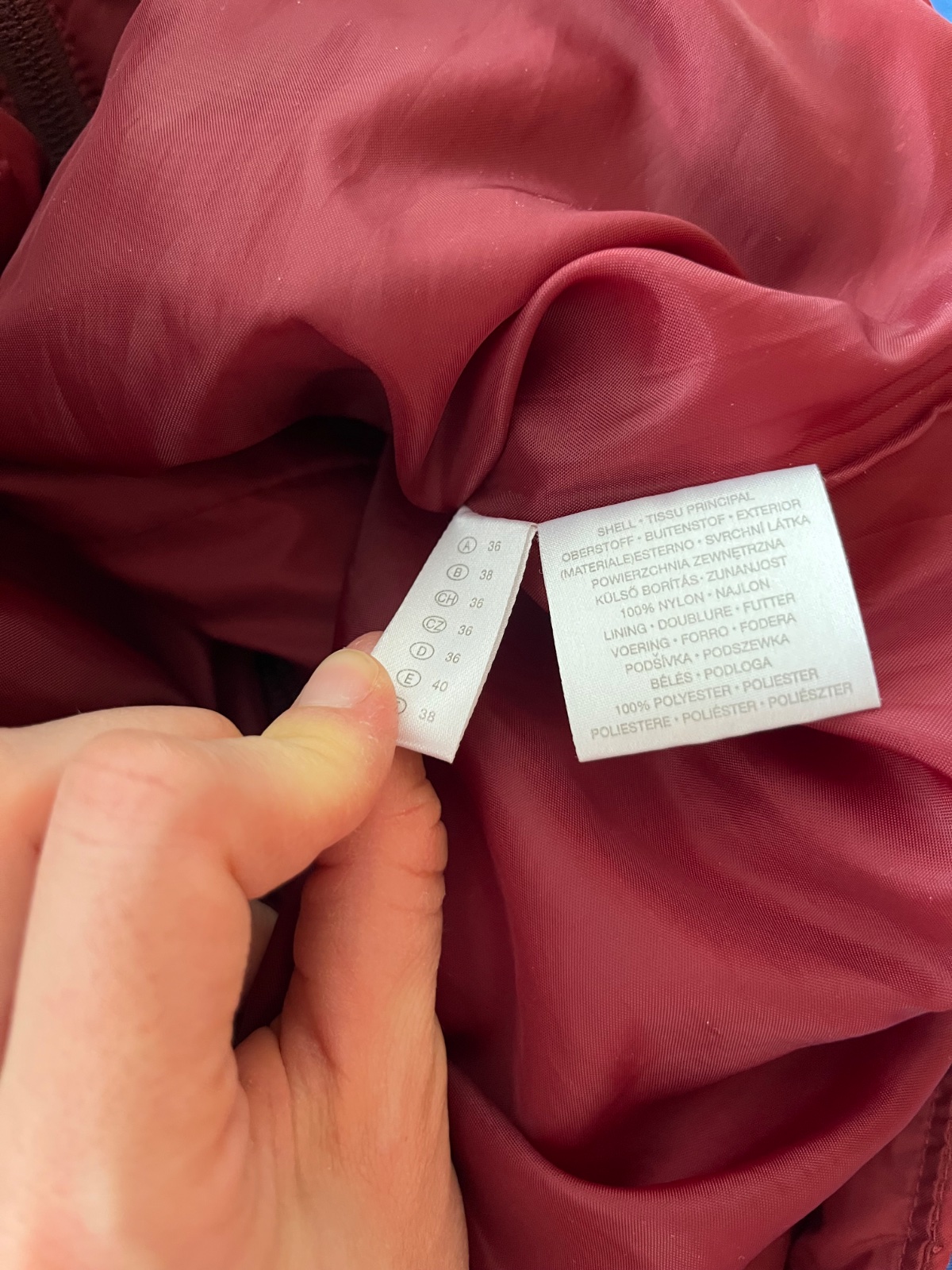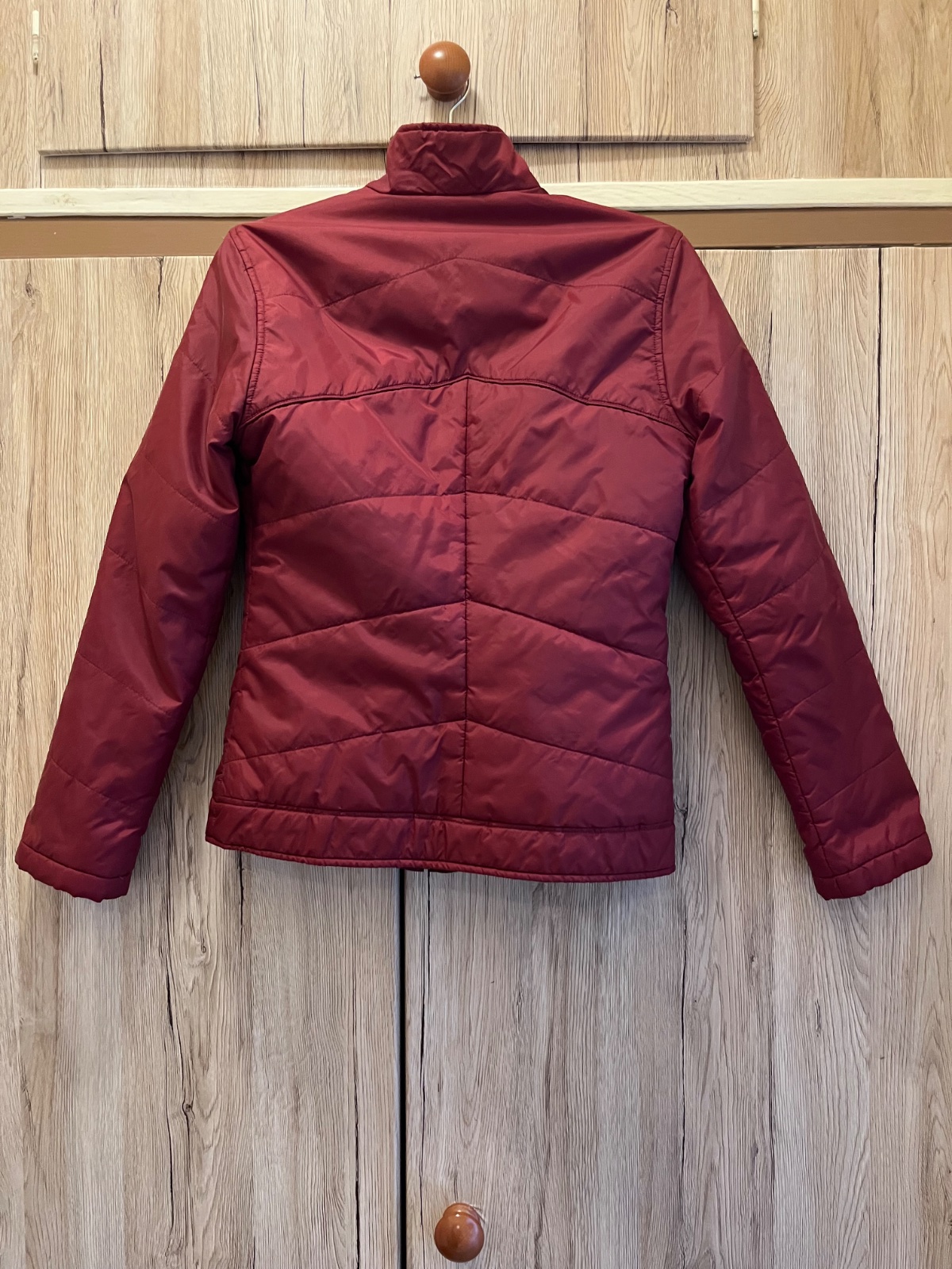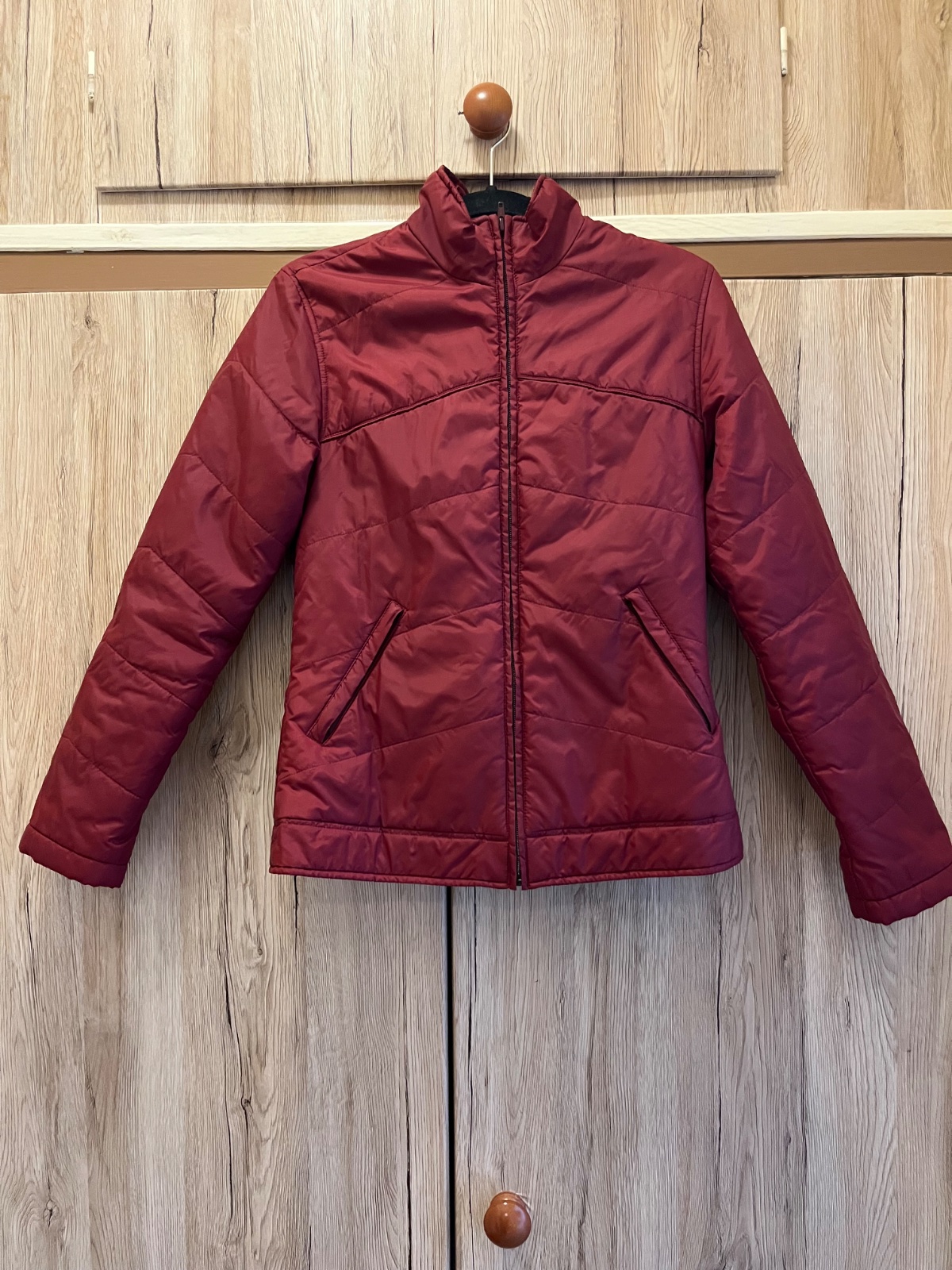 Ľahká bunda na prechodné obdobie červená taká dobordova/vínobočervena, s odleskom, šušťavá, bez zatepleného futra. Dve vrecká na zips zvonku a jedno na zips naprsne vnutri.
