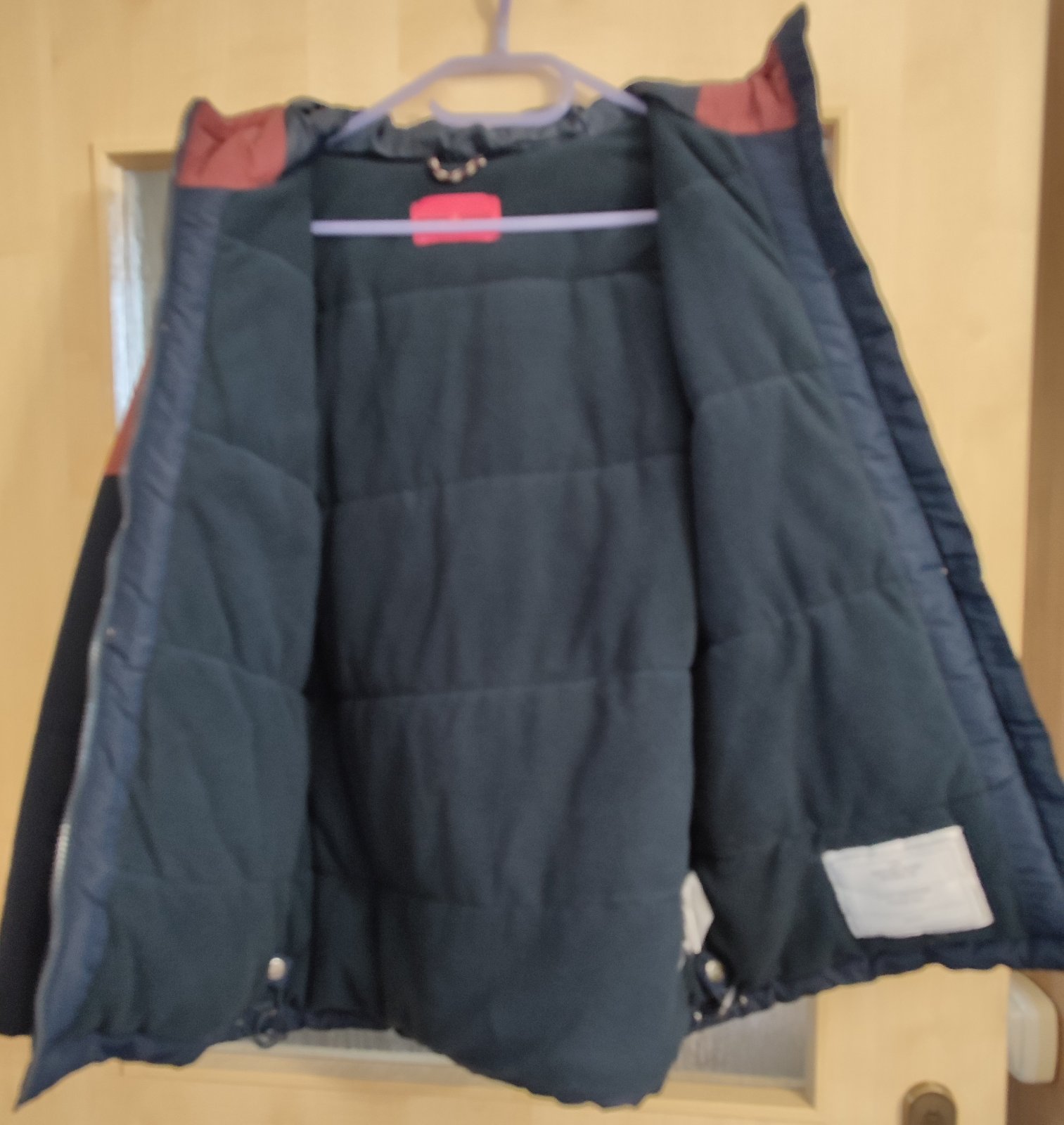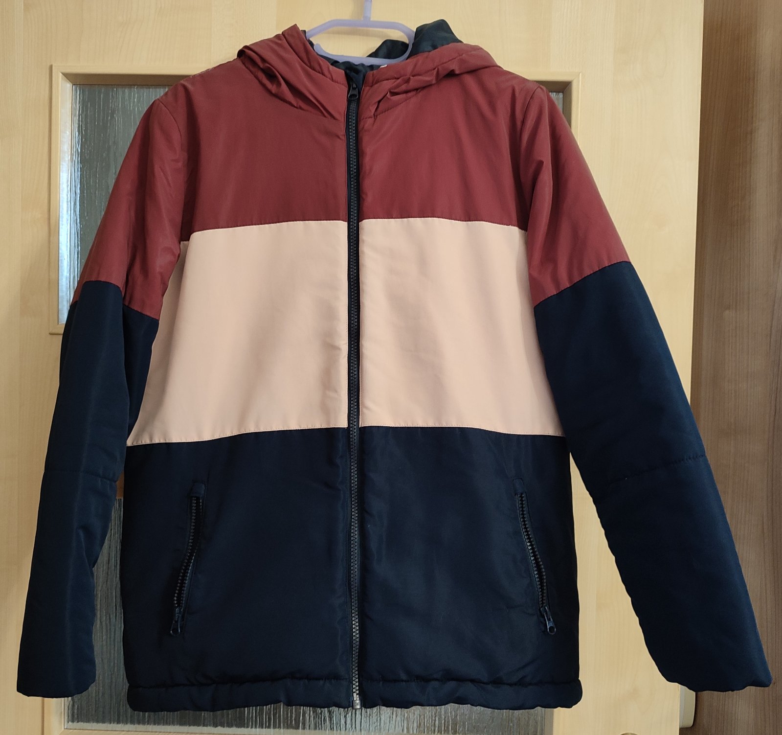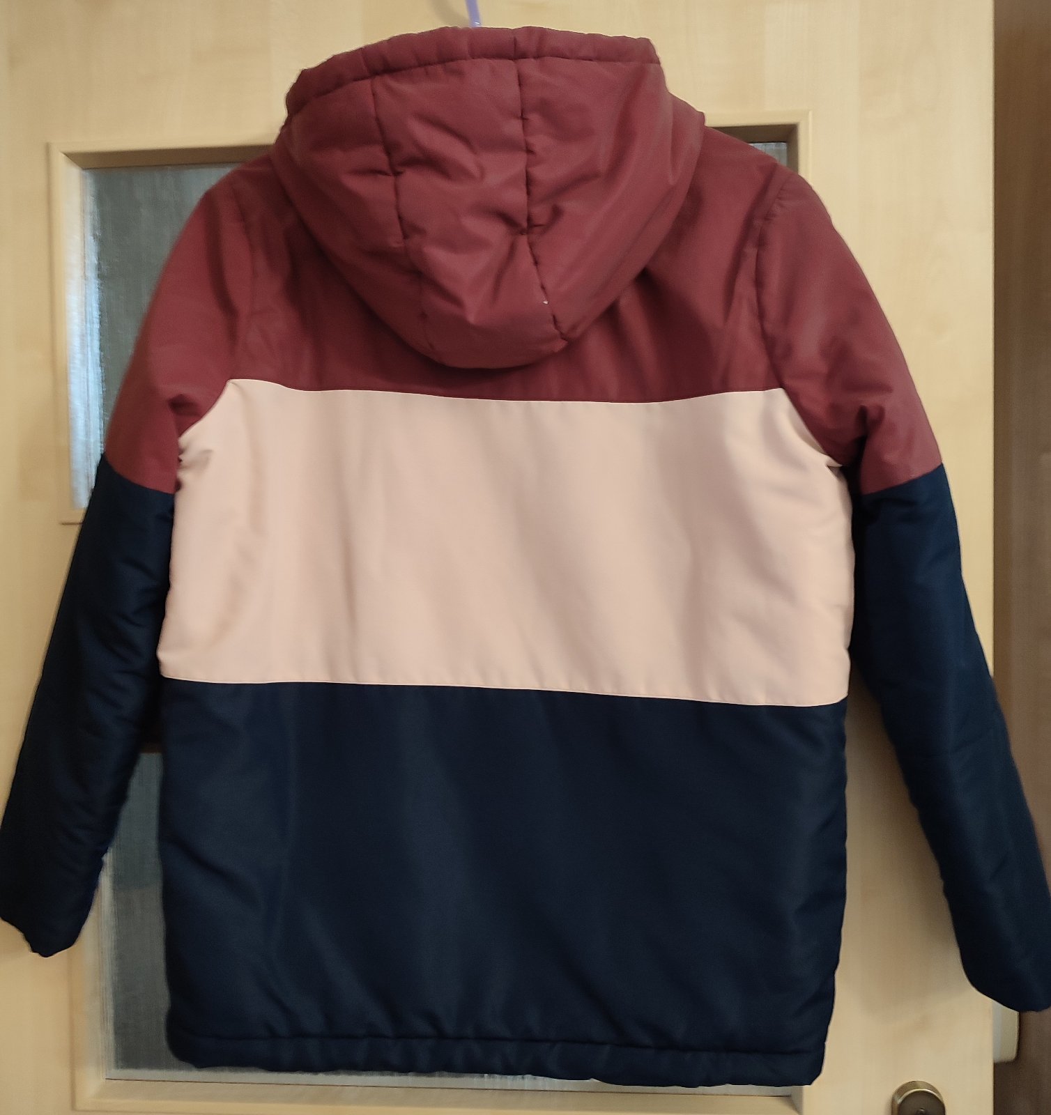 Teplá, vatovaná vetrovka na zimu. Závada - ošúchaná látka na kapucni a pleci /viz foto/, inak bez fľakov a žmolkov.